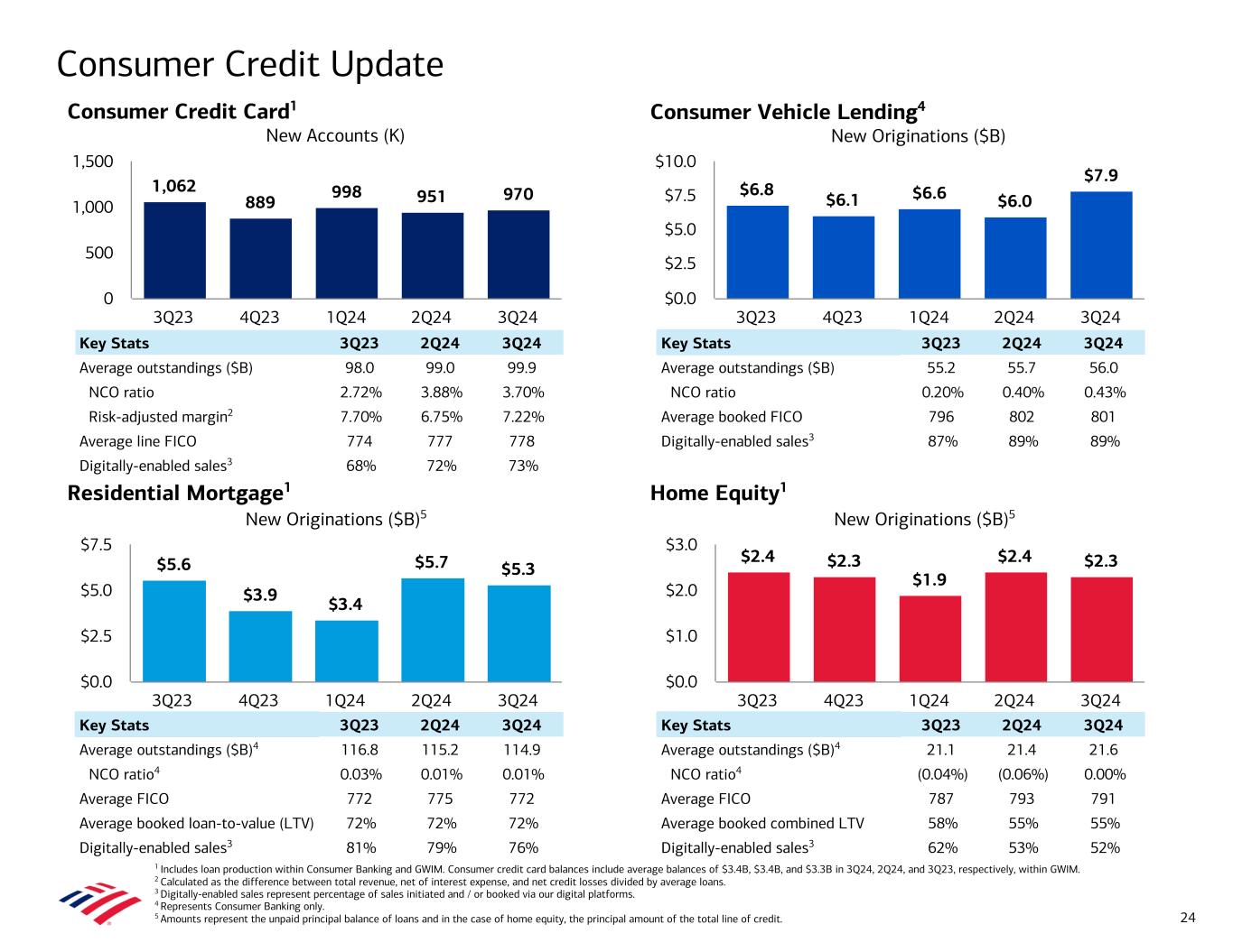 1,062 889 998 951 970 3Q23 4Q23 1Q24 2Q24 3Q24 0 500 1,000 1,500 Home Equity1 New Originations ($B)5 Consumer Credit Update 1 Includes loan production within Consumer Banking and GWIM. Consumer credit card balances include average balances of $3.4B, $3.4B, and $3.3B in 3Q24, 2Q24, and 3Q23, respectively, within GWIM. 2 Calculated as the difference between total revenue, net of interest expense, and net credit losses divided by average loans. 3 Digitally-enabled sales represent percentage of sales initiated and / or booked via our digital platforms. 4 Represents Consumer Banking only. 5 Amounts represent the unpaid principal balance of loans and in the case of home equity, the principal amount of the total line of credit. Consumer Vehicle Lending4 New Originations ($B) Consumer Credit Card1 New Accounts (K) 24 Residential Mortgage1 New Originations ($B)5 Key Stats 3Q23 2Q24 3Q24 Average outstandings ($B) 98.0 99.0 99.9 NCO ratio 2.72% 3.88% 3.70% Risk-adjusted margin2 7.70% 6.75% 7.22% Average line FICO 774 777 778 Digitally-enabled sales3 68% 72% 73% $6.8 $6.1 $6.6 $6.0 $7.9 3Q23 4Q23 1Q24 2Q24 3Q24 $0.0 $2.5 $5.0 $7.5 $10.0 Key Stats 3Q23 2Q24 3Q24 Average outstandings ($B) 55.2 55.7 56.0 NCO ratio 0.20% 0.40% 0.43% Average booked FICO 796 802 801 Digitally-enabled sales3 87% 89% 89% $5.6 $3.9 $3.4 $5.7 $5.3 3Q23 4Q23 1Q24 2Q24 3Q24 $0.0 $2.5 $5.0 $7.5 Key Stats 3Q23 2Q24 3Q24 Average outstandings ($B)4 116.8 115.2 114.9 NCO ratio4 0.03% 0.01% 0.01% Average FICO 772 775 772 Average booked loan-to-value (LTV) 72% 72% 72% Digitally-enabled sales3 81% 79% 76% $2.4 $2.3 $1.9 $2.4 $2.3 3Q23 4Q23 1Q24 2Q24 3Q24 $0.0 $1.0 $2.0 $3.0 Key Stats 3Q23 2Q24 3Q24 Average outstandings ($B)4 21.1 21.4 21.6 NCO ratio4 (0.04%) (0.06%) 0.00% Average FICO 787 793 791 Average booked combined LTV 58% 55% 55% Digitally-enabled sales3 62% 53% 52%