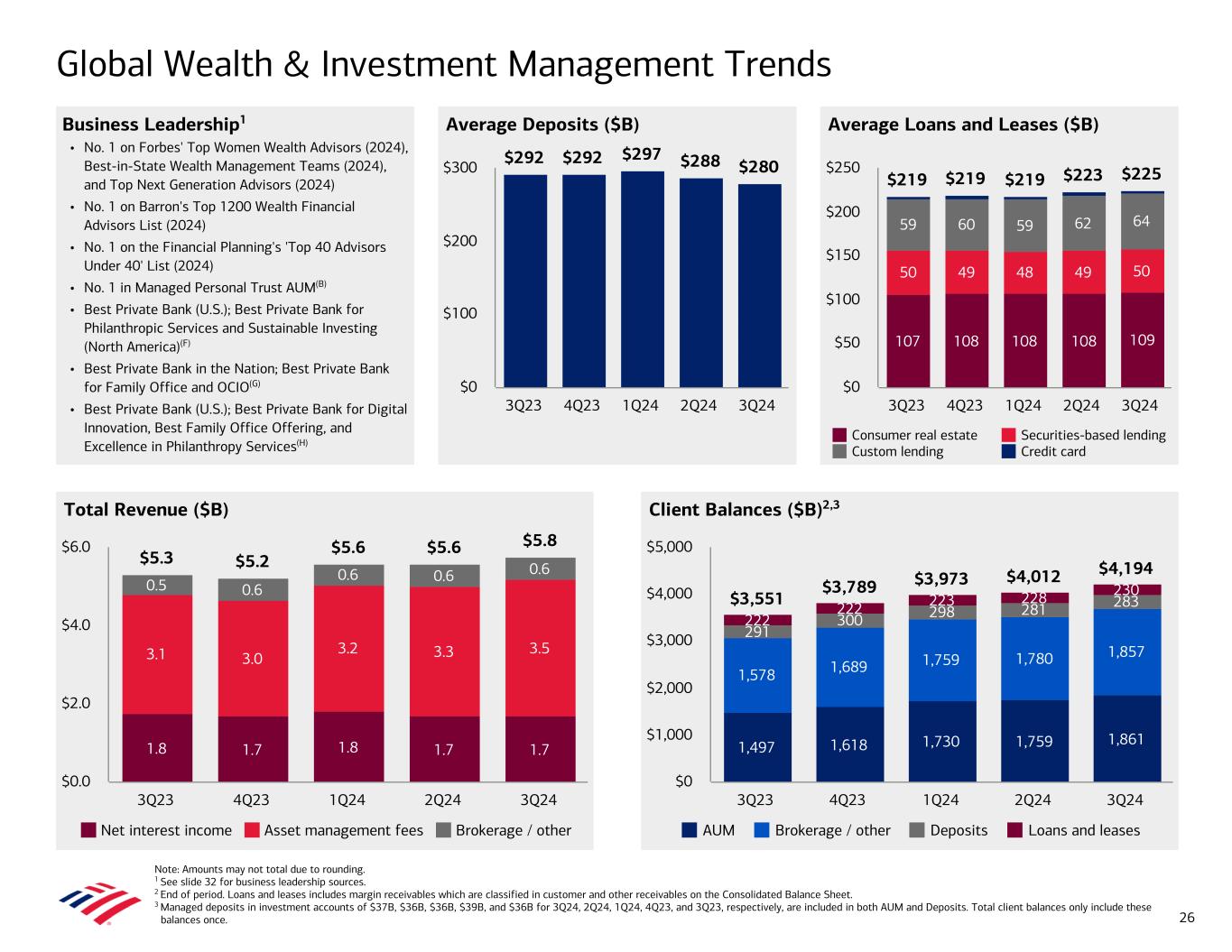 Note: Amounts may not total due to rounding. 1 See slide 32 for business leadership sources. 2 End of period. Loans and leases includes margin receivables which are classified in customer and other receivables on the Consolidated Balance Sheet. 3 Managed deposits in investment accounts of $37B, $36B, $36B, $39B, and $36B for 3Q24, 2Q24, 1Q24, 4Q23, and 3Q23, respectively, are included in both AUM and Deposits. Total client balances only include these balances once. Average Deposits ($B) Global Wealth & Investment Management Trends Business Leadership1 • No. 1 on Forbes' Top Women Wealth Advisors (2024), Best-in-State Wealth Management Teams (2024), and Top Next Generation Advisors (2024) • No. 1 on Barron's Top 1200 Wealth Financial Advisors List (2024) • No. 1 on the Financial Planning's 'Top 40 Advisors Under 40' List (2024) • No. 1 in Managed Personal Trust AUM(B) • Best Private Bank (U.S.); Best Private Bank for Philanthropic Services and Sustainable Investing (North America)(F) • Best Private Bank in the Nation; Best Private Bank for Family Office and OCIO(G) • Best Private Bank (U.S.); Best Private Bank for Digital Innovation, Best Family Office Offering, and Excellence in Philanthropy Services(H) Average Loans and Leases ($B) Total Revenue ($B) Client Balances ($B)2,3 $5.3 $5.2 $5.6 $5.6 $5.8 1.8 1.7 1.8 1.7 1.7 3.1 3.0 3.2 3.3 3.5 0.5 0.6 0.6 0.6 0.6 Net interest income Asset management fees Brokerage / other 3Q23 4Q23 1Q24 2Q24 3Q24 $0.0 $2.0 $4.0 $6.0 1,497 1,618 1,730 1,759 1,861 1,578 1,689 1,759 1,780 1,857 291 300 298 281 283 222 222 223 228 230$3,551 $3,789 $3,973 $4,012 $4,194 AUM Brokerage / other Deposits Loans and leases 3Q23 4Q23 1Q24 2Q24 3Q24 $0 $1,000 $2,000 $3,000 $4,000 $5,000 $219 $219 $219 $223 $225 107 108 108 108 109 50 49 48 49 50 59 60 59 62 64 Consumer real estate Securities-based lending Custom lending Credit card 3Q23 4Q23 1Q24 2Q24 3Q24 $0 $50 $100 $150 $200 $250 $292 $292 $297 $288 $280 3Q23 4Q23 1Q24 2Q24 3Q24 $0 $100 $200 $300 26