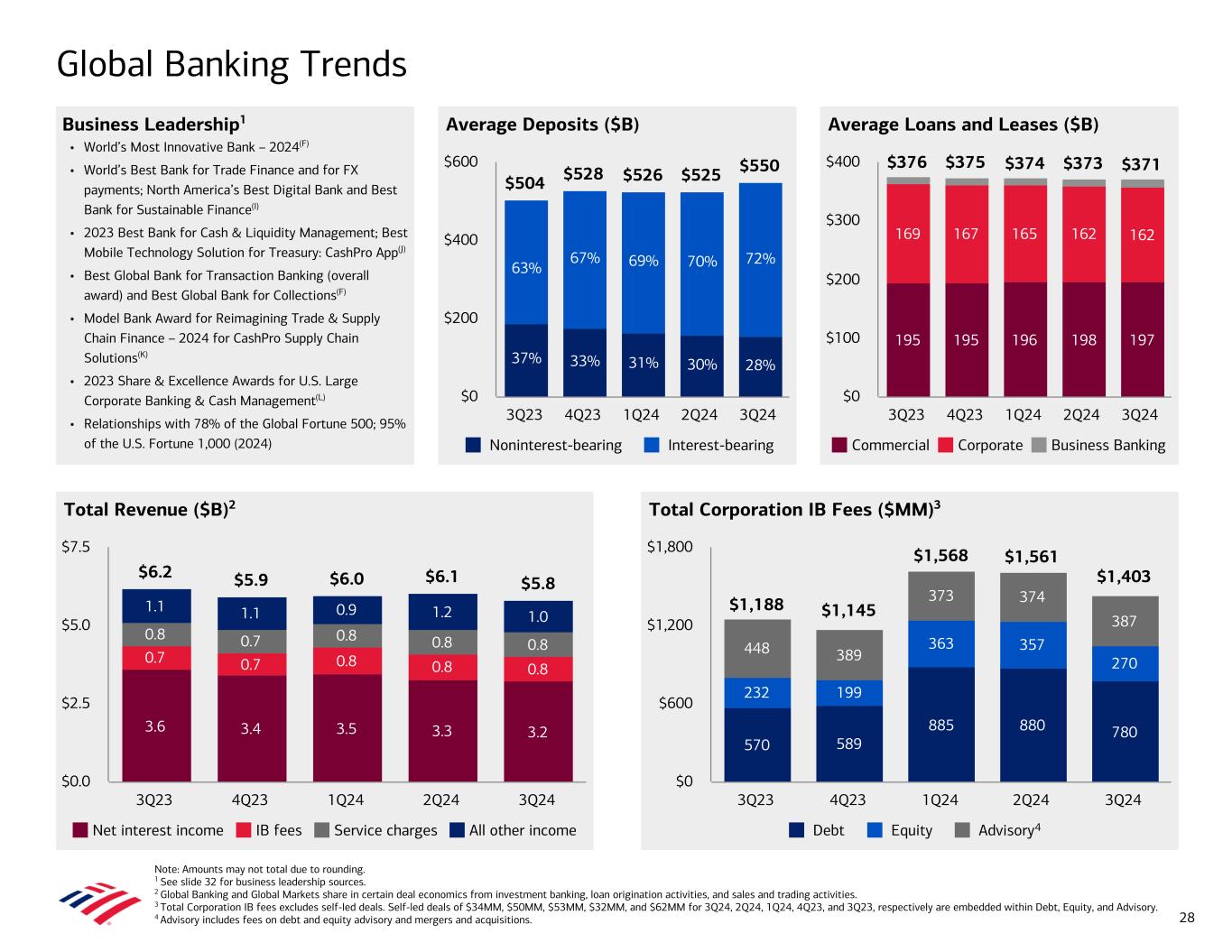 Global Banking Trends Note: Amounts may not total due to rounding. 1 See slide 32 for business leadership sources. 2 Global Banking and Global Markets share in certain deal economics from investment banking, loan origination activities, and sales and trading activities. 3 Total Corporation IB fees excludes self-led deals. Self-led deals of $34MM, $50MM, $53MM, $32MM, and $62MM for 3Q24, 2Q24, 1Q24, 4Q23, and 3Q23, respectively are embedded within Debt, Equity, and Advisory. 4 Advisory includes fees on debt and equity advisory and mergers and acquisitions. Average Deposits ($B)Business Leadership1 • World’s Most Innovative Bank – 2024(F) • World’s Best Bank for Trade Finance and for FX payments; North America’s Best Digital Bank and Best Bank for Sustainable Finance(I) • 2023 Best Bank for Cash & Liquidity Management; Best Mobile Technology Solution for Treasury: CashPro App(J) • Best Global Bank for Transaction Banking (overall award) and Best Global Bank for Collections(F) • Model Bank Award for Reimagining Trade & Supply Chain Finance – 2024 for CashPro Supply Chain Solutions(K) • 2023 Share & Excellence Awards for U.S. Large Corporate Banking & Cash Management(L) • Relationships with 78% of the Global Fortune 500; 95% of the U.S. Fortune 1,000 (2024) Average Loans and Leases ($B) Total Revenue ($B)2 Total Corporation IB Fees ($MM)3 $6.2 $5.9 $6.0 $6.1 $5.8 3.6 3.4 3.5 3.3 3.2 0.7 0.7 0.8 0.8 0.8 0.8 0.7 0.8 0.8 0.8 1.1 1.1 0.9 1.2 1.0 Net interest income IB fees Service charges All other income 3Q23 4Q23 1Q24 2Q24 3Q24 $0.0 $2.5 $5.0 $7.5 570 589 885 880 780 232 199 363 357 270 448 389 373 374 387 $1,188 $1,145 $1,568 $1,561 $1,403 Debt Equity Advisory 3Q23 4Q23 1Q24 2Q24 3Q24 $0 $600 $1,200 $1,800 195 195 196 198 197 169 167 165 162 162 $376 $375 $374 $373 $371 Commercial Corporate Business Banking 3Q23 4Q23 1Q24 2Q24 3Q24 $0 $100 $200 $300 $400 4 $504 $528 $526 $525 $550 Noninterest-bearing Interest-bearing 3Q23 4Q23 1Q24 2Q24 3Q24 $0 $200 $400 $600 28 37% 33% 31% 30% 28% 63% 67% 69% 70% 72%