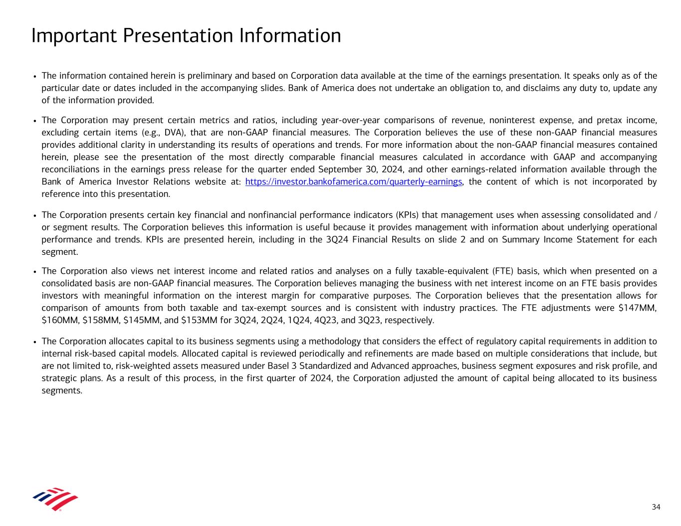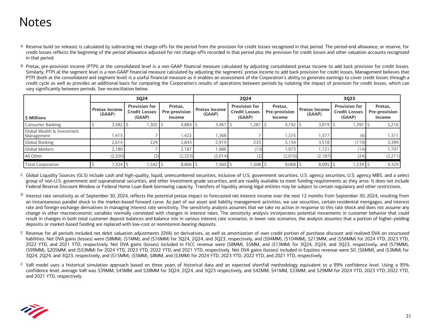 A Reserve build (or release) is calculated by subtracting net charge-offs for the period from the provision for credit losses recognized in that period. The period-end allowance, or reserve, for credit losses reflects the beginning of the period allowance adjusted for net charge-offs recorded in that period plus the provision for credit losses and other valuation accounts recognized in that period. B Pretax, pre-provision income (PTPI) at the consolidated level is a non-GAAP financial measure calculated by adjusting consolidated pretax income to add back provision for credit losses. Similarly, PTPI at the segment level is a non-GAAP financial measure calculated by adjusting the segments’ pretax income to add back provision for credit losses. Management believes that PTPI (both at the consolidated and segment level) is a useful financial measure as it enables an assessment of the Corporation’s ability to generate earnings to cover credit losses through a credit cycle as well as provides an additional basis for comparing the Corporation's results of operations between periods by isolating the impact of provision for credit losses, which can vary significantly between periods. See reconciliation below. C Global Liquidity Sources (GLS) include cash and high-quality, liquid, unencumbered securities, inclusive of U.S. government securities, U.S. agency securities, U.S. agency MBS, and a select group of non-U.S. government and supranational securities, and other investment-grade securities, and are readily available to meet funding requirements as they arise. It does not include Federal Reserve Discount Window or Federal Home Loan Bank borrowing capacity. Transfers of liquidity among legal entities may be subject to certain regulatory and other restrictions. D Interest rate sensitivity as of September 30, 2024, reflects the potential pretax impact to forecasted net interest income over the next 12 months from September 30, 2024, resulting from an instantaneous parallel shock to the market-based forward curve. As part of our asset and liability management activities, we use securities, certain residential mortgages, and interest rate and foreign exchange derivatives in managing interest rate sensitivity. The sensitivity analysis assumes that we take no action in response to this rate shock and does not assume any change in other macroeconomic variables normally correlated with changes in interest rates. The sensitivity analysis incorporates potential movements in customer behavior that could result in changes in both total customer deposit balances and balance mix in various interest rate scenarios. In lower rate scenarios, the analysis assumes that a portion of higher-yielding deposits or market-based funding are replaced with low-cost or noninterest-bearing deposits. E Revenue for all periods included net debit valuation adjustments (DVA) on derivatives, as well as amortization of own credit portion of purchase discount and realized DVA on structured liabilities. Net DVA gains (losses) were ($8MM), ($1MM), and ($16MM) for 3Q24, 2Q24, and 3Q23, respectively, and ($94MM), ($104MM), $213MM, and ($56MM) for 2024 YTD, 2023 YTD, 2022 YTD, and 2021 YTD, respectively. Net DVA gains (losses) included in FICC revenue were ($8MM), $5MM, and ($13MM) for 3Q24, 2Q24, and 3Q23, respectively, and ($79MM), ($99MM), $205MM, and ($53MM) for 2024 YTD, 2023 YTD, 2022 YTD, and 2021 YTD, respectively. Net DVA gains (losses) included in Equities revenue were $0, ($6MM), and ($3MM) for 3Q24, 2Q24, and 3Q23, respectively, and ($15MM), ($5MM), $8MM, and ($3MM) for 2024 YTD, 2023 YTD, 2022 YTD, and 2021 YTD, respectively. F VaR model uses a historical simulation approach based on three years of historical data and an expected shortfall methodology equivalent to a 99% confidence level. Using a 95% confidence level, average VaR was $39MM, $45MM, and $38MM for 3Q24, 2Q24, and 3Q23 respectively, and $42MM, $41MM, $33MM, and $29MM for 2024 YTD, 2023 YTD, 2022 YTD, and 2021 YTD, respectively. Notes $ Millions 3Q24 2Q24 3Q23 Pretax Income (GAAP) Provision for Credit Losses (GAAP) Pretax, Pre-provision Income Pretax Income (GAAP) Provision for Credit Losses (GAAP) Pretax, Pre-provision Income Pretax Income (GAAP) Provision for Credit Losses (GAAP) Pretax, Pre-provision Income Consumer Banking $ 3,582 $ 1,302 $ 4,884 $ 3,461 $ 1,281 $ 4,742 $ 3,819 $ 1,397 $ 5,216 Global Wealth & Investment Management 1,415 7 1,422 1,368 7 1,375 1,377 (6) 1,371 Global Banking 2,614 229 2,843 2,919 235 3,154 3,518 (119) 3,399 Global Markets 2,180 7 2,187 1,986 (13) 1,973 1,721 (14) 1,707 All Other (2,320) (3) (2,323) (2,014) (2) (2,016) (2,187) (24) (2,211) Total Corporation $ 7,324 $ 1,542 $ 8,866 $ 7,560 $ 1,508 $ 9,068 $ 8,095 $ 1,234 $ 9,329 31