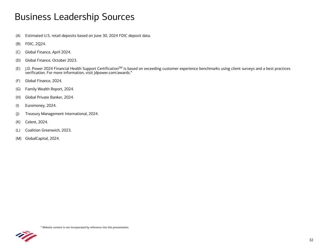 Business Leadership Sources (A) Estimated U.S. retail deposits based on June 30, 2024 FDIC deposit data. (B) FDIC, 2Q24. (C) Global Finance, April 2024. (D) Global Finance, October 2023. (E) J.D. Power 2024 Financial Health Support CertificationSM is based on exceeding customer experience benchmarks using client surveys and a best practices verification. For more information, visit jdpower.com/awards.* (F) Global Finance, 2024. (G) Family Wealth Report, 2024. (H) Global Private Banker, 2024. (I) Euromoney, 2024. (J) Treasury Management International, 2024. (K) Celent, 2024. (L) Coalition Greenwich, 2023. (M) GlobalCapital, 2024. 32 * Website content is not incorporated by reference into this presentation.