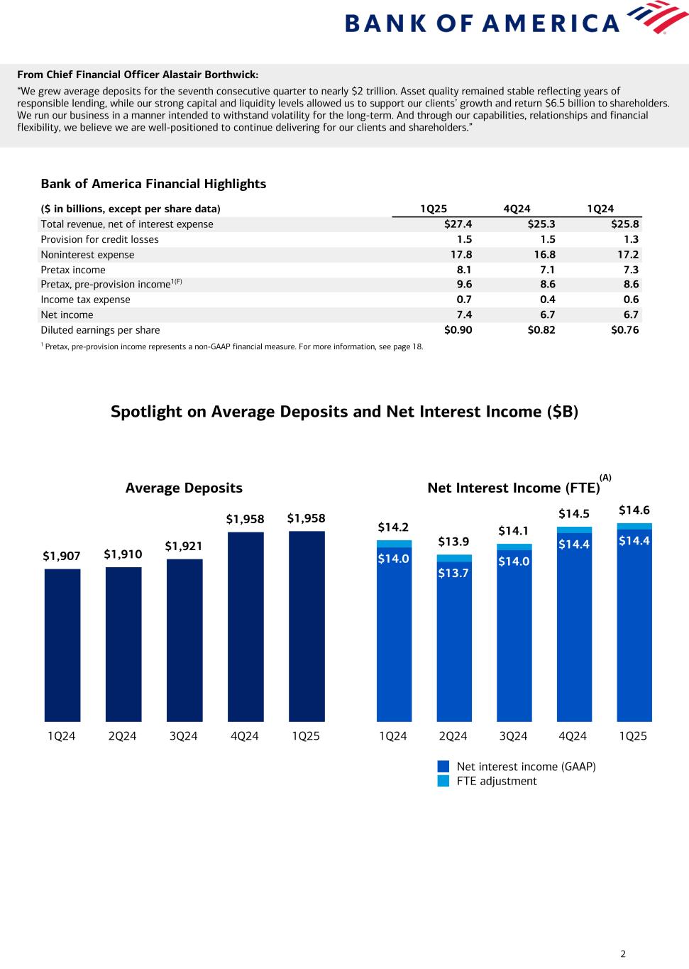 1 1Q25 Financial Highlights2(B) 1Q25 Business Segment Highlights1,2,3(B) Consumer Banking • Net income of $2.5 billion • Revenue of $10.5 billion, up 3% • Average deposits of $948 billion, down 1%; up 32% from pre- pandemic levels (4Q19) • Average loans and leases of $315 billion, up $2 billion, or 1% • Combined credit / debit card spend of $228 billion, up 4% • Client Activity – ~250,000 net new consumer checking accounts; 25th consecutive quarter of growth – 38 million consumer checking accounts; 92% are primary4 – 3.9 million small business checking accounts – $498 billion in consumer investment assets, up 9%5 – $1.1 trillion in payments, up 4%6 – 4.0 billion digital logins; 65% of total sales were digitally-enabled Global Wealth and Investment Management • Net income of $1.0 billion • Revenue of $6.0 billion, up 8%, driven by a 15% increase in asset management fees from strong AUM flows and higher market levels • Client balances of $4.2 trillion, up 5% from 1Q24, driven by positive net client flows and higher market valuations • Client Activity – ~7,200 net new relationships across Merrill and Private Bank – $1.9 trillion of AUM balances, up 7% – 87% of Merrill and Private Bank clients digitally active Global Banking • Net income of $1.9 billion • Total Corporation investment banking fees (excl. self-led) of $1.5 billion, down 3% • #3 investment banking fee ranking; 23 bps gain in market share7 • $575 billion in average deposits, up 9% • 6% growth in Middle Market average loan balances9 • 14% improvement in treasury service charges Global Markets • Net income of $1.9 billion • Sales and trading revenue up 11% to $5.7 billion including net debit valuation adjustment (DVA) gains of $19 million. Excluding net DVA, up 9%.(E) 12th consecutive quarter of year-over-year growth – Fixed Income, Currencies and Commodities (FICC) revenue up 8% to $3.5 billion. Excluding net DVA, up 5%(E) – Equities revenue reached new record of $2.2 billion, up 17% including and excluding net DVA(E) Bank of America Reports 1Q25 Net Income of $7.4 Billion and EPS of $0.90 Revenue Up 6% YoY to $27.4 Billion,1 Net Interest Income Reached $14.4 Billion ($14.6 Billion FTE)(A) Balance Sheet Remained Strong With Approximately $2 Trillion in Ending Deposits From Chair and CEO Brian Moynihan: “We had a good first quarter, with earnings per share of $0.90 up from $0.76 last year. This reflected growth in net interest income and fee income, while sales and trading delivered its 12th consecutive quarter of year-over-year revenue growth. Our business clients have been performing well; and consumers have shown resilience, continuing to spend and maintaining healthy credit quality. Though we potentially face a changing economy in the future, we believe the disciplined investments we have made for high-quality growth, our diverse set of businesses, and the team’s relentless focus on Responsible Growth will remain a source of strength.” See page 10 for endnotes. Amounts may not total due to rounding. 1 Revenue, net of interest expense. 2 Financial Highlights and Business Segment Highlights are compared to the year-ago quarter unless noted. 3 The Corporation reports the results of operations of its four business segments and All Other on a fully taxable-equivalent (FTE) basis. 4 Represents the percentage of consumer checking accounts that are estimated to be the customer’s primary account based on multiple relationship factors (e.g., linked to their direct deposit). 5 End of period. Consumer investment assets include client brokerage assets, deposit sweep balances, Bank of America, N.A. brokered CDs, and AUM in Consumer Banking. 6 Total payments represent payments made from Bank of America accounts using credit card, debit card, ACH, wires, billpay, person-to-person, cash and checks. 7 Source: Dealogic as of March 31, 2025. 8 Tangible book value per common share and return on average tangible common shareholders’ equity ratio represent non-GAAP financial measures. For more information, see page 18. 9 Includes loans to Global Commercial Banking clients, excluding commercial real estate and specialized industries. • Net income of $7.4 billion, or $0.90 per diluted share, compared to $6.7 billion, or $0.76 per diluted share • Revenue, net of interest expense, of $27.4 billion ($27.5 billion FTE),(A) up 6%, driven by noninterest income growth across all segments and higher net interest income (NII) – NII of $14.4 billion ($14.6 billion FTE),(A) up 3% from 1Q24 and 1% from 4Q24 ▪ The year-over-year increase reflected the benefits of several factors, including lower deposit costs, higher NII related to Global Markets activity and fixed-rate asset repricing, partially offset by the impacts of lower interest rates and one less day of interest accrual ▪ The linked-quarter increase reflected the benefits of several factors, including lower deposit costs, higher NII related to Global Markets activity and fixed-rate asset repricing, partially offset by the impacts of lower interest rates and two fewer days of interest accrual • Provision for credit losses of $1.5 billion increased from $1.3 billion in 1Q24 and was flat from 4Q24 – Net charge-offs of $1.5 billion were flat to 1Q24 and 4Q24 • Noninterest expense of $17.8 billion, up 3%, driven primarily by higher revenue-related expenses and investments in people, technology, operations and brand, partially offset by the absence of the $0.7 billion 1Q24 FDIC special assessment expense • Balance Sheet Remained Strong – Average deposit balances of $1.96 trillion increased 3%, seven consecutive quarters of growth – Average loans and leases of $1.09 trillion increased 4% – Average Global Liquidity Sources of $942 billion(C) – Common equity tier 1 (CET1) capital of $201 billion was flat from 4Q24 – CET1 ratio of 11.8% (Standardized);(D) well above regulatory minimum of 10.7% – Returned $6.5 billion to