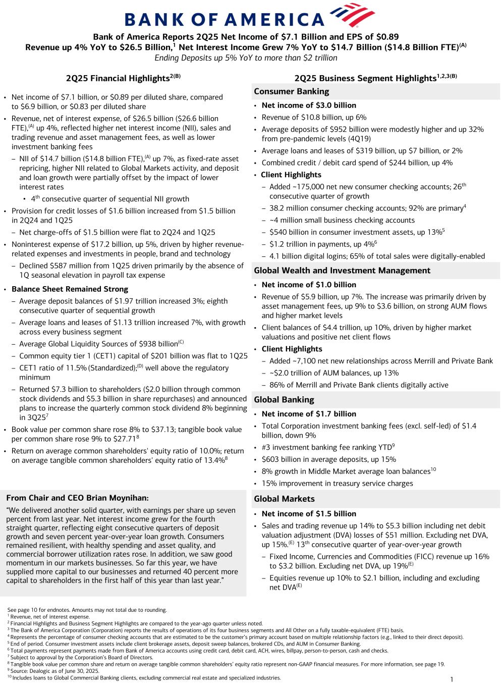 1 2Q25 Financial Highlights2(B) 2Q25 Business Segment Highlights1,2,3(B) Consumer Banking • Net income of $3.0 billion • Revenue of $10.8 billion, up 6% • Average deposits of $952 billion were modestly higher and up 32% from pre-pandemic levels (4Q19) • Average loans and leases of $319 billion, up $7 billion, or 2% • Combined credit / debit card spend of $244 billion, up 4% • Client Highlights – Added ~175,000 net new consumer checking accounts; 26th consecutive quarter of growth – 38.2 million consumer checking accounts; 92% are primary4 – ~4 million small business checking accounts – $540 billion in consumer investment assets, up 13%5 – $1.2 trillion in payments, up 4%6 – 4.1 billion digital logins; 65% of total sales were digitally-enabled Global Wealth and Investment Management • Net income of $1.0 billion • Revenue of $5.9 billion, up 7%. The increase was primarily driven by asset management fees, up 9% to $3.6 billion, on strong AUM flows and higher market levels • Client balances of $4.4 trillion, up 10%, driven by higher market valuations and positive net client flows • Client Highlights – Added ~7,100 net new relationships across Merrill and Private Bank – ~$2.0 trillion of AUM balances, up 13% – 86% of Merrill and Private Bank clients digitally active Global Banking • Net income of $1.7 billion • Total Corporation investment banking fees (excl. self-led) of $1.4 billion, down 9% • #3 investment banking fee ranking YTD9 • $603 billion in average deposits, up 15% • 8% growth in Middle Market average loan balances10 • 15% improvement in treasury service charges Global Markets • Net income of $1.5 billion • Sales and trading revenue up 14% to $5.3 billion including net debit valuation adjustment (DVA) losses of $51 million. Excluding net DVA, up 15%.(E) 13th consecutive quarter of year-over-year growth – Fixed Income, Currencies and Commodities (FICC) revenue up 16% to $3.2 billion. Excluding net DVA, up 19%(E) – Equities revenue up 10% to $2.1 billion, including and excluding net DVA(E) Bank of America Reports 2Q25 Net Income of $7.1 Billion and EPS of $0.89 Revenue up 4% YoY to $26.5 Billion,1 Net Interest Income Grew 7% YoY to $14.7 Billion ($14.8 Billion FTE)(A) Ending Deposits up 5% YoY to more than $2 trillion From Chair and CEO Brian Moynihan: “We delivered another solid quarter, with earnings per share up seven percent from last year. Net interest income grew for the fourth straight quarter, reflecting eight consecutive quarters of deposit growth and seven percent year-over-year loan growth. Consumers remained resilient, with healthy spending and asset quality, and commercial borrower utilization rates rose. In addition, we saw good momentum in our markets businesses. So far this year, we have supplied more capital to our businesses and returned 40 percent more capital to shareholders in the first half of this year than last year.” See page 10 for endnotes. Amounts may not total due to rounding. 1 Revenue, net of interest expense. 2 Financial Highlights and Business Segment Highlights are compared to the year-ago quarter unless noted. 3 The Bank of America Corporation (Corporation) reports the results of operations of its four business segments and All Other on a fully taxable-equivalent (FTE) basis. 4 Represents the percentage of consumer checking accounts that are estimated to be the customer’s primary account based on multiple relationship factors (e.g., linked to their direct deposit). 5 End of period. Consumer investment assets include client brokerage assets, deposit sweep balances, brokered CDs, and AUM in Consumer Banking. 6 Total payments represent payments made from Bank of America accounts using credit card, debit card, ACH, wires, billpay, person-to-person, cash and checks. 7 Subject to approval by the Corporation’s Board of Directors. 8 Tangible book value per common share and return on average tangible common shareholders’ equity ratio represent non-GAAP financial measures. For more information, see page 19. 9 Source: Dealogic as of June 30, 2025. 10 Includes loans to Global Commercial Banking clients, excluding commercial real estate and specialized industries. • Net income of $7.1 billion, or $0.89 per diluted share, compared to $6.9 billion, or $0.83 per diluted share • Revenue, net of interest expense, of $26.5 billion ($26.6 billion FTE),(A) up 4%, reflected higher net interest income (NII), sales and trading revenue and asset management fees, as well as lower investment banking fees – NII of $14.7 billion ($14.8 billion FTE),(A) up 7%, as fixed-rate asset repricing, higher NII related to Global Markets activity, and deposit and loan growth were partially offset by the impact of lower interest rates ▪ 4th consecutive quarter of sequential NII growth • Provision for credit losses of $1.6 billion increased from $1.5 billion in 2Q24 and 1Q25 – Net charge-offs of $1.5 billion were flat to 2Q24 and 1Q25 • Noninterest expense of $17.2 billion, up 5%, driven by higher revenue- related expenses and investments in people, brand and technology – Declined $587 million from 1Q25 driven primarily by the absence of 1Q seasonal elevation in payroll tax expense • Balance Sheet Remained Strong – Average deposit balances of $1.97 trillion increased 3%; eighth consecutive quarter of sequential growth – Average loans and leases of $1.13 trillion increased 7%, with growth across every business segment – Average Global Liquidity Sources of $938 billion(C) – Common equity tier 1 (CET1) capital of $201 billion was flat to 1Q25 – CET1 ratio of 11.5% (Standardized);(D) well above the regulatory minimum – Returned $7.3 billion to shareholders ($2.0 billion through common stock dividends and $5.3 billion in share repurchases) and announced plans to increase the quarterly common stock dividend 8% beginning in 3Q257 • Book value per common share rose 8% to $37.13; tangible book value pe