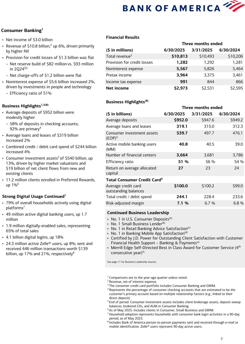 2 From Chief Financial Officer Alastair Borthwick: “We believe our second quarter results underscore the strength of our balance sheet and help demonstrate that we are well-positioned to support the broader economy. Asset quality remained strong, with net charge-offs at $1.5 billion for the sixth consecutive quarter. Consumer delinquencies have been stabilizing, while card net charge-offs improved year-over-year and commercial nonperforming loans declined sequentially. In addition, we delivered strong loan and deposit growth and maintained our disciplined pricing.” Bank of America Financial Highlights ($ in billions, except per share data) 2Q25 1Q25 2Q24 Total revenue, net of interest expense $26.5 $27.4 $25.4 Provision for credit losses 1.6 1.5 1.5 Noninterest expense 17.2 17.8 16.3 Pretax income 7.7 8.1 7.6 Pretax, pre-provision income1(F) 9.3 9.6 9.1 Income tax expense 0.6 0.7 0.7 Net income 7.1 7.4 6.9 Diluted earnings per share $0.89 $0.90 $0.83 1 Pretax, pre-provision income represents a non-GAAP financial measure. For more information, see page 19. Net Interest Income (FTE) $13.9 $14.1 $14.5 $14.6 $14.8 $13.7 $14.0 $14.4 $14.4 $14.7 Net interest income (GAAP) FTE adjustment 2Q24 3Q24 4Q24 1Q25 2Q25 Average Deposits $1,910 $1,921 $1,958 $1,958 $1,974 2Q24 3Q24 4Q24 1Q25 2Q25 Spotlight on Average Deposits and Net Interest Income ($B) (A)