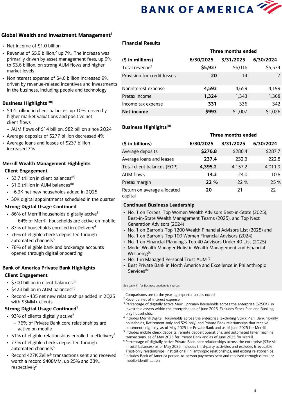 3 Consumer Banking1 Financial Results Three months ended ($ in millions) 6/30/2025 3/31/2025 6/30/2024 Total revenue2 $10,813 $10,493 $10,206 Provision for credit losses 1,282 1,292 1,281 Noninterest expense 5,567 5,826 5,464 Pretax income 3,964 3,375 3,461 Income tax expense 991 844 866 Net income $2,973 $2,531 $2,595 Business Highlights(B) Three months ended ($ in billions) 6/30/2025 3/31/2025 6/30/2024 Average deposits $952.0 $947.6 $949.2 Average loans and leases 319.1 315.0 312.3 Consumer investment assets (EOP)5 539.7 497.7 476.1 Active mobile banking users (MM) 40.8 40.5 39.0 Number of financial centers 3,664 3,681 3,786 Efficiency ratio 51 % 56 % 54 % Return on average allocated capital 27 23 24 Total Consumer Credit Card3 Average credit card outstanding balances $100.0 $100.2 $99.0 Total credit / debit spend 244.1 228.4 233.6 Risk-adjusted margin 7.1 % 6.7 % 6.8 % Continued Business Leadership • No. 1 in U.S. Consumer Deposits(a) • No. 1 Small Business Lender(b) • No. 1 in Retail Banking Advice Satisfaction(c) • No. 1 in Banking Mobile App Satisfaction(d) • Certified by J.D. Power for Outstanding Client Satisfaction with Customer Financial Health Support – Banking & Payments(e) • Merrill Edge Self-Directed Best in Class Award for Customer Service (4th consecutive year)(f) See page 11 for Business Leadership sources. 1 Comparisons are to the year-ago quarter unless noted. 2 Revenue, net of interest expense. 3 The consumer credit card portfolio includes Consumer Banking and GWIM. 4 Represents the percentage of consumer checking accounts that are estimated to be the customer’s primary account based on multiple relationship factors (e.g., linked to their direct deposit). 5 End of period. Consumer investment assets includes client brokerage assets, deposit sweep balances, brokered CDs, and AUM in Consumer Banking. 6 As of May 2025. Includes clients in Consumer, Small Business and GWIM. 7 Household adoption represents households with consumer bank login activities in a 90-day period, as of May 2025. 8 Includes Bank of America person-to-person payments sent and received through e-mail or mobile identification. Zelle® users represent 90-day active users. • Net income of $3.0 billion • Revenue of $10.8 billion,2 up 6%, driven primarily by higher NII • Provision for credit losses of $1.3 billion was flat – Net reserve build of $82 million vs. $93 million in 2Q24(G) – Net charge-offs of $1.2 billion were flat • Noninterest expense of $5.6 billion increased 2%, driven by investments in people and technology – Efficiency ratio of 51% Business Highlights1,3(B) • Average deposits of $952 billion were modestly higher – 58% of deposits in checking accounts; 92% are primary4 • Average loans and leases of $319 billion increased 2% • Combined credit / debit card spend of $244 billion increased 4% • Consumer investment assets5 of $540 billion, up 13%, driven by higher market valuations and $19 billion of net client flows from new and existing clients • 11.2 million clients enrolled in Preferred Rewards, up 1%6 Strong Digital Usage Continued1 • 79% of overall households actively using digital platforms7 • 49 million active digital banking users, up 1.7 million • 1.9 million digitally-enabled sales, representing 65% of total sales • 4.1 billion digital logins, up 18% • 24.3 million active Zelle® users, up 8%; sent and received 446 million transactions worth $139 billion, up 17% and 21%, respectively8