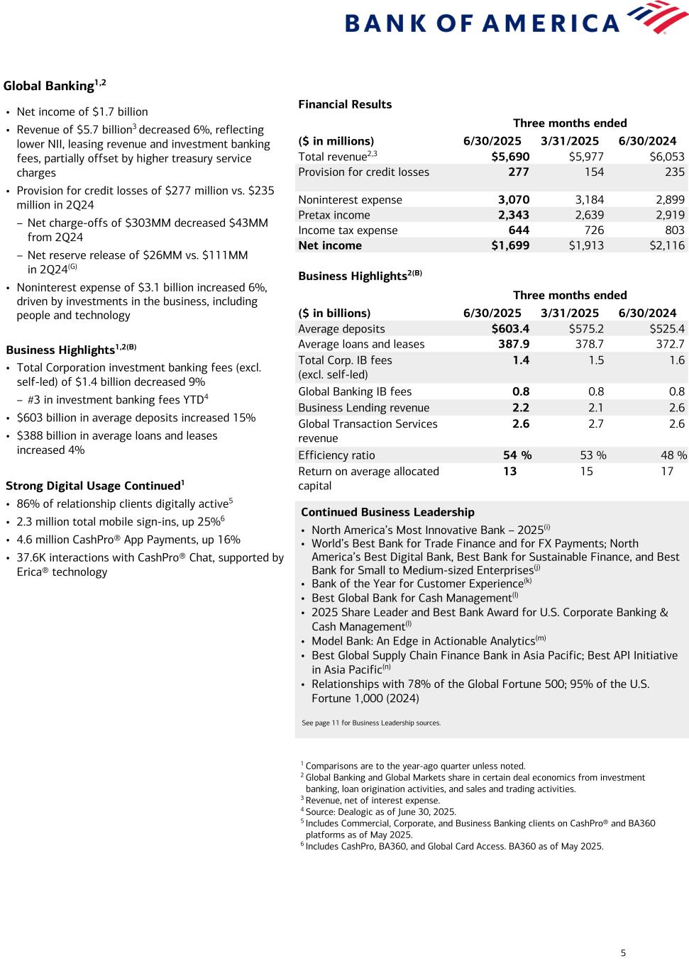 4 Global Wealth and Investment Management1 Financial Results Three months ended ($ in millions) 6/30/2025 3/31/2025 6/30/2024 Total revenue2 $5,937 $6,016 $5,574 Provision for credit losses 20 14 7 Noninterest expense 4,593 4,659 4,199 Pretax income 1,324 1,343 1,368 Income tax expense 331 336 342 Net income $993 $1,007 $1,026 Business Highlights(B) Three months ended ($ in billions) 6/30/2025 3/31/2025 6/30/2024 Average deposits $276.8 $286.4 $287.7 Average loans and leases 237.4 232.3 222.8 Total client balances (EOP) 4,395.2 4,157.2 4,011.9 AUM flows 14.3 24.0 10.8 Pretax margin 22 % 22 % 25 % Return on average allocated capital 20 21 22 • Net income of $1.0 billion • Revenue of $5.9 billion,2 up 7%. The increase was primarily driven by asset management fees, up 9% to $3.6 billion, on strong AUM flows and higher market levels • Noninterest expense of $4.6 billion increased 9%, driven by revenue-related incentives and investments in the business, including people and technology Business Highlights1(B) • $4.4 trillion in client balances, up 10%, driven by higher market valuations and positive net client flows – AUM flows of $14 billion; $82 billion since 2Q24 • Average deposits of $277 billion decreased 4% • Average loans and leases of $237 billion increased 7% Merrill Wealth Management Highlights Client Engagement • $3.7 trillion in client balances(B) • $1.6 trillion in AUM balances(B) • ~6.3K net new households added in 2Q25 • 30K digital appointments scheduled in the quarter Strong Digital Usage Continued • 86% of Merrill households digitally active3 – 64% of Merrill households are active on mobile • 83% of households enrolled in eDelivery4 • 76% of eligible checks deposited through automated channels5 • 78% of eligible bank and brokerage accounts opened through digital onboarding Bank of America Private Bank Highlights Client Engagement • $700 billion in client balances(B) • $423 billion in AUM balances(B) • Record ~435 net new relationships added in 2Q25 with $3MM+ clients Strong Digital Usage Continued1 • 93% of clients digitally active6 – 76% of Private Bank core relationships are active on mobile • 51% of eligible relationships enrolled in eDelivery4 • 77% of eligible checks deposited through automated channels5 • Record 427K Zelle® transactions sent and received worth a record $408MM, up 25% and 33%, respectively7 Continued Business Leadership • No. 1 on Forbes' Top Women Wealth Advisors Best-in-State (2025), Best-in-State Wealth Management Teams (2025), and Top Next Generation Advisors (2024) • No. 1 on Barron's Top 1200 Wealth Financial Advisors List (2025) and No. 1 on Barron’s Top 100 Women Financial Advisors (2024) • No. 1 on Financial Planning's Top 40 Advisors Under 40 List (2025) • Model Wealth Manager Holistic Wealth Management and Financial Wellbeing(g) • No. 1 in Managed Personal Trust AUM(b) • Best Private Bank in North America and Excellence in Philanthropic Services(h) See page 11 for Business Leadership sources. 1 Comparisons are to the year-ago quarter unless noted. 2 Revenue, net of interest expense. 3 Percentage of digitally active Merrill primary households across the enterprise ($250K+ in investable assets within the enterprise) as of June 2025. Excludes Stock Plan and Banking- only households. 4 Includes Merrill Digital Households across the enterprise (excluding Stock Plan, Banking-only households, Retirement-only and 529-only) and Private Bank relationships that receive statements digitally, as of May 2025 for Private Bank and as of June 2025 for Merrill. 5 Includes mobile check deposits, remote deposit operations, and automated teller machine transactions, as of May 2025 for Private Bank and as of June 2025 for Merrill. 6 Percentage of digitally active Private Bank core relationships across the enterprise ($3MM+ in total balances) as of May 2025. Includes third-party activities and excludes Irrevocable Trust-only relationships, Institutional Philanthropic relationships, and exiting relationships. 7 Includes Bank of America person-to-person payments sent and received through e-mail or mobile identification.