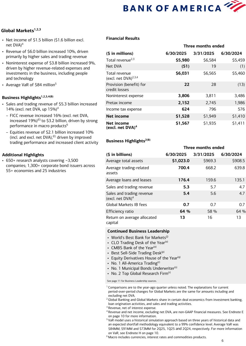 5 Global Banking1,2 Financial Results Three months ended ($ in millions) 6/30/2025 3/31/2025 6/30/2024 Total revenue2,3 $5,690 $5,977 $6,053 Provision for credit losses 277 154 235 Noninterest expense 3,070 3,184 2,899 Pretax income 2,343 2,639 2,919 Income tax expense 644 726 803 Net income $1,699 $1,913 $2,116 Business Highlights2(B) Three months ended ($ in billions) 6/30/2025 3/31/2025 6/30/2024 Average deposits $603.4 $575.2 $525.4 Average loans and leases 387.9 378.7 372.7 Total Corp. IB fees (excl. self-led) 1.4 1.5 1.6 Global Banking IB fees 0.8 0.8 0.8 Business Lending revenue 2.2 2.1 2.6 Global Transaction Services revenue 2.6 2.7 2.6 Efficiency ratio 54 % 53 % 48 % Return on average allocated capital 13 15 17 • Net income of $1.7 billion • Revenue of $5.7 billion3 decreased 6%, reflecting lower NII, leasing revenue and investment banking fees, partially offset by higher treasury service charges • Provision for credit losses of $277 million vs. $235 million in 2Q24 – Net charge-offs of $303MM decreased $43MM from 2Q24 – Net reserve release of $26MM vs. $111MM in 2Q24(G) • Noninterest expense of $3.1 billion increased 6%, driven by investments in the business, including people and technology Business Highlights1,2(B) • Total Corporation investment banking fees (excl. self-led) of $1.4 billion decreased 9% – #3 in investment banking fees YTD4 • $603 billion in average deposits increased 15% • $388 billion in average loans and leases increased 4% Strong Digital Usage Continued1 • 86% of relationship clients digitally active5 • 2.3 million total mobile sign-ins, up 25%6 • 4.6 million CashPro® App Payments, up 16% • 37.6K interactions with CashPro® Chat, supported by Erica® technology Continued Business Leadership • North America’s Most Innovative Bank – 2025(i) • World’s Best Bank for Trade Finance and for FX Payments; North America’s Best Digital Bank, Best Bank for Sustainable Finance, and Best Bank for Small to Medium-sized Enterprises(j) • Bank of the Year for Customer Experience(k) • Best Global Bank for Cash Management(l) • 2025 Share Leader and Best Bank Award for U.S. Corporate Banking & Cash Management(l) • Model Bank: An Edge in Actionable Analytics(m) • Best Global Supply Chain Finance Bank in Asia Pacific; Best API Initiative in Asia Pacific(n) • Relationships with 78% of the Global Fortune 500; 95% of the U.S. Fortune 1,000 (2024) See page 11 for Business Leadership sources. 1 Comparisons are to the year-ago quarter unless noted. 2 Global Banking and Global Markets share in certain deal economics from investment banking, loan origination activities, and sales and trading activities. 3 Revenue, net of interest expense. 4 Source: Dealogic as of June 30, 2025. 5 Includes Commercial, Corporate, and Business Banking clients on CashPro® and BA360 platforms as of May 2025. 6 Includes CashPro, BA360, and Global Card Access. BA360 as of May 2025.