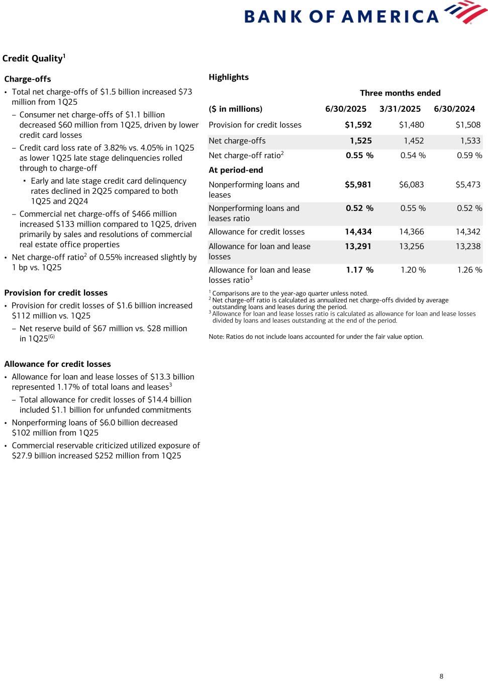 Current-period information is preliminary and based on company data available at the time of the presentation. 14 Bank of America Corporation and Subsidiaries Selected Financial Data (In millions, except per share data) Six Months Ended June 30 Second Quarter 2025 First Quarter 2025 Second Quarter 2024Summary Income Statement 2025 2024 Net interest income $ 29,113 $ 27,734 $ 14,670 $ 14,443 $ 13,702 Noninterest income 24,716 23,461 11,793 12,923 11,675 Total revenue, net of interest expense 53,829 51,195 26,463 27,366 25,377 Provision for credit losses 3,072 2,827 1,592 1,480 1,508 Noninterest expense 34,953 33,546 17,183 17,770 16,309 Income before income taxes 15,804 14,822 7,688 8,116 7,560 Income tax expense 1,292 1,251 572 720 663 Net income $ 14,512 $ 13,571 $ 7,116 $ 7,396 $ 6,897 Preferred stock dividends 697 847 291 406 315 Net income applicable to common shareholders $ 13,815 $ 12,724 $ 6,825 $ 6,990 $ 6,582 Average common shares issued and outstanding 7,629.5 7,933.3 7,581.2 7,677.9 7,897.9 Average diluted common shares issued and outstanding 7,711.2 7,996.2 7,651.6 7,770.8 7,960.9 Summary Average Balance Sheet Total cash and cash equivalents $ 297,677 $ 370,140 $ 299,620 $ 295,712 $ 369,631 Total debt securities 928,432 847,455 933,065 923,747 852,427 Total loans and leases 1,111,191 1,049,681 1,128,453 1,093,738 1,051,472 Total earning assets 3,008,755 2,874,257 3,050,206 2,966,843 2,887,935 Total assets 3,392,303 3,261,071 3,432,734 3,351,423 3,274,988 Total deposits 1,966,089 1,908,693 1,973,761 1,958,332 1,909,925 Common shareholders’ equity 273,915 264,702 274,344 273,480 265,290 Total shareholders’ equity 296,355 292,957 296,917 295,787 293,403 Performance Ratios Return on average assets 0.86 % 0.84 % 0.83 % 0.89 % 0.85 % Return on average common shareholders’ equity 10.17 9.67 9.98 10.36 9.98 Return on average tangible common shareholders’ equity (1) 13.67 13.15 13.40 13.94 13.57 Per Common Share Information Earnings $ 1.81 $ 1.60 $ 0.90 $ 0.91 $ 0.83 Diluted earnings 1.79 1.59 0.89 0.90 0.83 Dividends paid 0.52 0.48 0.26 0.26 0.24 Book value 37.13 34.39 37.13 36.39 34.39 Tangible book value (1) 27.71 25.37 27.71 27.12 25.37 Summary Period-End Balance Sheet June 30 2025 March 31 2025 June 30 2024 Total cash and cash equivalents $ 266,011 $ 273,579 $ 320,632 Total debt securities 930,216 939,279 878,417 Total loans and leases 1,147,056 1,110,625 1,056,785 Total earning assets 3,038,726 2,964,019 2,880,851 Total assets 3,441,142 3,349,424 3,257,996 Total deposits 2,011,613 1,989,564 1,910,491 Common shareholders’ equity 276,104 275,082 267,344 Total shareholders’ equity 299,599 295,581 293,892 Common shares issued and outstanding 7,436.7 7,560.1 7,774.8 Six Months Ended June 30 Second Quarter 2025 First Quarter 2025 Second Quarter 2024Credit Quality 2025 2024 Total net charge-offs $ 2,977 $ 3,031 $ 1,525 $ 1,452 $ 1,533 Net charge-offs as a percentage of average loans and leases outstanding (2) 0.54 % 0.58 % 0.55 % 0.54 % 0.59 % Provision for credit losses $ 3,072 $ 2,827 $ 1,592 $ 1,480 $ 1,508 June 30 2025 March 31 2025 June 30 2024 Total nonperforming loans, leases and foreclosed properties (3) $ 6,104 $ 6,201 $ 5,691 Nonperforming loans, leases and foreclosed properties as a percentage of total loans, leases and foreclosed properties (3) 0.54 % 0.56 % 0.54 % Allowance for credit losses $ 14,434 $ 14,366 $ 14,342 Allowance for loan and lease losses 13,291 13,256 13,238 Allowance for loan and lease losses as a percentage of total loans and leases outstanding (2) 1.17 % 1.20 % 1.26 % For footnotes, see page 15.