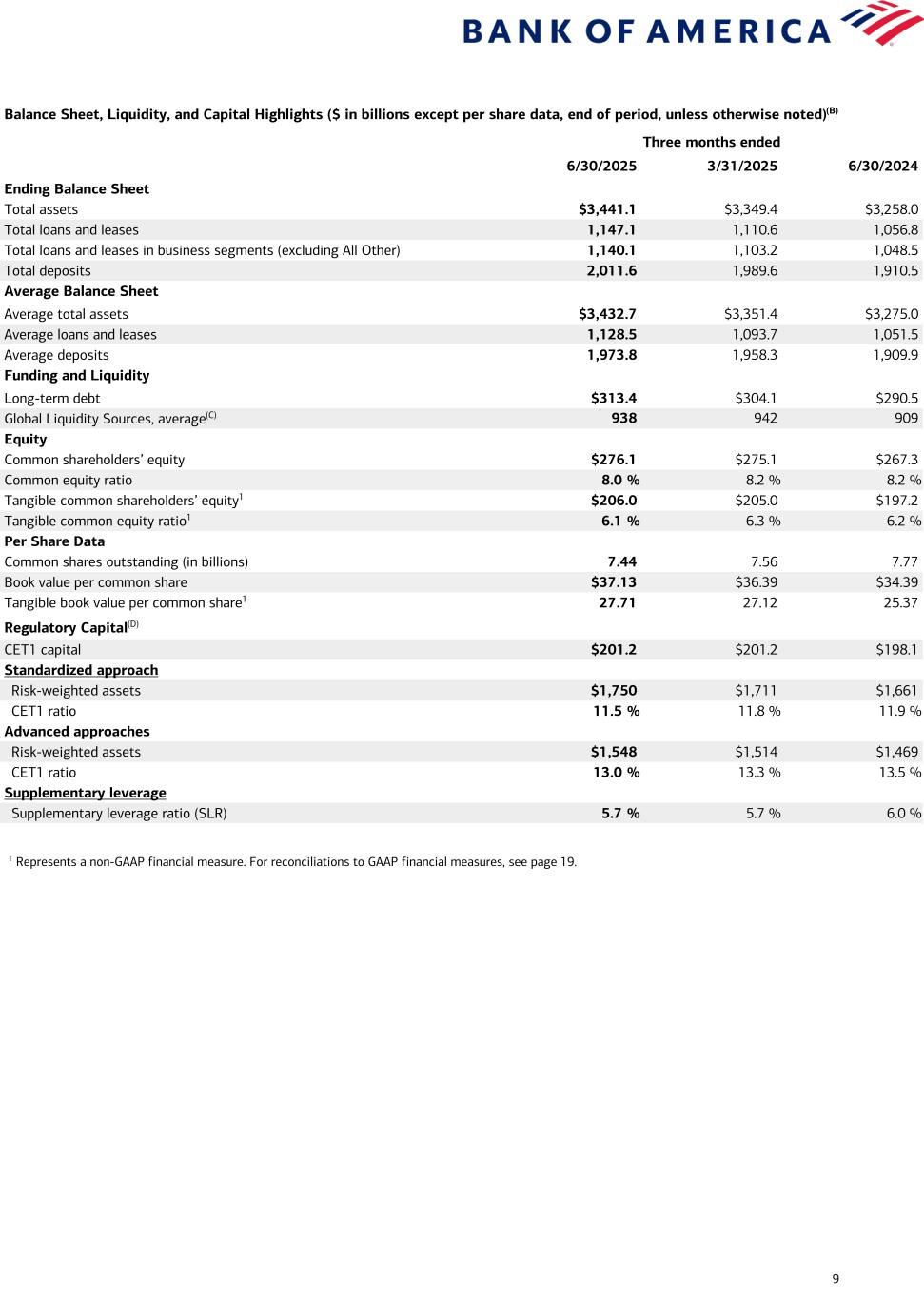 Current-period information is preliminary and based on company data available at the time of the presentation. 15 Bank of America Corporation and Subsidiaries Selected Financial Data (continued) (Dollars in millions) Capital Management June 30 2025 March 31 2025 June 30 2024 Regulatory capital metrics (4): Common equity tier 1 capital $ 201,200 $ 201,177 $ 198,119 Common equity tier 1 capital ratio - Standardized approach 11.5 % 11.8 % 11.9 % Common equity tier 1 capital ratio - Advanced approaches 13.0 13.3 13.5 Total capital ratio - Standardized approach 14.8 15.0 15.1 Total capital ratio - Advanced approaches 16.1 16.2 16.4 Tier 1 leverage ratio 6.7 6.8 7.0 Supplementary leverage ratio 5.7 5.7 6.0 Total ending equity to total ending assets ratio 8.7 8.8 9.0 Common equity ratio 8.0 8.2 8.2 Tangible equity ratio (5) 6.8 6.9 7.0 Tangible common equity ratio (5) 6.1 6.3 6.2 (1) Return on average tangible common shareholders’ equity and tangible book value per share of common stock are non-GAAP financial measures. We believe the use of ratios that utilize tangible equity provides additional useful information because they present measures of those assets that can generate income. Tangible book value per common share provides additional useful information about the level of tangible assets in relation to outstanding shares of common stock. See Reconciliations to GAAP Financial Measures on page 19. (2) Ratios do not include loans accounted for under the fair value option. Charge-off ratios are annualized for the quarterly presentation. (3) Balances do not include past due consumer credit card loans, consumer loans secured by real estate where repayments are insured by the Federal Housing Administration and individually insured long-term stand-by agreements (fully-insured home loans), and in general, other consumer and commercial loans not secured by real estate, and nonperforming loans held-for-sale or accounted for under the fair value option. (4) Regulatory capital ratios at June 30, 2025 are preliminary. Bank of America Corporation reports regulatory capital ratios under both the Standardized and Advanced approaches. Capital adequacy is evaluated against the lower of the Standardized or Advanced approaches compared to their respective regulatory capital ratio requirements. The Corporation’s binding ratio was the Total capital ratio under the Standardized approach at June 30, 2025 and June 30, 2024, and the Tier 1 capital ratio under the Standardized approach at March 31, 2025. (5) Tangible equity ratio equals period-end tangible shareholders’ equity divided by period-end tangible assets. Tangible common equity ratio equals period-end tangible common shareholders’ equity divided by period-end tangible assets. Tangible shareholders’ equity and tangible assets are non-GAAP financial measures. We believe the use of ratios that utilize tangible equity provides additional useful information because they present measures of those assets that can generate income. See Reconciliations to GAAP Financial Measures on page 19.