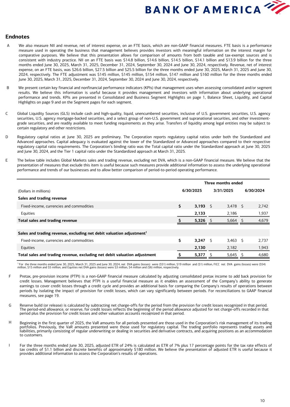 10 Endnotes A We also measure NII and revenue, net of interest expense, on an FTE basis, which are non-GAAP financial measures. FTE basis is a performance measure used in operating the business that management believes provides investors with meaningful information on the interest margin for comparative purposes. We believe that this presentation allows for comparison of amounts from both taxable and tax-exempt sources and is consistent with industry practice. NII on an FTE basis was $14.8 billion, $14.6 billion, $14.5 billion, $14.1 billion and $13.9 billion for the three months ended June 30, 2025, March 31, 2025, December 31, 2024, September 30, 2024 and June 30, 2024, respectively. Revenue, net of interest expense, on an FTE basis, was $26.6 billion, $27.5 billion and $25.5 billion for the three months ended June 30, 2025, March 31, 2025 and June 30, 2024, respectively. The FTE adjustment was $145 million, $145 million, $154 million, $147 million and $160 million for the three months ended June 30, 2025, March 31, 2025, December 31, 2024, September 30, 2024 and June 30, 2024, respectively. B We present certain key financial and nonfinancial performance indicators (KPIs) that management uses when assessing consolidated and/or segment results. We believe this information is useful because it provides management and investors with information about underlying operational performance and trends. KPIs are presented in Consolidated and Business Segment Highlights on page 1, Balance Sheet, Liquidity, and Capital Highlights on page 9 and on the Segment pages for each segment. C Global Liquidity Sources (GLS) include cash and high-quality, liquid, unencumbered securities, inclusive of U.S. government securities, U.S. agency securities, U.S. agency mortgage-backed securities, and a select group of non-U.S. government and supranational securities, and other investment- grade securities, and are readily available to meet funding requirements as they arise. Transfers of liquidity among legal entities may be subject to certain regulatory and other restrictions. D Regulatory capital ratios at June 30, 2025 are preliminary. The Corporation reports regulatory capital ratios under both the Standardized and Advanced approaches. Capital adequacy is evaluated against the lower of the Standardized or Advanced approaches compared to their respective regulatory capital ratio requirements. The Corporation’s binding ratio was the Total capital ratio under the Standardized approach at June 30, 2025 and June 30, 2024, and the Tier 1 capital ratio under the Standardized approach at March 31, 2025. E The below table includes Global Markets sales and trading revenue, excluding net DVA, which is a non-GAAP financial measure. We believe that the presentation of measures that exclude this item is useful because such measures provide additional information to assess the underlying operational performance and trends of our businesses and to allow better comparison of period-to-period operating performance. Three months ended (Dollars in millions) 6/30/2025 3/31/2025 6/30/2024 Sales and trading revenue Fixed-income, currencies and commodities $ 3,193 $ 3,478 $ 2,742 Equities 2,133 2,186 1,937 Total sales and trading revenue $ 5,326 $ 5,664 $ 4,679 Sales and trading revenue, excluding net debit valuation adjustment1 Fixed-income, currencies and commodities $ 3,247 $ 3,463 $ 2,737 Equities 2,130 2,182 1,943 Total sales and trading revenue, excluding net debit valuation adjustment $ 5,377 $ 5,645 $ 4,680 F Pretax, pre-provision income (PTPI) is a non-GAAP financial measure calculated by adjusting consolidated pretax income to add back provision for credit losses. Management believes that PTPI is a useful financial measure as it enables an assessment of the Company’s ability to generate earnings to cover credit losses through a credit cycle and provides an additional basis for comparing the Company's results of operations between periods by isolating the impact of provision for credit losses, which can vary significantly between periods. For reconciliations to GAAP financial measures, see page 19. G Reserve build (or release) is calculated by subtracting net charge-offs for the period from the provision for credit losses recognized in that period. The period-end allowance, or reserve, for credit losses reflects the beginning of the period allowance adjusted for net charge-offs recorded in that period plus the provision for credit losses and other valuation accounts recognized in that period. H Beginning in the first quarter of 2025, the VaR amounts for all periods presented are those used in the Corporation’s risk management of its trading portfolios. Previously, the VaR amounts presented were those used for regulatory capital. The trading portfolio represents trading assets and liabilities, primarily consisting of regular underwriting or dealing in securities and derivative contracts, and acquiring positions as an accommodation to customers. I For the three months ended June 30, 2025, adjusted ETR of 24% is calculated as ETR of 7% plus 17 percentage points for the tax rate effects of tax credits of $1.1 billion and discrete benefits of approximately $180 million. We believe the presentation of adjusted ETR is useful because it provides additional information to assess the Corporation’s results of operations. 1 For the three months ended June 30, 2025, March 31, 2025 and June 30, 2024, net DVA gains (losses) were ($51) million, $19 million and ($1) million, FICC net DVA gains (losses) were ($54) million, $15 million and $5 million, and Equities net DVA gains (losses) were $3 million, $4 million and ($6) million, respectively.