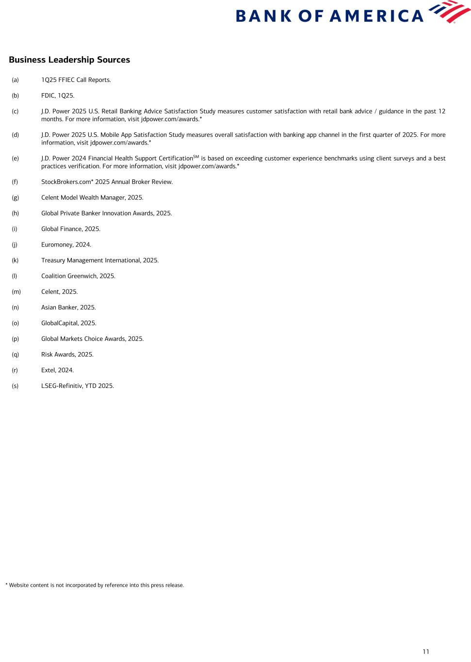 11 (a) 1Q25 FFIEC Call Reports. (b) FDIC, 1Q25. (c) J.D. Power 2025 U.S. Retail Banking Advice Satisfaction Study measures customer satisfaction with retail bank advice / guidance in the past 12 months. For more information, visit jdpower.com/awards.* (d) J.D. Power 2025 U.S. Mobile App Satisfaction Study measures overall satisfaction with banking app channel in the first quarter of 2025. For more information, visit jdpower.com/awards.* (e) J.D. Power 2024 Financial Health Support CertificationSM is based on exceeding customer experience benchmarks using client surveys and a best practices verification. For more information, visit jdpower.com/awards.* (f) StockBrokers.com* 2025 Annual Broker Review. (g) Celent Model Wealth Manager, 2025. (h) Global Private Banker Innovation Awards, 2025. (i) Global Finance, 2025. (j) Euromoney, 2024. (k) Treasury Management International, 2025. (l) Coalition Greenwich, 2025. (m) Celent, 2025. (n) Asian Banker, 2025. (o) GlobalCapital, 2025. (p) Global Markets Choice Awards, 2025. (q) Risk Awards, 2025. (r) Extel, 2024. (s) LSEG-Refinitiv, YTD 2025. Business Leadership Sources * Website content is not incorporated by reference into this press release.