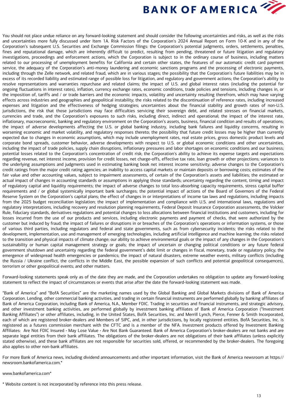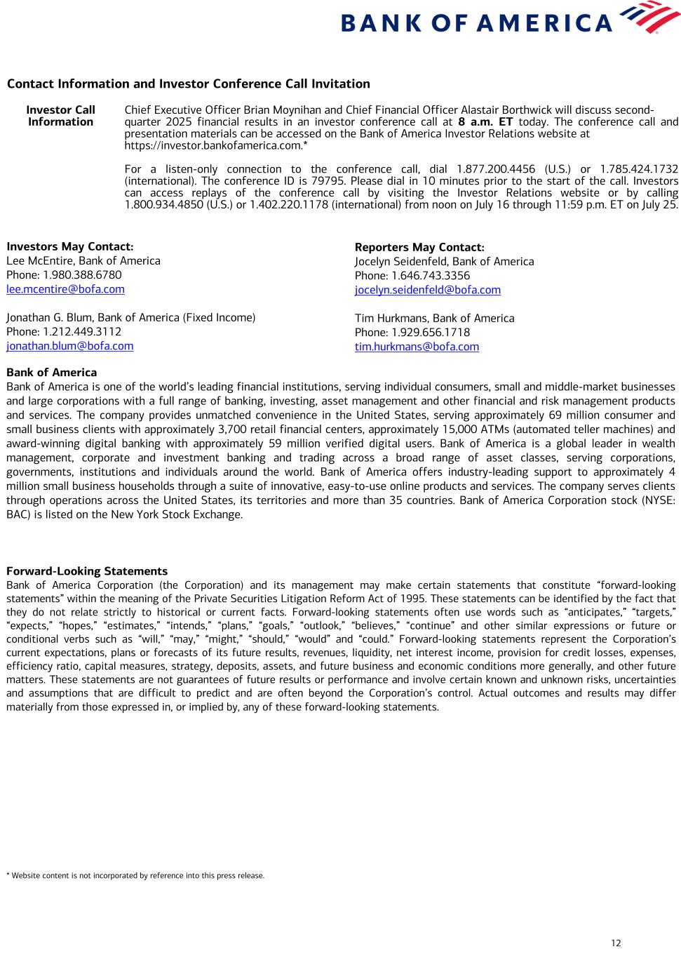 12 Contact Information and Investor Conference Call Invitation Investor Call Information Chief Executive Officer Brian Moynihan and Chief Financial Officer Alastair Borthwick will discuss second- quarter 2025 financial results in an investor conference call at 8 a.m. ET today. The conference call and presentation materials can be accessed on the Bank of America Investor Relations website at https://investor.bankofamerica.com.* For a listen-only connection to the conference call, dial 1.877.200.4456 (U.S.) or 1.785.424.1732 (international). The conference ID is 79795. Please dial in 10 minutes prior to the start of the call. Investors can access replays of the conference call by visiting the Investor Relations website or by calling 1.800.934.4850 (U.S.) or 1.402.220.1178 (international) from noon on July 16 through 11:59 p.m. ET on July 25. Investors May Contact: Lee McEntire, Bank of America Phone: 1.980.388.6780 lee.mcentire@bofa.com Jonathan G. Blum, Bank of America (Fixed Income) Phone: 1.212.449.3112 jonathan.blum@bofa.com Bank of America Bank of America is one of the world’s leading financial institutions, serving individual consumers, small and middle-market businesses and large corporations with a full range of banking, investing, asset management and other financial and risk management products and services. The company provides unmatched convenience in the United States, serving approximately 69 million consumer and small business clients with approximately 3,700 retail financial centers, approximately 15,000 ATMs (automated teller machines) and award-winning digital banking with approximately 59 million verified digital users. Bank of America is a global leader in wealth management, corporate and investment banking and trading across a broad range of asset classes, serving corporations, governments, institutions and individuals around the world. Bank of America offers industry-leading support to approximately 4 million small business households through a suite of innovative, easy-to-use online products and services. The company serves clients through operations across the United States, its territories and more than 35 countries. Bank of America Corporation stock (NYSE: BAC) is listed on the New York Stock Exchange. Forward-Looking Statements Bank of America Corporation (the Corporation) and its management may make certain statements that constitute “forward-looking statements” within the meaning of the Private Securities Litigation Reform Act of 1995. These statements can be identified by the fact that they do not relate strictly to historical or current facts. Forward-looking statements often use words such as “anticipates,” “targets,” “expects,” “hopes,” “estimates,” “intends,” “plans,” “goals,” “outlook,” “believes,” “continue” and other similar expressions or future or conditional verbs such as “will,” “may,” “might,” “should,” “would” and “could.” Forward-looking statements represent the Corporation’s current expectations, plans or forecasts of its future results, revenues, liquidity, net interest income, provision for credit losses, expenses, efficiency ratio, capital measures, strategy, deposits, assets, and future business and economic conditions more generally, and other future matters. These statements are not guarantees of future results or performance and involve certain known and unknown risks, uncertainties and assumptions that are difficult to predict and are often beyond the Corporation’s control. Actual outcomes and results may differ materially from those expressed in, or implied by, any of these forward-looking statements. * Website content is not incorporated by reference into this press release. Reporters May Contact: Jocelyn Seidenfeld, Bank of America Phone: 1.646.743.3356 jocelyn.seidenfeld@bofa.com Tim Hurkmans, Bank of America Phone: 1.929.656.1718 tim.hurkmans@bofa.com
