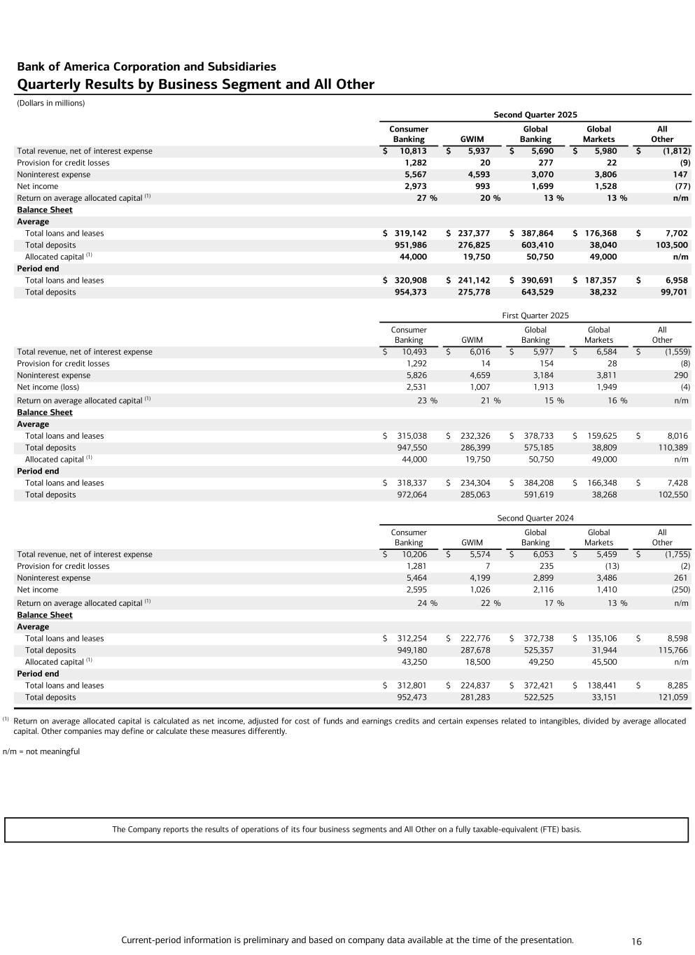Current-period information is preliminary and based on company data available at the time of the presentation. 16 Bank of America Corporation and Subsidiaries Quarterly Results by Business Segment and All Other (Dollars in millions) Second Quarter 2025 Consumer Banking GWIM Global Banking Global Markets All Other Total revenue, net of interest expense $ 10,813 $ 5,937 $ 5,690 $ 5,980 $ (1,812) Provision for credit losses 1,282 20 277 22 (9) Noninterest expense 5,567 4,593 3,070 3,806 147 Net income 2,973 993 1,699 1,528 (77) Return on average allocated capital (1) 27 % 20 % 13 % 13 % n/m Balance Sheet Average Total loans and leases $ 319,142 $ 237,377 $ 387,864 $ 176,368 $ 7,702 Total deposits 951,986 276,825 603,410 38,040 103,500 Allocated capital (1) 44,000 19,750 50,750 49,000 n/m Period end Total loans and leases $ 320,908 $ 241,142 $ 390,691 $ 187,357 $ 6,958 Total deposits 954,373 275,778 643,529 38,232 99,701 First Quarter 2025 Consumer Banking GWIM Global Banking Global Markets All Other Total revenue, net of interest expense $ 10,493 $ 6,016 $ 5,977 $ 6,584 $ (1,559) Provision for credit losses 1,292 14 154 28 (8) Noninterest expense 5,826 4,659 3,184 3,811 290 Net income (loss) 2,531 1,007 1,913 1,949 (4) Return on average allocated capital (1) 23 % 21 % 15 % 16 % n/m Balance Sheet Average Total loans and leases $ 315,038 $ 232,326 $ 378,733 $ 159,625 $ 8,016 Total deposits 947,550 286,399 575,185 38,809 110,389 Allocated capital (1) 44,000 19,750 50,750 49,000 n/m Period end Total loans and leases $ 318,337 $ 234,304 $ 384,208 $ 166,348 $ 7,428 Total deposits 972,064 285,063 591,619 38,268 102,550 Second Quarter 2024 Consumer Banking GWIM Global Banking Global Markets All Other Total revenue, net of interest expense $ 10,206 $ 5,574 $ 6,053 $ 5,459 $ (1,755) Provision for credit losses 1,281 7 235 (13) (2) Noninterest expense 5,464 4,199 2,899 3,486 261 Net income 2,595 1,026 2,116 1,410 (250) Return on average allocated capital (1) 24 % 22 % 17 % 13 % n/m Balance Sheet Average Total loans and leases $ 312,254 $ 222,776 $ 372,738 $ 135,106 $ 8,598 Total deposits 949,180 287,678 525,357 31,944 115,766 Allocated capital (1) 43,250 18,500 49,250 45,500 n/m Period end Total loans and leases $ 312,801 $ 224,837 $ 372,421 $ 138,441 $ 8,285 Total deposits 952,473 281,283 522,525 33,151 121,059 (1) Return on average allocated capital is calculated as net income, adjusted for cost of funds and earnings credits and certain expenses related to intangibles, divided by average allocated capital. Other companies may define or calculate these measures differently. n/m = not meaningful The Company reports the results of operations of its four business segments and All Other on a fully taxable-equivalent (FTE) basis.