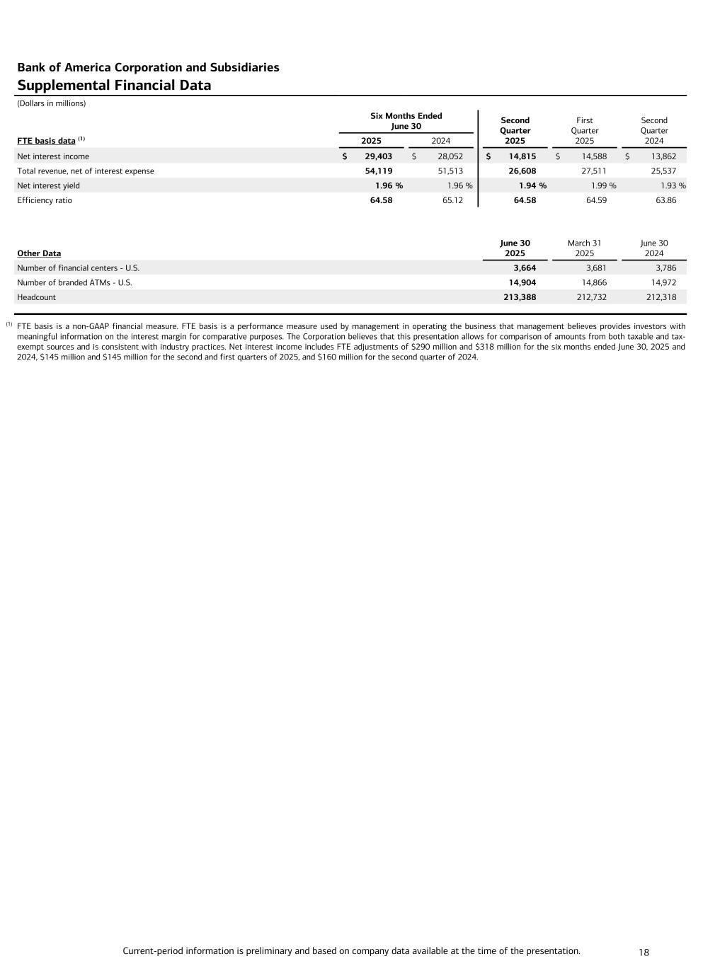 Current-period information is preliminary and based on company data available at the time of the presentation. 18 Bank of America Corporation and Subsidiaries Supplemental Financial Data (Dollars in millions) Six Months Ended June 30 Second Quarter 2025 First Quarter 2025 Second Quarter 2024FTE basis data (1) 2025 2024 Net interest income $ 29,403 $ 28,052 $ 14,815 $ 14,588 $ 13,862 Total revenue, net of interest expense 54,119 51,513 26,608 27,511 25,537 Net interest yield 1.96 % 1.96 % 1.94 % 1.99 % 1.93 % Efficiency ratio 64.58 65.12 64.58 64.59 63.86 Other Data June 30 2025 March 31 2025 June 30 2024 Number of financial centers - U.S. 3,664 3,681 3,786 Number of branded ATMs - U.S. 14,904 14,866 14,972 Headcount 213,388 212,732 212,318 (1) FTE basis is a non-GAAP financial measure. FTE basis is a performance measure used by management in operating the business that management believes provides investors with meaningful information on the interest margin for comparative purposes. The Corporation believes that this presentation allows for comparison of amounts from both taxable and tax- exempt sources and is consistent with industry practices. Net interest income includes FTE adjustments of $290 million and $318 million for the six months ended June 30, 2025 and 2024, $145 million and $145 million for the second and first quarters of 2025, and $160 million for the second quarter of 2024.
