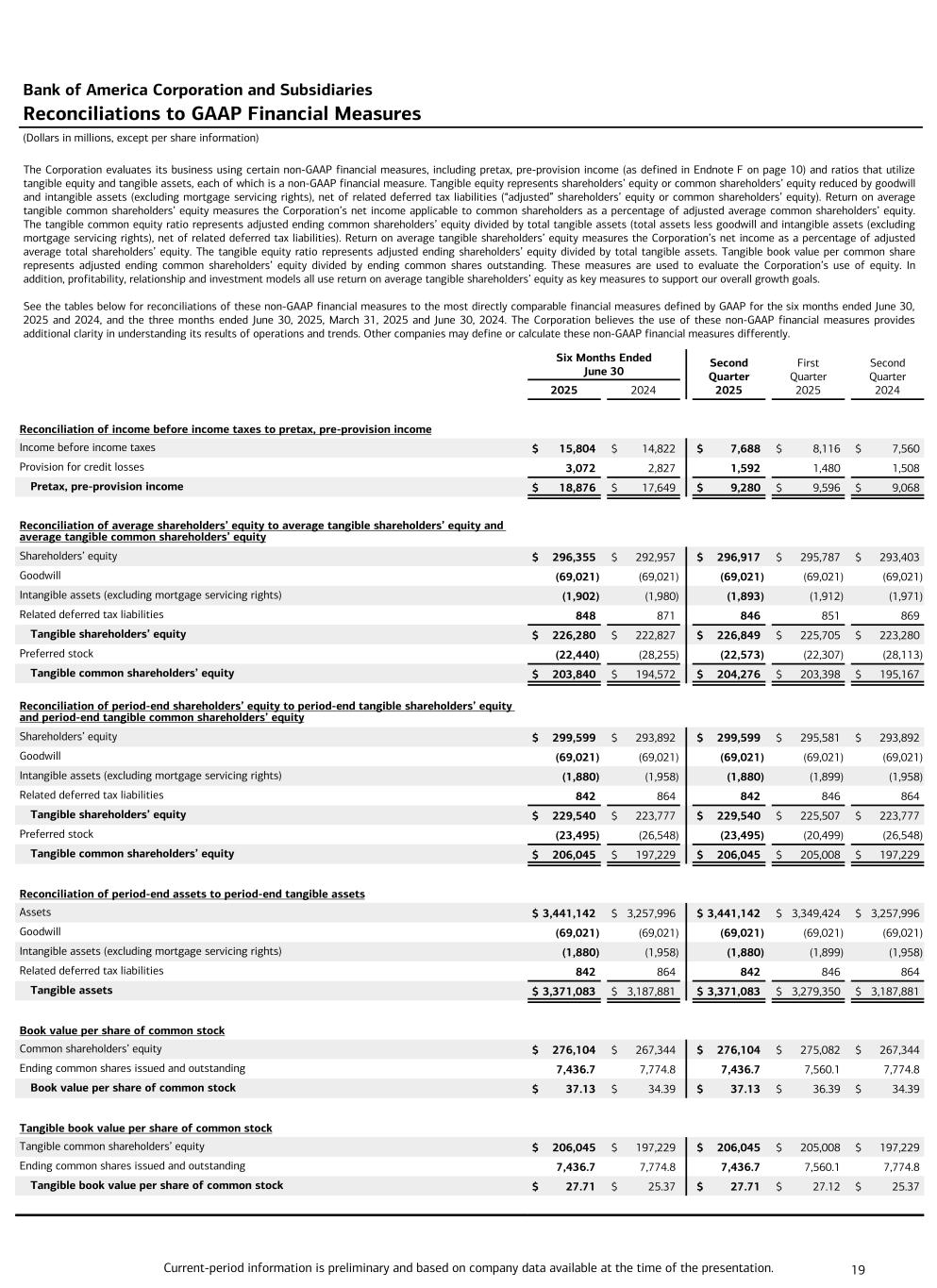 Current-period information is preliminary and based on company data available at the time of the presentation. 19 The Corporation evaluates its business using certain non-GAAP financial measures, including pretax, pre-provision income (as defined in Endnote F on page 10) and ratios that utilize tangible equity and tangible assets, each of which is a non-GAAP financial measure. Tangible equity represents shareholders’ equity or common shareholders’ equity reduced by goodwill and intangible assets (excluding mortgage servicing rights), net of related deferred tax liabilities (“adjusted” shareholders’ equity or common shareholders’ equity). Return on average tangible common shareholders’ equity measures the Corporation’s net income applicable to common shareholders as a percentage of adjusted average common shareholders’ equity. The tangible common equity ratio represents adjusted ending common shareholders’ equity divided by total tangible assets (total assets less goodwill and intangible assets (excluding mortgage servicing rights), net of related deferred tax liabilities). Return on average tangible shareholders’ equity measures the Corporation’s net income as a percentage of adjusted average total shareholders’ equity. The tangible equity ratio represents adjusted ending shareholders’ equity divided by total tangible assets. Tangible book value per common share represents adjusted ending common shareholders’ equity divided by ending common shares outstanding. These measures are used to evaluate the Corporation’s use of equity. In addition, profitability, relationship and investment models all use return on average tangible shareholders’ equity as key measures to support our overall growth goals. See the tables below for reconciliations of these non-GAAP financial measures to the most directly comparable financial measures defined by GAAP for the six months ended June 30, 2025 and 2024, and the three months ended June 30, 2025, March 31, 2025 and June 30, 2024. The Corporation believes the use of these non-GAAP financial measures provides additional clarity in understanding its results of operations and trends. Other companies may define or calculate these non-GAAP financial measures differently. Bank of America Corporation and Subsidiaries Reconciliations to GAAP Financial Measures (Dollars in millions, except per share information) Six Months Ended June 30 Second Quarter 2025 First Quarter 2025 Second Quarter 2024 2025 2024 Reconciliation of income before income taxes to pretax, pre-provision income Income before income taxes $ 15,804 $ 14,822 $ 7,688 $ 8,116 $ 7,560 Provision for credit losses 3,072 2,827 1,592 1,480 1,508 Pretax, pre-provision income $ 18,876 $ 17,649 $ 9,280 $ 9,596 $ 9,068 Reconciliation of average shareholders’ equity to average tangible shareholders’ equity and average tangible common shareholders’ equity Shareholders’ equity $ 296,355 $ 292,957 $ 296,917 $ 295,787 $ 293,403 Goodwill (69,021) (69,021) (69,021) (69,021) (69,021) Intangible assets (excluding mortgage servicing rights) (1,902) (1,980) (1,893) (1,912) (1,971) Related deferred tax liabilities 848 871 846 851 869 Tangible shareholders’ equity $ 226,280 $ 222,827 $ 226,849 $ 225,705 $ 223,280 Preferred stock (22,440) (28,255) (22,573) (22,307) (28,113) Tangible common shareholders’ equity $ 203,840 $ 194,572 $ 204,276 $ 203,398 $ 195,167 Reconciliation of period-end shareholders’ equity to period-end tangible shareholders’ equity and period-end tangible common shareholders’ equity Shareholders’ equity $ 299,599 $ 293,892 $ 299,599 $ 295,581 $ 293,892 Goodwill (69,021) (69,021) (69,021) (69,021) (69,021) Intangible assets (excluding mortgage servicing rights) (1,880) (1,958) (1,880) (1,899) (1,958) Related deferred tax liabilities 842 864 842 846 864 Tangible shareholders’ equity $ 229,540 $ 223,777 $ 229,540 $ 225,507 $ 223,777 Preferred stock (23,495) (26,548) (23,495) (20,499) (26,548) Tangible common shareholders’ equity $ 206,045 $ 197,229 $ 206,045 $ 205,008 $ 197,229 Reconciliation of period-end assets to period-end tangible assets Assets $ 3,441,142 $ 3,257,996 $ 3,441,142 $ 3,349,424 $ 3,257,996 Goodwill (69,021) (69,021) (69,021) (69,021) (69,021) Intangible assets (excluding mortgage servicing rights) (1,880) (1,958) (1,880) (1,899) (1,958) Related deferred tax liabilities 842 864 842 846 864 Tangible assets $ 3,371,083 $ 3,187,881 $ 3,371,083 $ 3,279,350 $ 3,187,881 Book value per share of common stock Common shareholders’ equity $ 276,104 $ 267,344 $ 276,104 $ 275,082 $ 267,344 Ending common shares issued and outstanding 7,436.7 7,774.8 7,436.7 7,560.1 7,774.8 Book value per share of common stock $ 37.13 $ 34.39 $ 37.13 $ 36.39 $ 34.39 Tangible book value per share of common stock Tangible common shareholders’ equity $ 206,045 $ 197,229 $ 206,045 $ 205,008 $ 197,229 Ending common shares issued and outstanding 7,436.7 7,774.8 7,436.7 7,560.1 7,774.8 Tangible book value per share of common stock $ 27.71 $ 25.37 $ 27.71 $ 27.12 $ 25.37