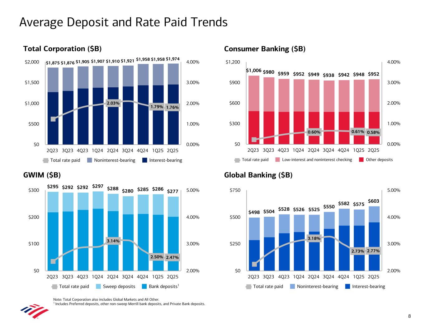 Balance Sheet Metrics 2Q25 1Q25 2Q24 Basel 3 Capital ($B)3 2Q25 1Q25 2Q24 Assets ($B) Common equity tier 1 capital $201 $201 $198 Total assets $3,441 $3,349 $3,258 Standardized approach Total loans and leases 1,147 1,111 1,057 Risk-weighted assets (RWA) $1,750 $1,711 $1,661 Cash and cash equivalents 266 274 321 CET1 ratio 11.5 % 11.8 % 11.9 % Total debt securities 930 939 878 Advanced approaches Carried at fair value 389 389 301 Risk-weighted assets $1,548 $1,514 $1,469 Held-to-maturity, at cost 541 551 577 CET1 ratio 13.0 % 13.3 % 13.5 % Supplementary leverage Funding & Liquidity ($B) Supplementary Leverage Ratio 5.7 % 5.7 % 6.0 % Total deposits $2,012 $1,990 $1,910 Long-term debt 313 304 290 Global Liquidity Sources (average)1 938 942 909 Equity ($B) Common shareholders' equity $276 $275 $267 Common equity ratio 8.0 % 8.2 % 8.2 % Tangible common shareholders' equity2 $206 $205 $197 Tangible common equity ratio2 6.1 % 6.3 % 6.2 % Per Share Data Book value per common share $37.13 $36.39 $34.39 Tangible book value per common share2 27.71 27.12 25.37 Common shares outstanding (in billions) 7.44 7.56 7.77 1 See note A on slide 30 for definition of Global Liquidity Sources. 2 Represent non-GAAP financial measures. For important presentation information, see slide 33. 3 Regulatory capital ratios at June 30, 2025, are preliminary. The Corporation reports regulatory capital ratios under both the Standardized and Advanced approaches. Capital adequacy is evaluated against the lower of the Standardized or Advanced approaches compared to their respective regulatory capital ratio requirements. The Corporation’s binding ratio was the Total capital ratio under the Standardized approach at June 30, 2025, and June 30, 2024, and the Tier 1 capital ratio under the Standardized approach at March 31, 2025. Balance Sheet, Liquidity, and Capital (EOP basis unless noted) 7 • CET1 ratio of 11.5% decreased 26 bps vs. 1Q253 – CET1 capital of $201B was flat to 1Q25 – Standardized RWA of $1.7T increased $39B • Book value per share of $37.13 improved 8% from 2Q24; tangible book value per share of $27.71 improved 9% from 2Q242 • Average Global Liquidity Sources of $938B decreased $4B compared to 1Q251