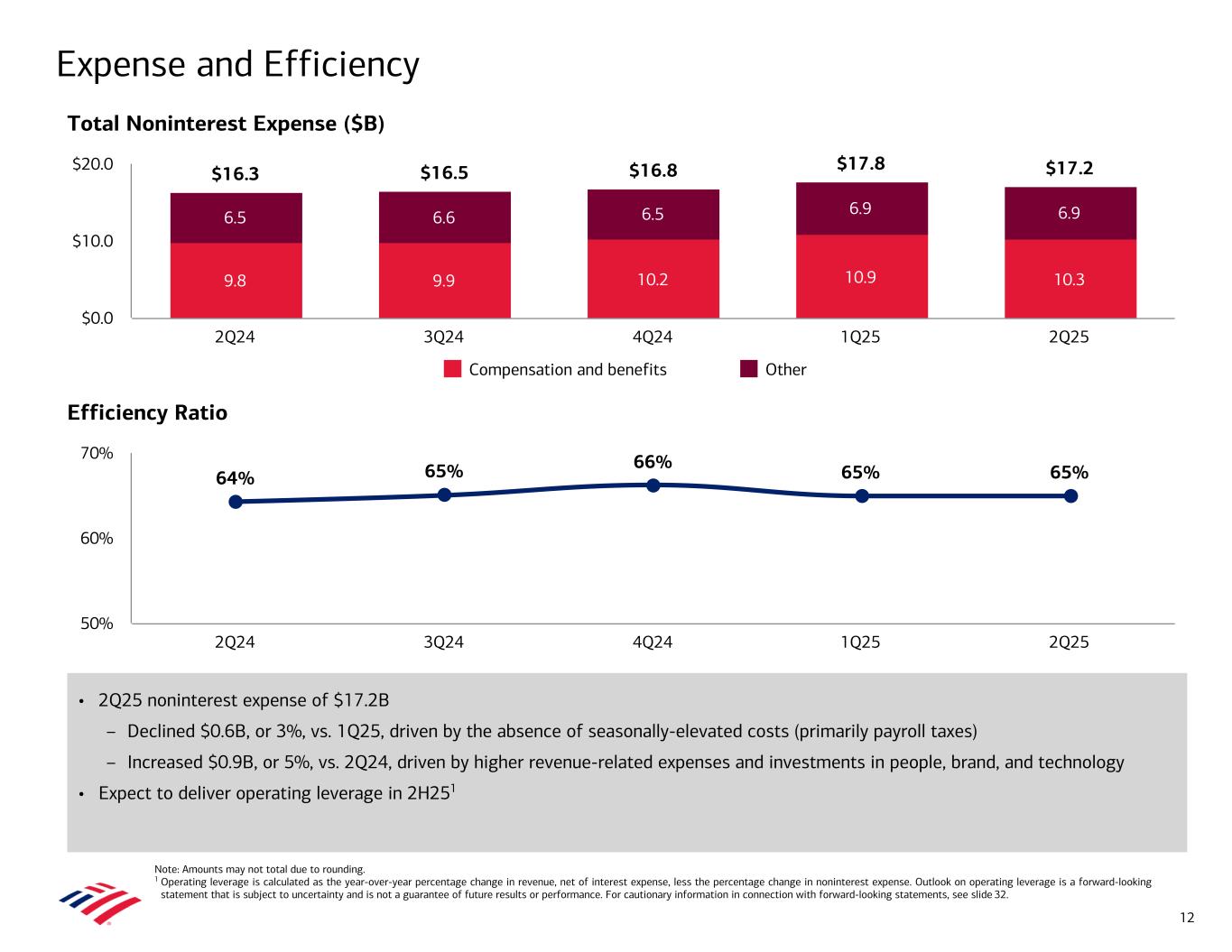 • Net income of $1.0B • Revenue of $5.9B increased 7% from 2Q24, driven primarily by higher asset management fees from strong AUM flows and higher market levels • Noninterest expense of $4.6B increased 9% vs. 2Q24, driven by revenue-related incentives and investments in the business, including people and technology • Client balances of $4.4T increased 10% from 2Q24, driven by higher market valuations and positive net client flows – AUM flows of $14B in 2Q25; $82B since 2Q24 • 63% of clients have banking relationship – Average deposits of $277B decreased $11B, or 4%, from 2Q24 – Average loans and leases of $237B increased $15B, or 7%, from 2Q24 • Added ~7,100 net new relationships across Merrill and Private Bank in 2Q25 • 86% of GWIM households / relationships digitally active across the enterprise2 Global Wealth & Investment Management 1 Represents a non-GAAP financial measure. For more information and a reconciliation to the most directly comparable GAAP financial measure, see note C on slide 30. For important presentation information, see slide 33. 2 Represents the percentage of digitally active Merrill primary households ($250K+ in investable assets within the enterprise) and digitally active Private Bank core relationships ($3MM+ in total balances). Merrill excludes Stock Plan and Banking-only households. Private Bank includes third-party activities and excludes Irrevocable Trust-only relationships, Institutional Philanthropic relationships, and exiting relationships. As of May 2025 for Private Bank and as of June 2025 for Merrill. Inc / (Dec) Summary Income Statement ($MM) 2Q25 1Q25 2Q24 Total revenue, net of interest expense $5,937 ($79) $363 Provision for credit losses 20 6 13 Noninterest expense 4,593 (66) 394 Pretax income 1,324 (19) (44) Pretax, pre-provision income1 1,344 (13) (31) Income tax expense 331 (5) (11) Net income $993 ($14) ($33) Key Indicators ($B) 2Q25 1Q25 2Q24 Average deposits $276.8 $286.4 $287.7 Rate paid on deposits 2.47 % 2.50 % 3.14 % Average loans and leases $237.4 $232.3 $222.8 Net charge-off ratio 0.02 % 0.02 % 0.02 % Net charge-offs ($MM) $10 $9 $11 Reserve build (release) ($MM) 10 5 (4) AUM flows 14.3 24.0 10.8 Pretax margin 22 % 22 % 25 % Return on average allocated capital 20 21 22 Allocated capital $19.8 $19.8 $18.5 16