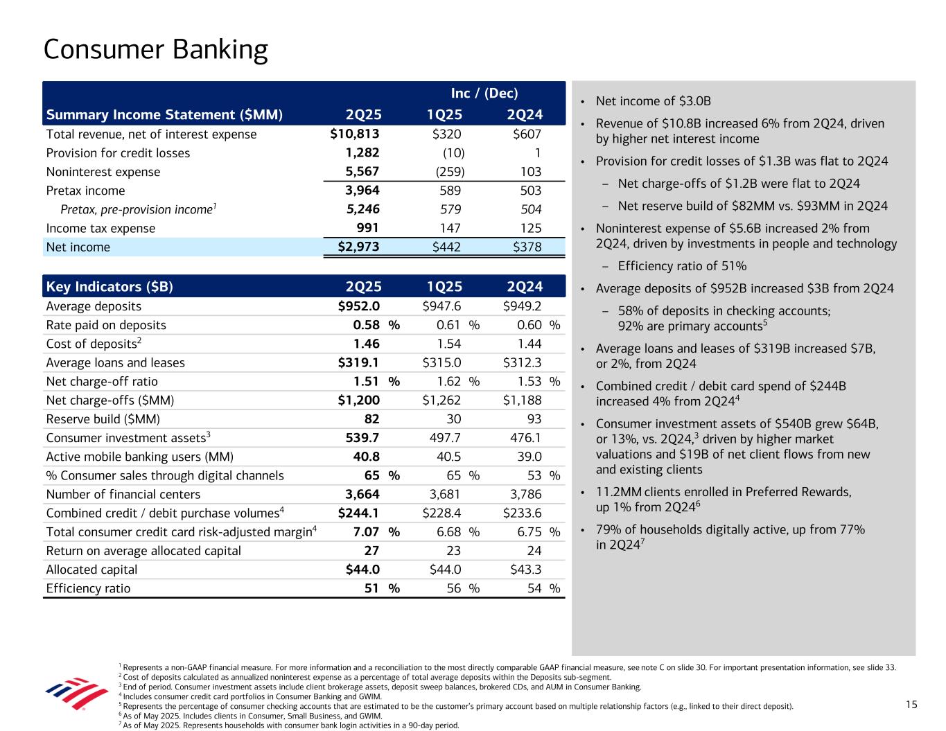 • Net income of $3.0B • Revenue of $10.8B increased 6% from 2Q24, driven by higher net interest income • Provision for credit losses of $1.3B was flat to 2Q24 – Net charge-offs of $1.2B were flat to 2Q24 – Net reserve build of $82MM vs. $93MM in 2Q24 • Noninterest expense of $5.6B increased 2% from 2Q24, driven by investments in people and technology – Efficiency ratio of 51% • Average deposits of $952B increased $3B from 2Q24 – 58% of deposits in checking accounts; 92% are primary accounts5 • Average loans and leases of $319B increased $7B, or 2%, from 2Q24 • Combined credit / debit card spend of $244B increased 4% from 2Q244 • Consumer investment assets of $540B grew $64B, or 13%, vs. 2Q24,3 driven by higher market valuations and $19B of net client flows from new and existing clients • 11.2MM clients enrolled in Preferred Rewards, up 1% from 2Q246 • 79% of households digitally active, up from 77% in 2Q247 Consumer Banking 1 Represents a non-GAAP financial measure. For more information and a reconciliation to the most directly comparable GAAP financial measure, see note C on slide 30. For important presentation information, see slide 33. 2 Cost of deposits calculated as annualized noninterest expense as a percentage of total average deposits within the Deposits sub-segment. 3 End of period. Consumer investment assets include client brokerage assets, deposit sweep balances, brokered CDs, and AUM in Consumer Banking. 4 Includes consumer credit card portfolios in Consumer Banking and GWIM. 5 Represents the percentage of consumer checking accounts that are estimated to be the customer’s primary account based on multiple relationship factors (e.g., linked to their direct deposit). 6 As of May 2025. Includes clients in Consumer, Small Business, and GWIM. 7 As of May 2025. Represents households with consumer bank login activities in a 90-day period. Inc / (Dec) Summary Income Statement ($MM) 2Q25 1Q25 2Q24 Total revenue, net of interest expense $10,813 $320 $607 Provision for credit losses 1,282 (10) 1 Noninterest expense 5,567 (259) 103 Pretax income 3,964 589 503 Pretax, pre-provision income1 5,246 579 504 Income tax expense 991 147 125 Net income $2,973 $442 $378 Key Indicators ($B) 2Q25 1Q25 2Q24 Average deposits $952.0 $947.6 $949.2 Rate paid on deposits 0.58 % 0.61 % 0.60 % Cost of deposits2 1.46 1.54 1.44 Average loans and leases $319.1 $315.0 $312.3 Net charge-off ratio 1.51 % 1.62 % 1.53 % Net charge-offs ($MM) $1,200 $1,262 $1,188 Reserve build ($MM) 82 30 93 Consumer investment assets3 539.7 497.7 476.1 Active mobile banking users (MM) 40.8 40.5 39.0 % Consumer sales through digital channels 65 % 65 % 53 % Number of financial centers 3,664 3,681 3,786 Combined credit / debit purchase volumes4 $244.1 $228.4 $233.6 Total consumer credit card risk-adjusted margin4 7.07 % 6.68 % 6.75 % Return on average allocated capital 27 23 24 Allocated capital $44.0 $44.0 $43.3 Efficiency ratio 51 % 56 % 54 % 15