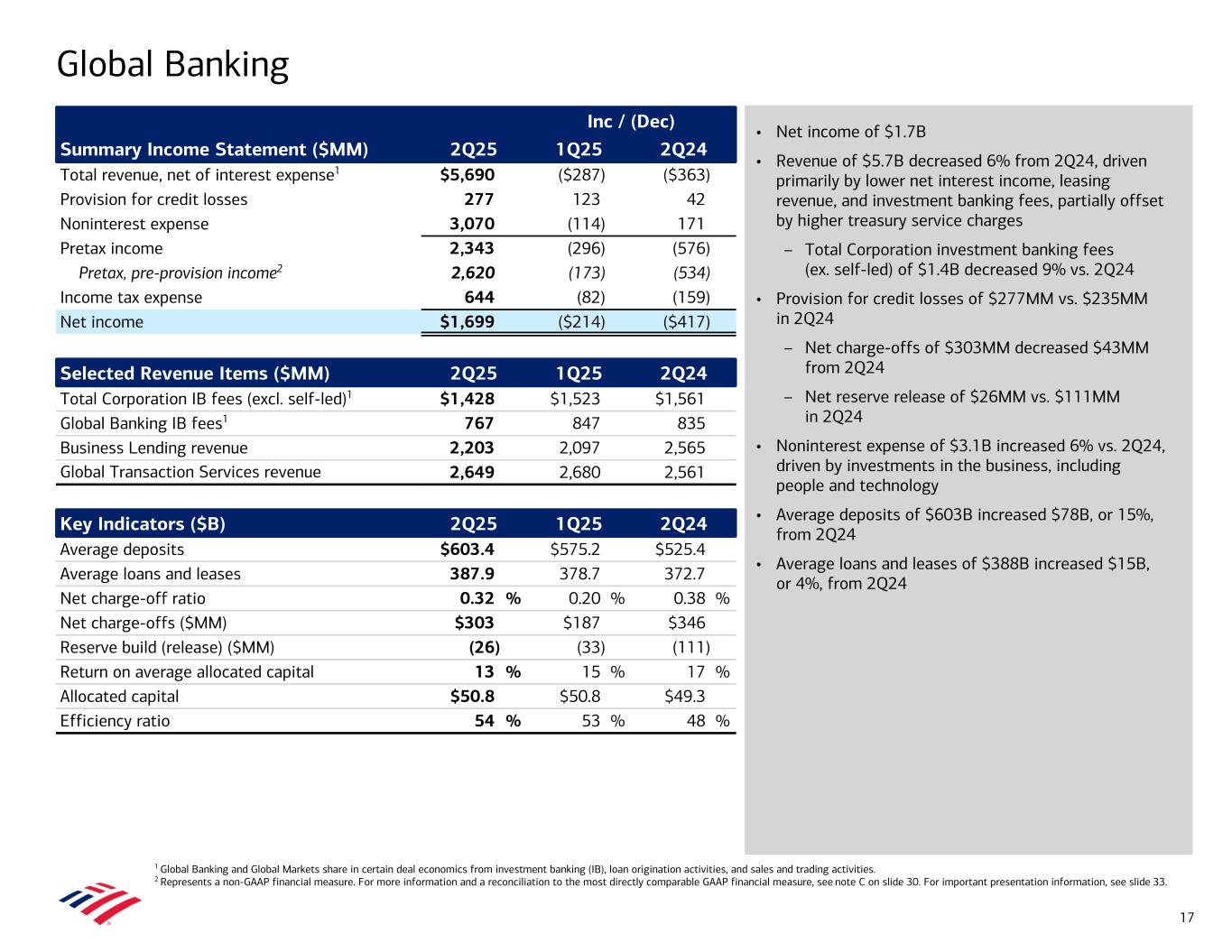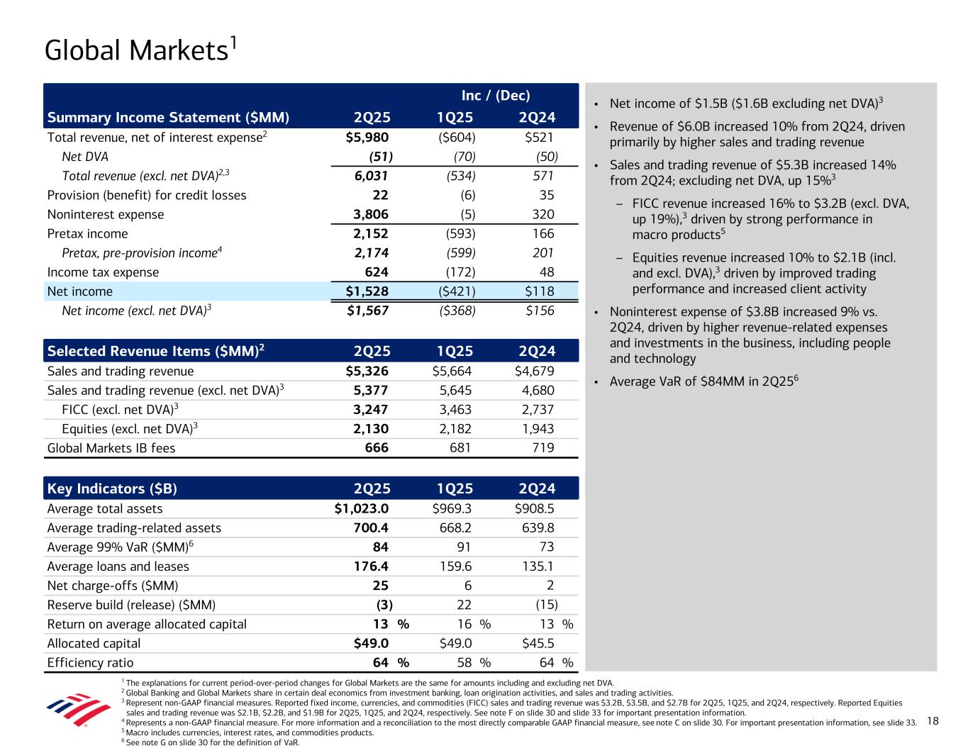 • Net income of $1.7B • Revenue of $5.7B decreased 6% from 2Q24, driven primarily by lower net interest income, leasing revenue, and investment banking fees, partially offset by higher treasury service charges – Total Corporation investment banking fees (ex. self-led) of $1.4B decreased 9% vs. 2Q24 • Provision for credit losses of $277MM vs. $235MM in 2Q24 – Net charge-offs of $303MM decreased $43MM from 2Q24 – Net reserve release of $26MM vs. $111MM in 2Q24 • Noninterest expense of $3.1B increased 6% vs. 2Q24, driven by investments in the business, including people and technology • Average deposits of $603B increased $78B, or 15%, from 2Q24 • Average loans and leases of $388B increased $15B, or 4%, from 2Q24 Global Banking 1 Global Banking and Global Markets share in certain deal economics from investment banking (IB), loan origination activities, and sales and trading activities. 2 Represents a non-GAAP financial measure. For more information and a reconciliation to the most directly comparable GAAP financial measure, see note C on slide 30. For important presentation information, see slide 33. Inc / (Dec) Summary Income Statement ($MM) 2Q25 1Q25 2Q24 Total revenue, net of interest expense1 $5,690 ($287) ($363) Provision for credit losses 277 123 42 Noninterest expense 3,070 (114) 171 Pretax income 2,343 (296) (576) Pretax, pre-provision income2 2,620 (173) (534) Income tax expense 644 (82) (159) Net income $1,699 ($214) ($417) Selected Revenue Items ($MM) 2Q25 1Q25 2Q24 Total Corporation IB fees (excl. self-led)1 $1,428 $1,523 $1,561 Global Banking IB fees1 767 847 835 Business Lending revenue 2,203 2,097 2,565 Global Transaction Services revenue 2,649 2,680 2,561 Key Indicators ($B) 2Q25 1Q25 2Q24 Average deposits $603.4 $575.2 $525.4 Average loans and leases 387.9 378.7 372.7 Net charge-off ratio 0.32 % 0.20 % 0.38 % Net charge-offs ($MM) $303 $187 $346 Reserve build (release) ($MM) (26) (33) (111) Return on average allocated capital 13 % 15 % 17 % Allocated capital $50.8 $50.8 $49.3 Efficiency ratio 54 % 53 % 48 % 17