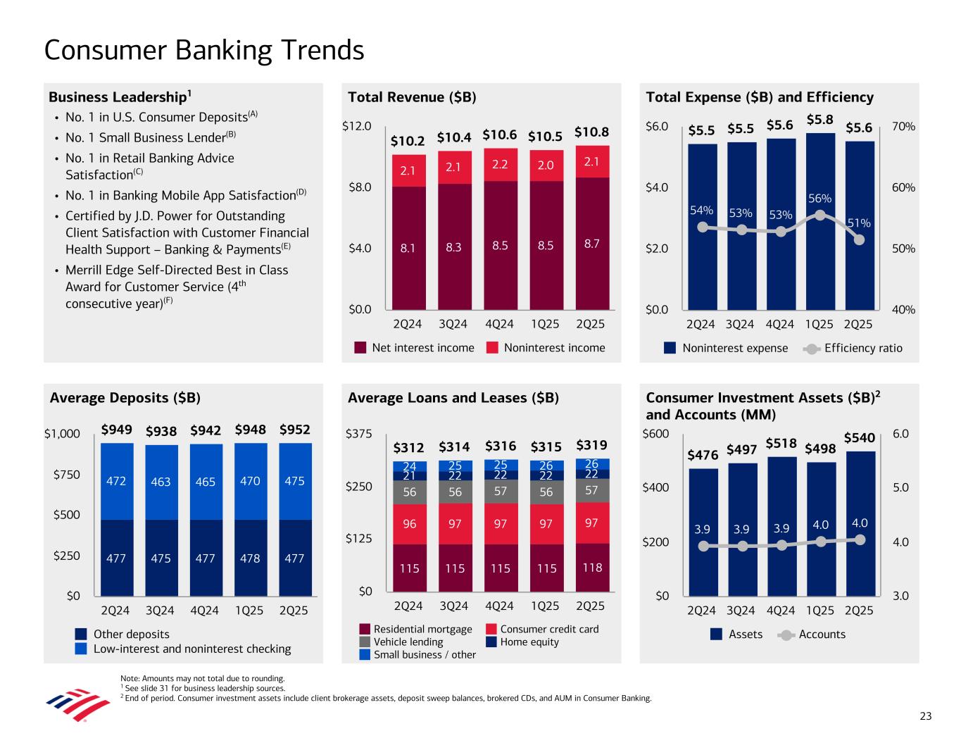 Total Expense ($B) and Efficiency Total Revenue ($B) Average Deposits ($B) Consumer Investment Assets ($B)2 and Accounts (MM) Average Loans and Leases ($B) Consumer Banking Trends Note: Amounts may not total due to rounding. 1 See slide 31 for business leadership sources. 2 End of period. Consumer investment assets include client brokerage assets, deposit sweep balances, brokered CDs, and AUM in Consumer Banking. $10.2 $10.4 $10.6 $10.5 $10.8 8.1 8.3 8.5 8.5 8.7 2.1 2.1 2.2 2.0 2.1 Net interest income Noninterest income 2Q24 3Q24 4Q24 1Q25 2Q25 $0.0 $4.0 $8.0 $12.0 $5.5 $5.5 $5.6 $5.8 $5.6 54% 53% 53% 56% 51% Noninterest expense Efficiency ratio 2Q24 3Q24 4Q24 1Q25 2Q25 $0.0 $2.0 $4.0 $6.0 40% 50% 60% 70% $949 $938 $942 $948 $952 477 475 477 478 477 472 463 465 470 475 Other deposits Low-interest and noninterest checking 2Q24 3Q24 4Q24 1Q25 2Q25 $0 $250 $500 $750 $1,000 $312 $314 $316 $315 $319 115 115 115 115 118 96 97 97 97 97 56 56 57 56 57 21 22 22 22 22 24 25 25 26 26 Residential mortgage Consumer credit card Vehicle lending Home equity Small business / other 2Q24 3Q24 4Q24 1Q25 2Q25 $0 $125 $250 $375 23 $476 $497 $518 $498 $540 3.9 3.9 3.9 4.0 4.0 Assets Accounts 2Q24 3Q24 4Q24 1Q25 2Q25 $0 $200 $400 $600 3.0 4.0 5.0 6.0 Business Leadership1 • No. 1 in U.S. Consumer Deposits(A) • No. 1 Small Business Lender(B) • No. 1 in Retail Banking Advice Satisfaction(C) • No. 1 in Banking Mobile App Satisfaction(D) • Certified by J.D. Power for Outstanding Client Satisfaction with Customer Financial Health Support – Banking & Payments(E) • Merrill Edge Self-Directed Best in Class Award for Customer Service (4th consecutive year)(F)