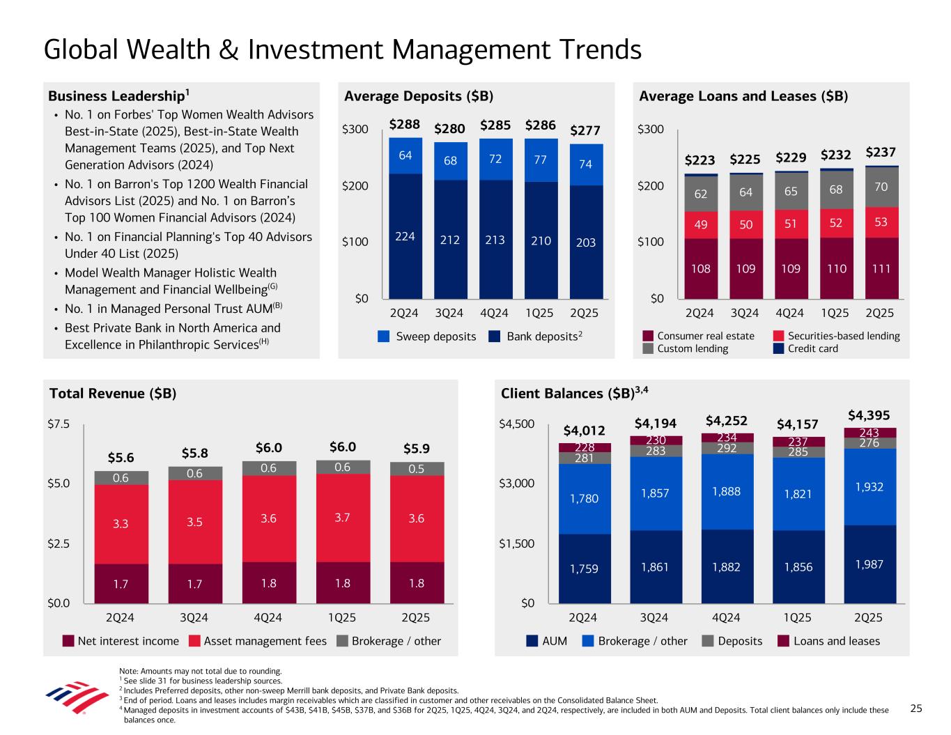 Note: Amounts may not total due to rounding. 1 See slide 31 for business leadership sources. 2 Includes Preferred deposits, other non-sweep Merrill bank deposits, and Private Bank deposits. 3 End of period. Loans and leases includes margin receivables which are classified in customer and other receivables on the Consolidated Balance Sheet. 4 Managed deposits in investment accounts of $43B, $41B, $45B, $37B, and $36B for 2Q25, 1Q25, 4Q24, 3Q24, and 2Q24, respectively, are included in both AUM and Deposits. Total client balances only include these balances once. Average Deposits ($B) Global Wealth & Investment Management Trends Business Leadership1 • No. 1 on Forbes' Top Women Wealth Advisors Best-in-State (2025), Best-in-State Wealth Management Teams (2025), and Top Next Generation Advisors (2024) • No. 1 on Barron's Top 1200 Wealth Financial Advisors List (2025) and No. 1 on Barron’s Top 100 Women Financial Advisors (2024) • No. 1 on Financial Planning's Top 40 Advisors Under 40 List (2025) • Model Wealth Manager Holistic Wealth Management and Financial Wellbeing(G) • No. 1 in Managed Personal Trust AUM(B) • Best Private Bank in North America and Excellence in Philanthropic Services(H) Average Loans and Leases ($B) Total Revenue ($B) Client Balances ($B)3,4 $5.6 $5.8 $6.0 $6.0 $5.9 1.7 1.7 1.8 1.8 1.8 3.3 3.5 3.6 3.7 3.6 0.6 0.6 0.6 0.6 0.5 Net interest income Asset management fees Brokerage / other 2Q24 3Q24 4Q24 1Q25 2Q25 $0.0 $2.5 $5.0 $7.5 1,759 1,861 1,882 1,856 1,987 1,780 1,857 1,888 1,821 1,932 281 283 292 285 276228 230 234 237 243$4,012 $4,194 $4,252 $4,157 $4,395 AUM Brokerage / other Deposits Loans and leases 2Q24 3Q24 4Q24 1Q25 2Q25 $0 $1,500 $3,000 $4,500 $223 $225 $229 $232 $237 108 109 109 110 111 49 50 51 52 53 62 64 65 68 70 Consumer real estate Securities-based lending Custom lending Credit card 2Q24 3Q24 4Q24 1Q25 2Q25 $0 $100 $200 $300$288 $280 $285 $286 $277 224 212 213 210 203 64 68 72 77 74 Sweep deposits Bank deposits 2Q24 3Q24 4Q24 1Q25 2Q25 $0 $100 $200 $300 25 2