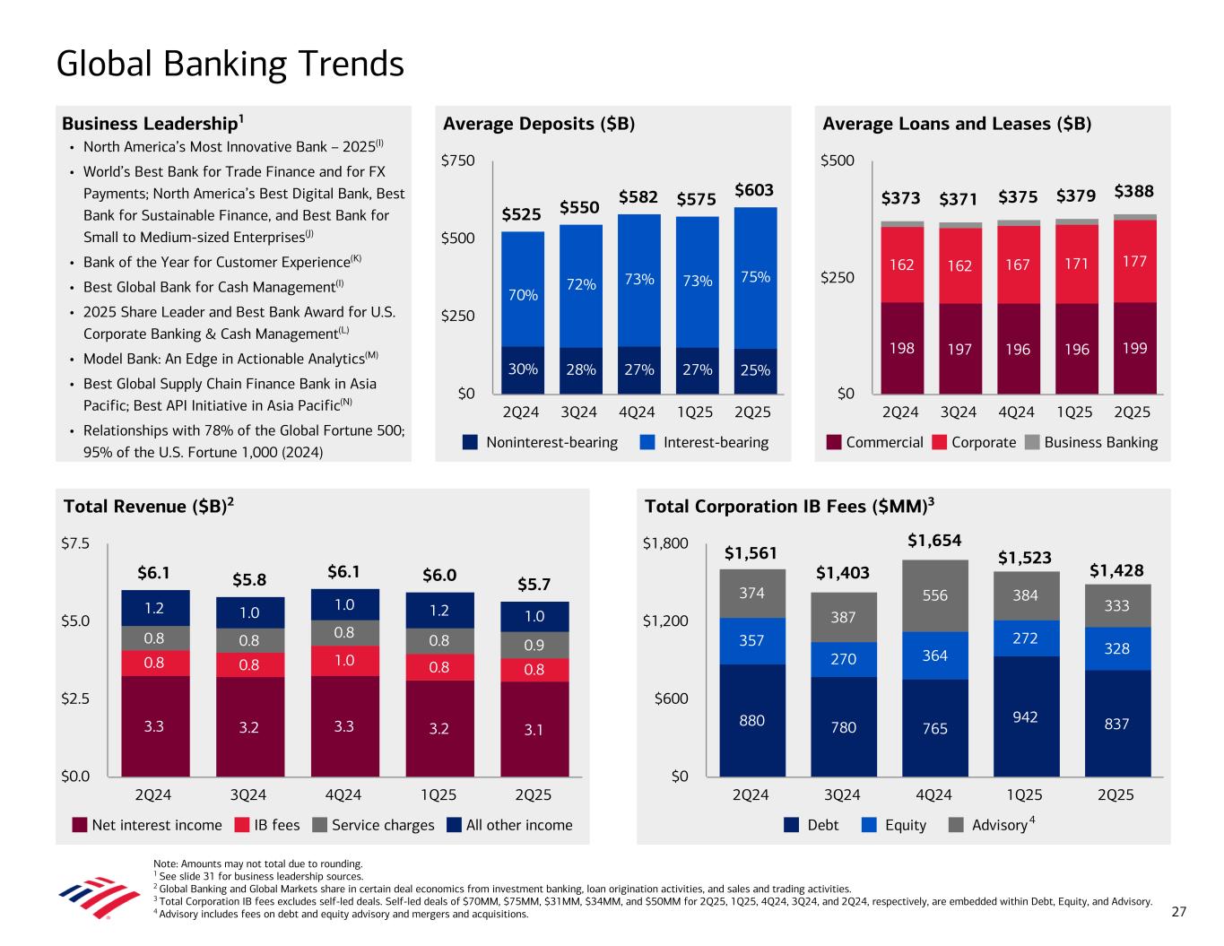 Global Banking Trends Note: Amounts may not total due to rounding. 1 See slide 31 for business leadership sources. 2 Global Banking and Global Markets share in certain deal economics from investment banking, loan origination activities, and sales and trading activities. 3 Total Corporation IB fees excludes self-led deals. Self-led deals of $70MM, $75MM, $31MM, $34MM, and $50MM for 2Q25, 1Q25, 4Q24, 3Q24, and 2Q24, respectively, are embedded within Debt, Equity, and Advisory. 4 Advisory includes fees on debt and equity advisory and mergers and acquisitions. Average Deposits ($B)Business Leadership1 • North America’s Most Innovative Bank – 2025(I) • World’s Best Bank for Trade Finance and for FX Payments; North America’s Best Digital Bank, Best Bank for Sustainable Finance, and Best Bank for Small to Medium-sized Enterprises(J) • Bank of the Year for Customer Experience(K) • Best Global Bank for Cash Management(I) • 2025 Share Leader and Best Bank Award for U.S. Corporate Banking & Cash Management(L) • Model Bank: An Edge in Actionable Analytics(M) • Best Global Supply Chain Finance Bank in Asia Pacific; Best API Initiative in Asia Pacific(N) • Relationships with 78% of the Global Fortune 500; 95% of the U.S. Fortune 1,000 (2024) Average Loans and Leases ($B) Total Revenue ($B)2 Total Corporation IB Fees ($MM)3 $6.1 $5.8 $6.1 $6.0 $5.7 3.3 3.2 3.3 3.2 3.1 0.8 0.8 1.0 0.8 0.8 0.8 0.8 0.8 0.8 0.9 1.2 1.0 1.0 1.2 1.0 Net interest income IB fees Service charges All other income 2Q24 3Q24 4Q24 1Q25 2Q25 $0.0 $2.5 $5.0 $7.5 880 780 765 942 837 357 270 364 272 328 374 387 556 384 333 $1,561 $1,403 $1,654 $1,523 $1,428 Debt Equity Advisory 2Q24 3Q24 4Q24 1Q25 2Q25 $0 $600 $1,200 $1,800 198 197 196 196 199 162 162 167 171 177 $373 $371 $375 $379 $388 Commercial Corporate Business Banking 2Q24 3Q24 4Q24 1Q25 2Q25 $0 $250 $500 4 $525 $550 $582 $575 $603 Noninterest-bearing Interest-bearing 2Q24 3Q24 4Q24 1Q25 2Q25 $0 $250 $500 $750 27 30% 28% 27% 27% 25% 70% 72% 73% 73% 75%