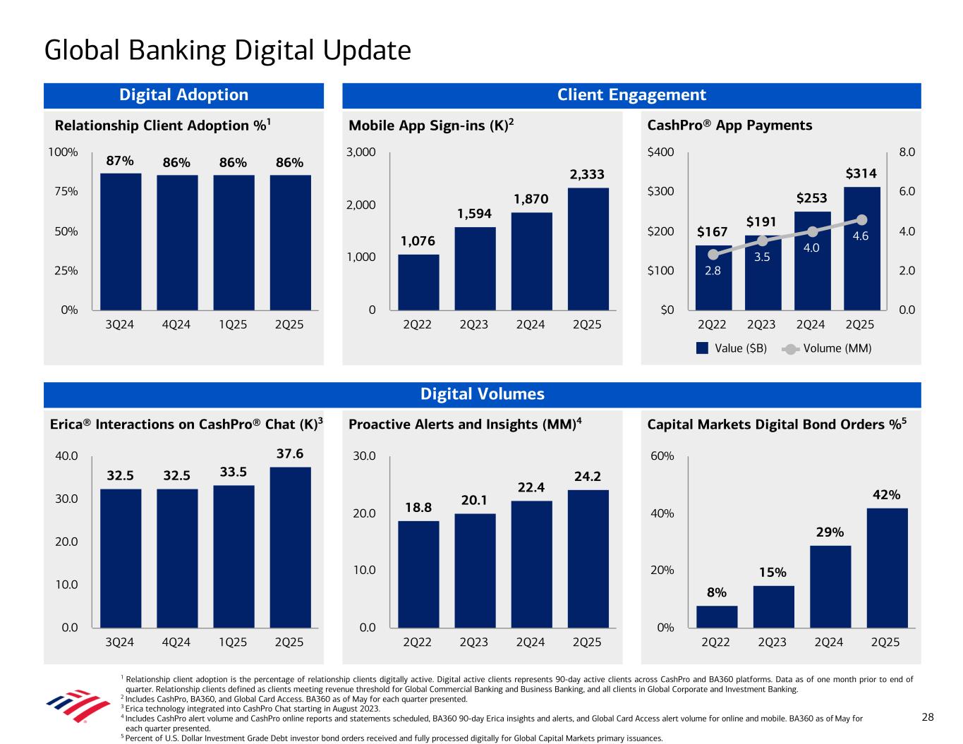 1 Relationship client adoption is the percentage of relationship clients digitally active. Digital active clients represents 90-day active clients across CashPro and BA360 platforms. Data as of one month prior to end of quarter. Relationship clients defined as clients meeting revenue threshold for Global Commercial Banking and Business Banking, and all clients in Global Corporate and Investment Banking. 2 Includes CashPro, BA360, and Global Card Access. BA360 as of May for each quarter presented. 3 Erica technology integrated into CashPro Chat starting in August 2023. 4 Includes CashPro alert volume and CashPro online reports and statements scheduled, BA360 90-day Erica insights and alerts, and Global Card Access alert volume for online and mobile. BA360 as of May for each quarter presented. 5 Percent of U.S. Dollar Investment Grade Debt investor bond orders received and fully processed digitally for Global Capital Markets primary issuances. Capital Markets Digital Bond Orders %5 Erica® Interactions on CashPro® Chat (K)3 Proactive Alerts and Insights (MM)4 8% 15% 29% 42% 2Q22 2Q23 2Q24 2Q25 0% 20% 40% 60% 18.8 20.1 22.4 24.2 2Q22 2Q23 2Q24 2Q25 0.0 10.0 20.0 30.0 32.5 32.5 33.5 37.6 3Q24 4Q24 1Q25 2Q25 0.0 10.0 20.0 30.0 40.0 CashPro® App PaymentsRelationship Client Adoption %1 Mobile App Sign-ins (K)2 $167 $191 $253 $314 2.8 3.5 4.0 4.6 Value ($B) Volume (MM) 2Q22 2Q23 2Q24 2Q25 $0 $100 $200 $300 $400 0.0 2.0 4.0 6.0 8.0 1,076 1,594 1,870 2,333 2Q22 2Q23 2Q24 2Q25 0 1,000 2,000 3,000 87% 86% 86% 86% 3Q24 4Q24 1Q25 2Q25 0% 25% 50% 75% 100% Client Engagement Digital Volumes Global Banking Digital Update 28 Digital Adoption