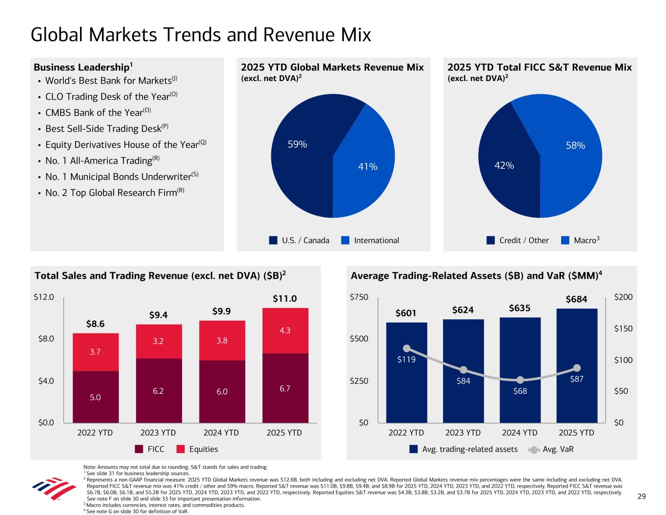 Note: Amounts may not total due to rounding. S&T stands for sales and trading. 1 See slide 31 for business leadership sources. 2 Represents a non-GAAP financial measure. 2025 YTD Global Markets revenue was $12.6B, both including and excluding net DVA. Reported Global Markets revenue mix percentages were the same including and excluding net DVA. Reported FICC S&T revenue mix was 41% credit / other and 59% macro. Reported S&T revenue was $11.0B, $9.8B, $9.4B, and $8.9B for 2025 YTD, 2024 YTD, 2023 YTD, and 2022 YTD, respectively. Reported FICC S&T revenue was $6.7B, $6.0B, $6.1B, and $5.2B for 2025 YTD, 2024 YTD, 2023 YTD, and 2022 YTD, respectively. Reported Equities S&T revenue was $4.3B, $3.8B, $3.2B, and $3.7B for 2025 YTD, 2024 YTD, 2023 YTD, and 2022 YTD, respectively. See note F on slide 30 and slide 33 for important presentation information. 3 Macro includes currencies, interest rates, and commodities products. 4 See note G on slide 30 for definition of VaR. Global Markets Trends and Revenue Mix 2025 YTD Global Markets Revenue Mix (excl. net DVA)2 Business Leadership1 • World's Best Bank for Markets(J) • CLO Trading Desk of the Year(O) • CMBS Bank of the Year(O) • Best Sell-Side Trading Desk(P) • Equity Derivatives House of the Year(Q) • No. 1 All-America Trading(R) • No. 1 Municipal Bonds Underwriter(S) • No. 2 Top Global Research Firm(R) 2025 YTD Total FICC S&T Revenue Mix (excl. net DVA)2 Total Sales and Trading Revenue (excl. net DVA) ($B)2 Average Trading-Related Assets ($B) and VaR ($MM)4 $8.6 $9.4 $9.9 $11.0 5.0 6.2 6.0 6.7 3.7 3.2 3.8 4.3 FICC Equities 2022 YTD 2023 YTD 2024 YTD 2025 YTD $0.0 $4.0 $8.0 $12.0 $601 $624 $635 $684 $119 $84 $68 $87 Avg. trading-related assets Avg. VaR 2022 YTD 2023 YTD 2024 YTD 2025 YTD $0 $250 $500 $750 $0 $50 $100 $150 $200 59% 41% U.S. / Canada International 42% 58% Credit / Other Macro 29 3
