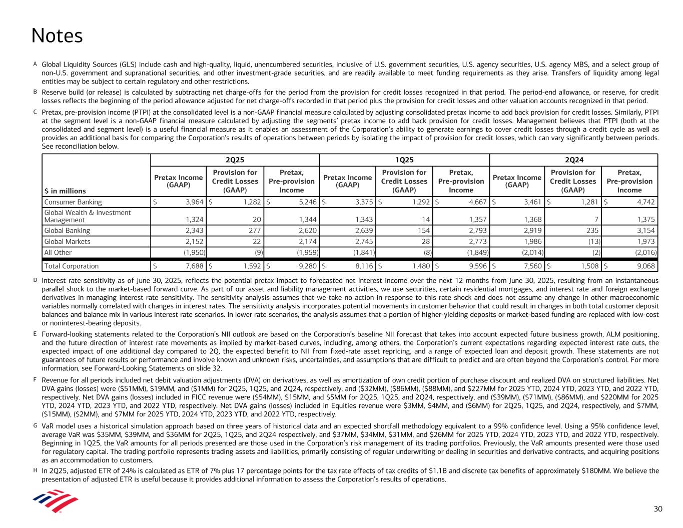 A Global Liquidity Sources (GLS) include cash and high-quality, liquid, unencumbered securities, inclusive of U.S. government securities, U.S. agency securities, U.S. agency MBS, and a select group of non-U.S. government and supranational securities, and other investment-grade securities, and are readily available to meet funding requirements as they arise. Transfers of liquidity among legal entities may be subject to certain regulatory and other restrictions. B Reserve build (or release) is calculated by subtracting net charge-offs for the period from the provision for credit losses recognized in that period. The period-end allowance, or reserve, for credit losses reflects the beginning of the period allowance adjusted for net charge-offs recorded in that period plus the provision for credit losses and other valuation accounts recognized in that period. C Pretax, pre-provision income (PTPI) at the consolidated level is a non-GAAP financial measure calculated by adjusting consolidated pretax income to add back provision for credit losses. Similarly, PTPI at the segment level is a non-GAAP financial measure calculated by adjusting the segments’ pretax income to add back provision for credit losses. Management believes that PTPI (both at the consolidated and segment level) is a useful financial measure as it enables an assessment of the Corporation’s ability to generate earnings to cover credit losses through a credit cycle as well as provides an additional basis for comparing the Corporation's results of operations between periods by isolating the impact of provision for credit losses, which can vary significantly between periods. See reconciliation below. D Interest rate sensitivity as of June 30, 2025, reflects the potential pretax impact to forecasted net interest income over the next 12 months from June 30, 2025, resulting from an instantaneous parallel shock to the market-based forward curve. As part of our asset and liability management activities, we use securities, certain residential mortgages, and interest rate and foreign exchange derivatives in managing interest rate sensitivity. The sensitivity analysis assumes that we take no action in response to this rate shock and does not assume any change in other macroeconomic variables normally correlated with changes in interest rates. The sensitivity analysis incorporates potential movements in customer behavior that could result in changes in both total customer deposit balances and balance mix in various interest rate scenarios. In lower rate scenarios, the analysis assumes that a portion of higher-yielding deposits or market-based funding are replaced with low-cost or noninterest-bearing deposits. E Forward-looking statements related to the Corporation’s NII outlook are based on the Corporation’s baseline NII forecast that takes into account expected future business growth, ALM positioning, and the future direction of interest rate movements as implied by market-based curves, including, among others, the Corporation’s current expectations regarding expected interest rate cuts, the expected impact of one additional day compared to 2Q, the expected benefit to NII from fixed-rate asset repricing, and a range of expected loan and deposit growth. These statements are not guarantees of future results or performance and involve known and unknown risks, uncertainties, and assumptions that are difficult to predict and are often beyond the Corporation’s control. For more information, see Forward-Looking Statements on slide 32. F Revenue for all periods included net debit valuation adjustments (DVA) on derivatives, as well as amortization of own credit portion of purchase discount and realized DVA on structured liabilities. Net DVA gains (losses) were ($51MM), $19MM, and ($1MM) for 2Q25, 1Q25, and 2Q24, respectively, and ($32MM), ($86MM), ($88MM), and $227MM for 2025 YTD, 2024 YTD, 2023 YTD, and 2022 YTD, respectively. Net DVA gains (losses) included in FICC revenue were ($54MM), $15MM, and $5MM for 2Q25, 1Q25, and 2Q24, respectively, and ($39MM), ($71MM), ($86MM), and $220MM for 2025 YTD, 2024 YTD, 2023 YTD, and 2022 YTD, respectively. Net DVA gains (losses) included in Equities revenue were $3MM, $4MM, and ($6MM) for 2Q25, 1Q25, and 2Q24, respectively, and $7MM, ($15MM), ($2MM), and $7MM for 2025 YTD, 2024 YTD, 2023 YTD, and 2022 YTD, respectively. G VaR model uses a historical simulation approach based on three years of historical data and an expected shortfall methodology equivalent to a 99% confidence level. Using a 95% confidence level, average VaR was $35MM, $39MM, and $36MM for 2Q25, 1Q25, and 2Q24 respectively, and $37MM, $34MM, $31MM, and $26MM for 2025 YTD, 2024 YTD, 2023 YTD, and 2022 YTD, respectively. Beginning in 1Q25, the VaR amounts for all periods presented are those used in the Corporation’s risk management of its trading portfolios. Previously, the VaR amounts presented were those used for regulatory capital. The trading portfolio represents trading assets and liabilities, primarily consisting of regular underwriting or dealing in securities and derivative contracts, and acquiring positions as an accommodation to customers. H In 2Q25, adjusted ETR of 24% is calculated as ETR of 7% plus 17 percentage points for the tax rate effects of tax credits of $1.1B and discrete tax benefits of approximately $180MM. We believe the presentation of adjusted ETR is useful because it provides additional information to assess the Corporation’s results of operations. Notes $ in millions 2Q25 1Q25 2Q24 Pretax Income (GAAP) Provision for Credit Losses (GAAP) Pretax, Pre-provision Income Pretax Income (GAAP) Provision for Credit Losses (GAAP) Pretax, Pre-provision Income Pretax Income (GAAP) Provision for Credit Losses (GAAP) Pretax, Pre-provision Income Consumer Banking $ 3,964 $ 1,282 $ 5,246 $ 3,375 $ 1,292 $ 4,667 $ 3,461 $ 1,281 $ 4,742 Global Wealth & Investment Management 1,324 20 1,344 1,343 14 1,357 1,368 7 1,375 Glo