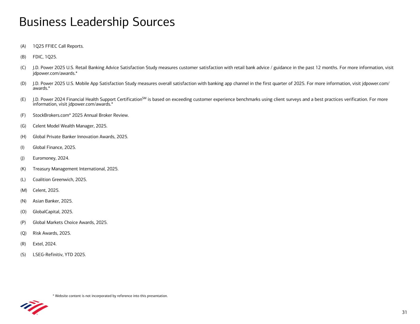 Business Leadership Sources (A) 1Q25 FFIEC Call Reports. (B) FDIC, 1Q25. (C) J.D. Power 2025 U.S. Retail Banking Advice Satisfaction Study measures customer satisfaction with retail bank advice / guidance in the past 12 months. For more information, visit jdpower.com/awards.* (D) J.D. Power 2025 U.S. Mobile App Satisfaction Study measures overall satisfaction with banking app channel in the first quarter of 2025. For more information, visit jdpower.com/ awards.* (E) J.D. Power 2024 Financial Health Support CertificationSM is based on exceeding customer experience benchmarks using client surveys and a best practices verification. For more information, visit jdpower.com/awards.* (F) StockBrokers.com* 2025 Annual Broker Review. (G) Celent Model Wealth Manager, 2025. (H) Global Private Banker Innovation Awards, 2025. (I) Global Finance, 2025. (J) Euromoney, 2024. (K) Treasury Management International, 2025. (L) Coalition Greenwich, 2025. (M) Celent, 2025. (N) Asian Banker, 2025. (O) GlobalCapital, 2025. (P) Global Markets Choice Awards, 2025. (Q) Risk Awards, 2025. (R) Extel, 2024. (S) LSEG-Refinitiv, YTD 2025. 31 * Website content is not incorporated by reference into this presentation.