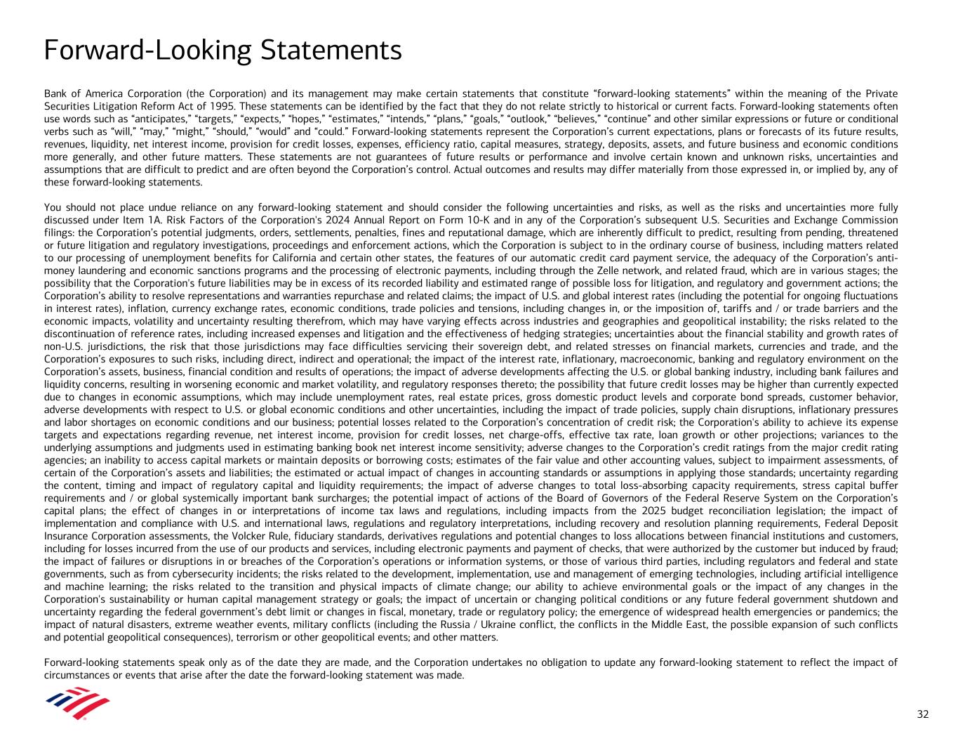 Forward-Looking Statements Bank of America Corporation (the Corporation) and its management may make certain statements that constitute “forward-looking statements” within the meaning of the Private Securities Litigation Reform Act of 1995. These statements can be identified by the fact that they do not relate strictly to historical or current facts. Forward-looking statements often use words such as “anticipates,” “targets,” “expects,” “hopes,” “estimates,” “intends,” “plans,” “goals,” “outlook,” “believes,” “continue” and other similar expressions or future or conditional verbs such as “will,” “may,” “might,” “should,” “would” and “could.” Forward-looking statements represent the Corporation’s current expectations, plans or forecasts of its future results, revenues, liquidity, net interest income, provision for credit losses, expenses, efficiency ratio, capital measures, strategy, deposits, assets, and future business and economic conditions more generally, and other future matters. These statements are not guarantees of future results or performance and involve certain known and unknown risks, uncertainties and assumptions that are difficult to predict and are often beyond the Corporation’s control. Actual outcomes and results may differ materially from those expressed in, or implied by, any of these forward-looking statements. You should not place undue reliance on any forward-looking statement and should consider the following uncertainties and risks, as well as the risks and uncertainties more fully discussed under Item 1A. Risk Factors of the Corporation's 2024 Annual Report on Form 10-K and in any of the Corporation’s subsequent U.S. Securities and Exchange Commission filings: the Corporation’s potential judgments, orders, settlements, penalties, fines and reputational damage, which are inherently difficult to predict, resulting from pending, threatened or future litigation and regulatory investigations, proceedings and enforcement actions, which the Corporation is subject to in the ordinary course of business, including matters related to our processing of unemployment benefits for California and certain other states, the features of our automatic credit card payment service, the adequacy of the Corporation’s anti- money laundering and economic sanctions programs and the processing of electronic payments, including through the Zelle network, and related fraud, which are in various stages; the possibility that the Corporation's future liabilities may be in excess of its recorded liability and estimated range of possible loss for litigation, and regulatory and government actions; the Corporation’s ability to resolve representations and warranties repurchase and related claims; the impact of U.S. and global interest rates (including the potential for ongoing fluctuations in interest rates), inflation, currency exchange rates, economic conditions, trade policies and tensions, including changes in, or the imposition of, tariffs and / or trade barriers and the economic impacts, volatility and uncertainty resulting therefrom, which may have varying effects across industries and geographies and geopolitical instability; the risks related to the discontinuation of reference rates, including increased expenses and litigation and the effectiveness of hedging strategies; uncertainties about the financial stability and growth rates of non-U.S. jurisdictions, the risk that those jurisdictions may face difficulties servicing their sovereign debt, and related stresses on financial markets, currencies and trade, and the Corporation’s exposures to such risks, including direct, indirect and operational; the impact of the interest rate, inflationary, macroeconomic, banking and regulatory environment on the Corporation’s assets, business, financial condition and results of operations; the impact of adverse developments affecting the U.S. or global banking industry, including bank failures and liquidity concerns, resulting in worsening economic and market volatility, and regulatory responses thereto; the possibility that future credit losses may be higher than currently expected due to changes in economic assumptions, which may include unemployment rates, real estate prices, gross domestic product levels and corporate bond spreads, customer behavior, adverse developments with respect to U.S. or global economic conditions and other uncertainties, including the impact of trade policies, supply chain disruptions, inflationary pressures and labor shortages on economic conditions and our business; potential losses related to the Corporation’s concentration of credit risk; the Corporation's ability to achieve its expense targets and expectations regarding revenue, net interest income, provision for credit losses, net charge-offs, effective tax rate, loan growth or other projections; variances to the underlying assumptions and judgments used in estimating banking book net interest income sensitivity; adverse changes to the Corporation’s credit ratings from the major credit rating agencies; an inability to access capital markets or maintain deposits or borrowing costs; estimates of the fair value and other accounting values, subject to impairment assessments, of certain of the Corporation’s assets and liabilities; the estimated or actual impact of changes in accounting standards or assumptions in applying those standards; uncertainty regarding the content, timing and impact of regulatory capital and liquidity requirements; the impact of adverse changes to total loss-absorbing capacity requirements, stress capital buffer requirements and / or global systemically important bank surcharges; the potential impact of actions of the Board of Governors of the Federal Reserve System on the Corporation’s capital plans; the effect of changes in or interpretations of income tax laws and regulations, including impacts from the