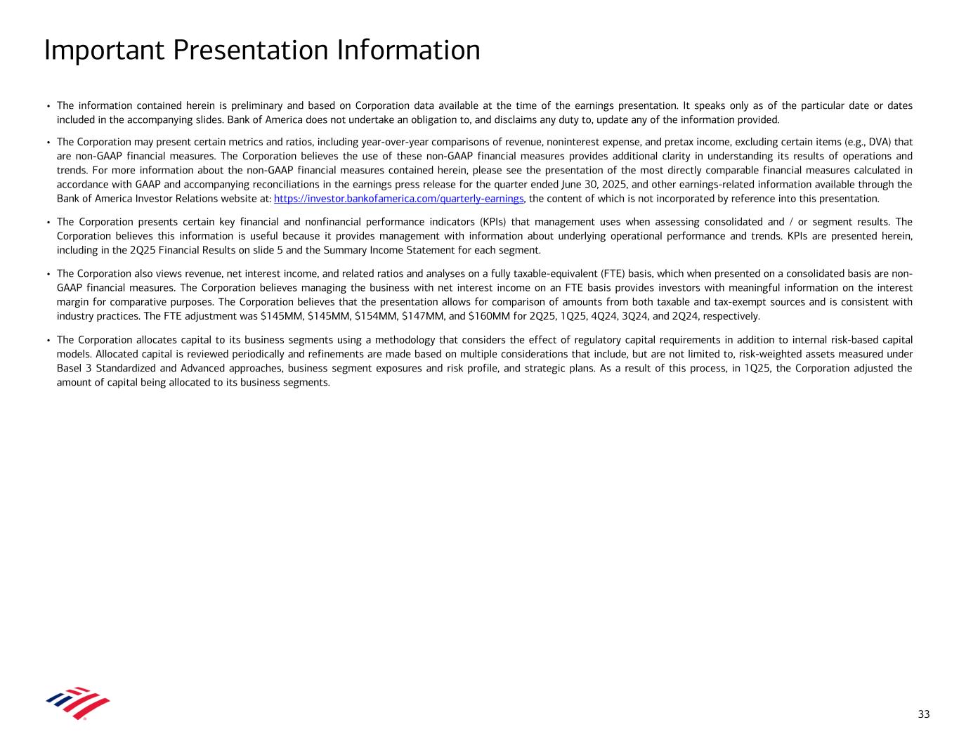 Important Presentation Information 33 • The information contained herein is preliminary and based on Corporation data available at the time of the earnings presentation. It speaks only as of the particular date or dates included in the accompanying slides. Bank of America does not undertake an obligation to, and disclaims any duty to, update any of the information provided. • The Corporation may present certain metrics and ratios, including year-over-year comparisons of revenue, noninterest expense, and pretax income, excluding certain items (e.g., DVA) that are non-GAAP financial measures. The Corporation believes the use of these non-GAAP financial measures provides additional clarity in understanding its results of operations and trends. For more information about the non-GAAP financial measures contained herein, please see the presentation of the most directly comparable financial measures calculated in accordance with GAAP and accompanying reconciliations in the earnings press release for the quarter ended June 30, 2025, and other earnings-related information available through the Bank of America Investor Relations website at: https://investor.bankofamerica.com/quarterly-earnings, the content of which is not incorporated by reference into this presentation. • The Corporation presents certain key financial and nonfinancial performance indicators (KPIs) that management uses when assessing consolidated and / or segment results. The Corporation believes this information is useful because it provides management with information about underlying operational performance and trends. KPIs are presented herein, including in the 2Q25 Financial Results on slide 5 and the Summary Income Statement for each segment. • The Corporation also views revenue, net interest income, and related ratios and analyses on a fully taxable-equivalent (FTE) basis, which when presented on a consolidated basis are non- GAAP financial measures. The Corporation believes managing the business with net interest income on an FTE basis provides investors with meaningful information on the interest margin for comparative purposes. The Corporation believes that the presentation allows for comparison of amounts from both taxable and tax-exempt sources and is consistent with industry practices. The FTE adjustment was $145MM, $145MM, $154MM, $147MM, and $160MM for 2Q25, 1Q25, 4Q24, 3Q24, and 2Q24, respectively. • The Corporation allocates capital to its business segments using a methodology that considers the effect of regulatory capital requirements in addition to internal risk-based capital models. Allocated capital is reviewed periodically and refinements are made based on multiple considerations that include, but are not limited to, risk-weighted assets measured under Basel 3 Standardized and Advanced approaches, business segment exposures and risk profile, and strategic plans. As a result of this process, in 1Q25, the Corporation adjusted the amount of capital being allocated to its business segments.