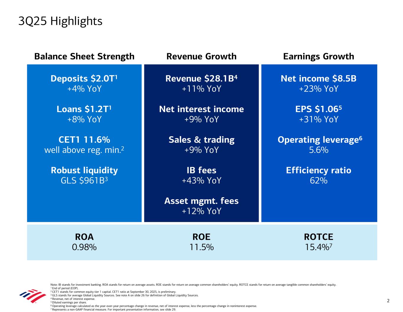 Note: IB stands for investment banking. ROA stands for return on average assets. ROE stands for return on average common shareholders’ equity. ROTCE stands for return on average tangible common shareholders’ equity. 1 End of period (EOP). 2 CET1 stands for common equity tier 1 capital. CET1 ratio at September 30, 2025, is preliminary. 3 GLS stands for average Global Liquidity Sources. See note A on slide 26 for definition of Global Liquidity Sources. 4 Revenue, net of interest expense. 5 Diluted earnings per share. 6 Operating leverage calculated as the year-over-year percentage change in revenue, net of interest expense, less the percentage change in noninterest expense. 7 Represents a non-GAAP financial measure. For important presentation information, see slide 29. 3Q25 Highlights 2 Balance Sheet Strength Revenue Growth Earnings Growth Deposits $2.0T1 +4% YoY Loans $1.2T1 +8% YoY CET1 11.6% well above reg. min.2 Robust liquidity GLS $961B3 Revenue $28.1B4 +11% YoY Net interest income +9% YoY Sales & trading +9% YoY IB fees +43% YoY Asset mgmt. fees +12% YoY Net income $8.5B +23% YoY EPS $1.065 +31% YoY Operating leverage6 5.6% Efficiency ratio 62% ROA 0.98% ROE 11.5% ROTCE 15.4%7