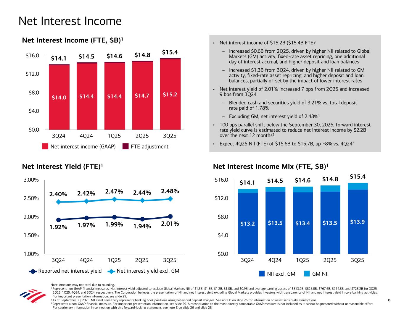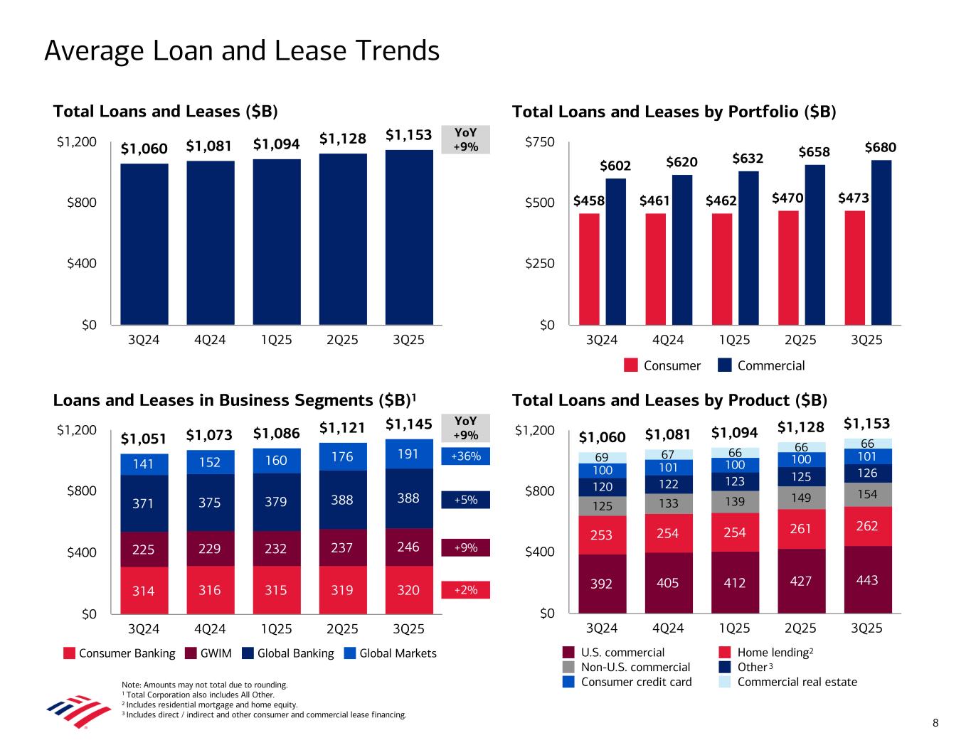 $1,051 $1,073 $1,086 $1,121 $1,145 314 316 315 319 320 225 229 232 237 246 371 375 379 388 388 141 152 160 176 191 Consumer Banking GWIM Global Banking Global Markets 3Q24 4Q24 1Q25 2Q25 3Q25 $0 $400 $800 $1,200 $1,060 $1,081 $1,094 $1,128 $1,153 3Q24 4Q24 1Q25 2Q25 3Q25 $0 $400 $800 $1,200 +2% +9% +5% +36% Average Loan and Lease Trends YoY +9% YoY +9% Note: Amounts may not total due to rounding. 1 Total Corporation also includes All Other. 2 Includes residential mortgage and home equity. 3 Includes direct / indirect and other consumer and commercial lease financing. Total Loans and Leases by Product ($B) Loans and Leases in Business Segments ($B)1 Total Loans and Leases by Portfolio ($B)Total Loans and Leases ($B) $458 $461 $462 $470 $473 $602 $620 $632 $658 $680 Consumer Commercial 3Q24 4Q24 1Q25 2Q25 3Q25 $0 $250 $500 $750 8 $1,060 $1,081 $1,094 $1,128 $1,153 392 405 412 427 443 253 254 254 261 262 125 133 139 149 154 120 122 123 125 126100 101 100 100 10169 67 66 66 66 U.S. commercial Home lending Non-U.S. commercial Other Consumer credit card Commercial real estate 3Q24 4Q24 1Q25 2Q25 3Q25 $0 $400 $800 $1,200 3 2