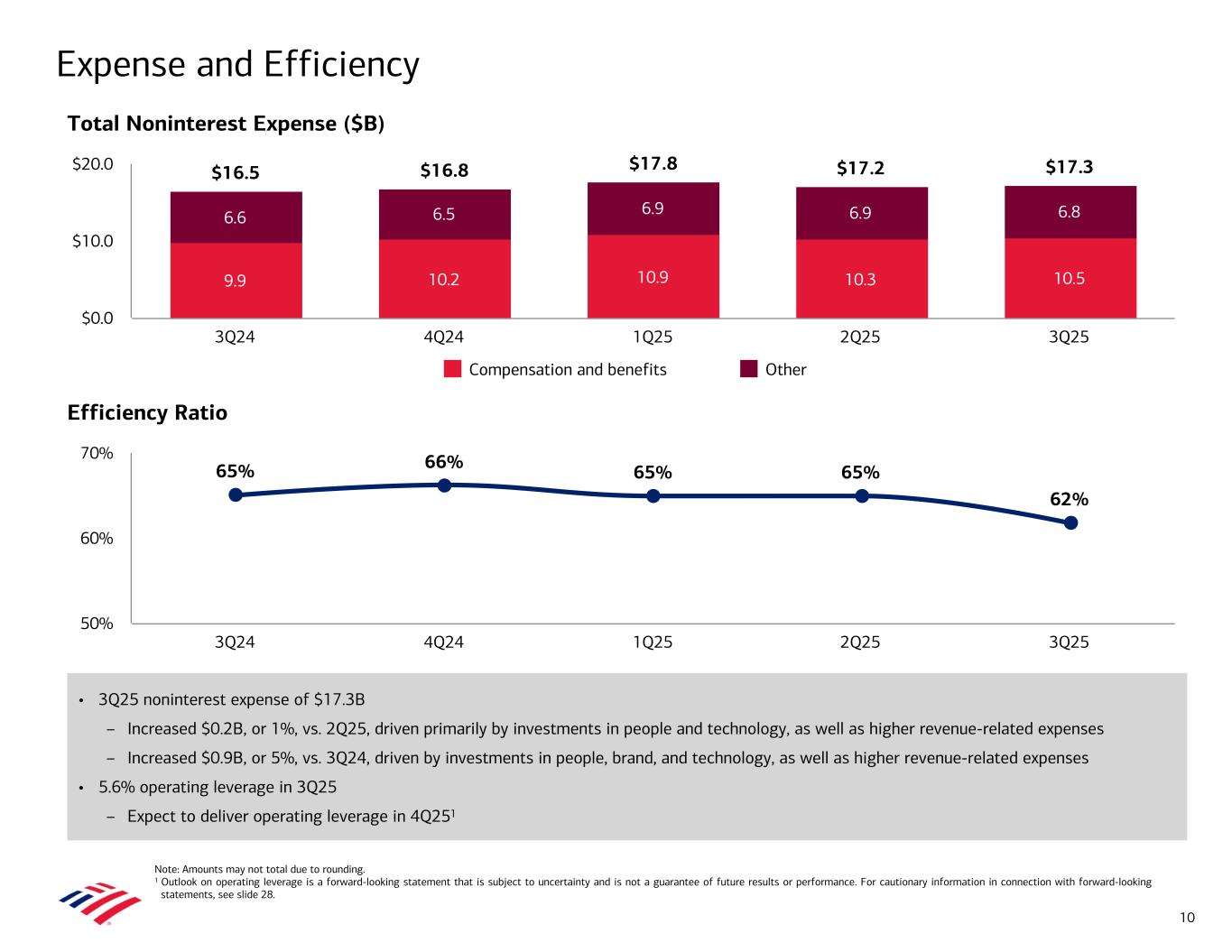 • Net interest income of $15.2B ($15.4B FTE)1 – Increased $0.6B from 2Q25, driven by higher NII related to Global Markets (GM) activity, fixed-rate asset repricing, one additional day of interest accrual, and higher deposit and loan balances – Increased $1.3B from 3Q24, driven by higher NII related to GM activity, fixed-rate asset repricing, and higher deposit and loan balances, partially offset by the impact of lower interest rates • Net interest yield of 2.01% increased 7 bps from 2Q25 and increased 9 bps from 3Q24 – Blended cash and securities yield of 3.21% vs. total deposit rate paid of 1.78% – Excluding GM, net interest yield of 2.48%1 • 100 bps parallel shift below the September 30, 2025, forward interest rate yield curve is estimated to reduce net interest income by $2.2B over the next 12 months2 • Expect 4Q25 NII (FTE) of $15.6B to $15.7B, up ~8% vs. 4Q243 Net Interest Income (FTE, $B)1 Net Interest Income Net Interest Yield (FTE)1 Note: Amounts may not total due to rounding. 1 Represent non-GAAP financial measures. Net interest yield adjusted to exclude Global Markets NII of $1.5B, $1.3B, $1.2B, $1.0B, and $0.9B and average earning assets of $813.2B, $825.8B, $767.6B, $714.8B, and $728.2B for 3Q25, 2Q25, 1Q25, 4Q24, and 3Q24, respectively. The Corporation believes the presentation of NII and net interest yield excluding Global Markets provides investors with transparency of NII and net interest yield in core banking activities. For important presentation information, see slide 29. 2 As of September 30, 2025. NII asset sensitivity represents banking book positions using behavioral deposit changes. See note D on slide 26 for information on asset sensitivity assumptions. 3 Represents a non-GAAP financial measure. For important presentation information, see slide 29. A reconciliation to the most directly comparable GAAP measure is not included as it cannot be prepared without unreasonable effort. For cautionary information in connection with this forward-looking statement, see note E on slide 26 and slide 28. 1.92% 1.97% 1.99% 1.94% 2.01% 2.40% 2.42% 2.47% 2.44% 2.48% Reported net interest yield Net interest yield excl. GM 3Q24 4Q24 1Q25 2Q25 3Q25 1.00% 1.50% 2.00% 2.50% 3.00% $14.1 $14.5 $14.6 $14.8 $15.4 $14.0 $14.4 $14.4 $14.7 $15.2 Net interest income (GAAP) FTE adjustment 3Q24 4Q24 1Q25 2Q25 3Q25 $0.0 $4.0 $8.0 $12.0 $16.0 9 Net Interest Income Mix (FTE, $B)1 $14.1 $14.5 $14.6 $14.8 $15.4 $13.2 $13.5 $13.4 $13.5 $13.9 NII excl. GM GM NII 3Q24 4Q24 1Q25 2Q25 3Q25 $0.0 $4.0 $8.0 $12.0 $16.0