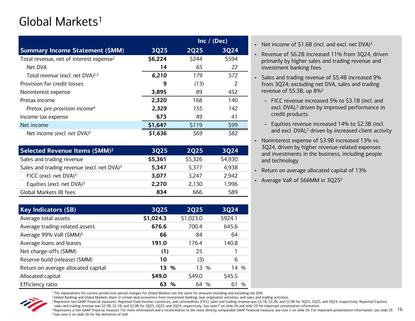 Global Banking 1 Global Banking and Global Markets share in certain deal economics from investment banking (IB), loan origination activities, and sales and trading activities. 2 Represents a non-GAAP financial measure. For more information and a reconciliation to the most directly comparable GAAP financial measure, see note C on slide 26. For important presentation information, see slide 29. Inc / (Dec) Summary Income Statement ($MM) 3Q25 2Q25 3Q24 Total revenue, net of interest expense1 $6,245 $555 $411 Provision for credit losses 269 (8) 40 Noninterest expense 3,044 (26) 53 Pretax income 2,932 589 318 Pretax, pre-provision income2 3,201 581 358 Income tax expense 806 162 87 Net income $2,126 $427 $231 Selected Revenue Items ($MM) 3Q25 2Q25 3Q24 Total Corporation IB fees (excl. self-led)1 $2,013 $1,428 $1,403 Global Banking IB fees1 1,155 767 783 Business Lending revenue 2,292 2,203 2,405 Global Transaction Services revenue 2,739 2,649 2,580 Key Indicators ($B) 3Q25 2Q25 3Q24 Average deposits $631.6 $603.4 $549.6 Average loans and leases 388.5 387.9 371.2 Net charge-off ratio 0.26 % 0.32 % 0.39 % Net charge-offs ($MM) $250 $303 $358 Reserve build (release) ($MM) 19 (26) (129) Return on average allocated capital 17 % 13 % 15 % Allocated capital $50.8 $50.8 $49.3 Efficiency ratio 49 % 54 % 51 % 15 • Net income of $2.1B • Revenue of $6.2B increased 7% from 3Q24, driven primarily by higher investment banking fees and treasury services charges, partially offset by lower net interest income – Total Corporation investment banking fees (excl. self-led) of $2.0B increased 43% vs. 3Q24 • Provision for credit losses of $269MM vs. $229MM in 3Q24 – Net reserve build of $19MM vs. net reserve release of $129MM in 3Q24 – Net charge-offs of $250MM decreased $108MM from 3Q24 • Noninterest expense of $3.0B increased 2% vs. 3Q24, driven by investments in the business, including people • Return on average allocated capital of 17% • Average deposits of $632B increased $82B, or 15%, from 3Q24 • Average loans and leases of $388B increased $17B, or 5%, from 3Q24