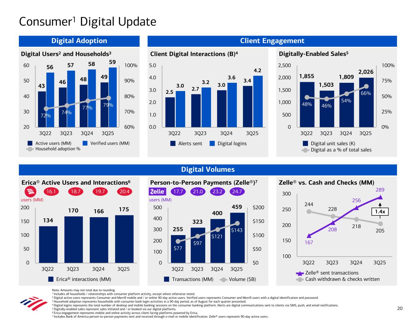 Erica® Active Users and Interactions6 Zelle® vs. Cash and Checks (MM) Digitally-Enabled Sales5Digital Users2 and Households3 Client Digital Interactions (B)4 1,855 1,503 1,809 2,026 48% 46% 54% 66% Digital unit sales (K) Digital as a % of total sales 3Q22 3Q23 3Q24 3Q25 0 500 1,000 1,500 2,000 2,500 0% 25% 50% 75% 100% 2.5 2.7 3.0 3.4 3.0 3.2 3.6 4.2 Alerts sent Digital logins 3Q22 3Q23 3Q24 3Q25 0.0 1.0 2.0 3.0 4.0 5.0 43 46 48 49 56 57 58 59 72% 74% 77% 79% Active users (MM) Verified users (MM) Household adoption % 3Q22 3Q23 3Q24 3Q25 20 30 40 50 60 60% 70% 80% 90% 100% Client Engagement Person-to-Person Payments (Zelle®)7 Digital Volumes 255 323 400 459 $77 $97 $121 $143 Transactions (MM) Volume ($B) 3Q22 3Q23 3Q24 3Q25 0 100 200 300 400 500 $0 $50 $100 $150 $200 Consumer1 Digital Update Note: Amounts may not total due to rounding. 1 Includes all households / relationships with consumer platform activity, except where otherwise noted. 2 Digital active users represents Consumer and Merrill mobile and / or online 90-day active users. Verified users represents Consumer and Merrill users with a digital identification and password. 3 Household adoption represents households with consumer bank login activities in a 90-day period, as of August for each quarter presented. 4 Digital logins represents the total number of desktop and mobile banking sessions on the consumer banking platform. Alerts are digital communications sent to clients via SMS, push, and email notifications. 5 Digitally-enabled sales represent sales initiated and / or booked via our digital platforms. 6 Erica engagement represents mobile and online activity across client facing platforms powered by Erica. 7 Includes Bank of America person-to-person payments sent and received through e-mail or mobile identification. Zelle® users represent 90-day active users. 17.7 21.0 23.2 24.7 users (MM) 20 Digital Adoption 134 170 166 175 Erica® interactions (MM) 3Q22 3Q23 3Q24 3Q25 0 50 100 150 200 244 228 218 205 167 208 256 289 Zelle® sent transactions Cash withdrawn & checks written 3Q22 3Q23 3Q24 3Q25 100 150 200 250 300 1.4x 16.1 18.7 19.7 20.4 users (MM)