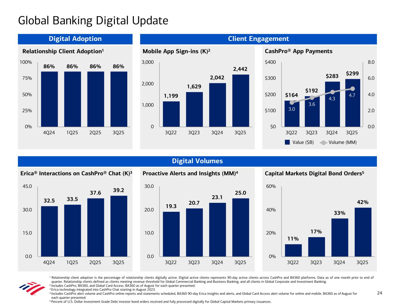 1 Relationship client adoption is the percentage of relationship clients digitally active. Digital active clients represents 90-day active clients across CashPro and BA360 platforms. Data as of one month prior to end of quarter. Relationship clients defined as clients meeting revenue threshold for Global Commercial Banking and Business Banking, and all clients in Global Corporate and Investment Banking. 2 Includes CashPro, BA360, and Global Card Access. BA360 as of August for each quarter presented. 3 Erica technology integrated into CashPro Chat starting in August 2023. 4 Includes CashPro alert volume and CashPro online reports and statements scheduled, BA360 90-day Erica insights and alerts, and Global Card Access alert volume for online and mobile. BA360 as of August for each quarter presented. 5 Percent of U.S. Dollar Investment Grade Debt investor bond orders received and fully processed digitally for Global Capital Markets primary issuances. Capital Markets Digital Bond Orders5 Erica® Interactions on CashPro® Chat (K)3 Proactive Alerts and Insights (MM)4 11% 17% 33% 42% 3Q22 3Q23 3Q24 3Q25 0% 20% 40% 60% 19.3 20.7 23.1 25.0 3Q22 3Q23 3Q24 3Q25 0.0 10.0 20.0 30.0 32.5 33.5 37.6 39.2 4Q24 1Q25 2Q25 3Q25 0.0 15.0 30.0 45.0 CashPro® App PaymentsRelationship Client Adoption1 Mobile App Sign-ins (K)2 $164 $192 $283 $299 3.0 3.6 4.3 4.7 Value ($B) Volume (MM) 3Q22 3Q23 3Q24 3Q25 $0 $100 $200 $300 $400 0.0 2.0 4.0 6.0 8.0 1,199 1,629 2,042 2,442 3Q22 3Q23 3Q24 3Q25 0 1,000 2,000 3,000 86% 86% 86% 86% 4Q24 1Q25 2Q25 3Q25 0% 25% 50% 75% 100% Client Engagement Digital Volumes Global Banking Digital Update 24 Digital Adoption