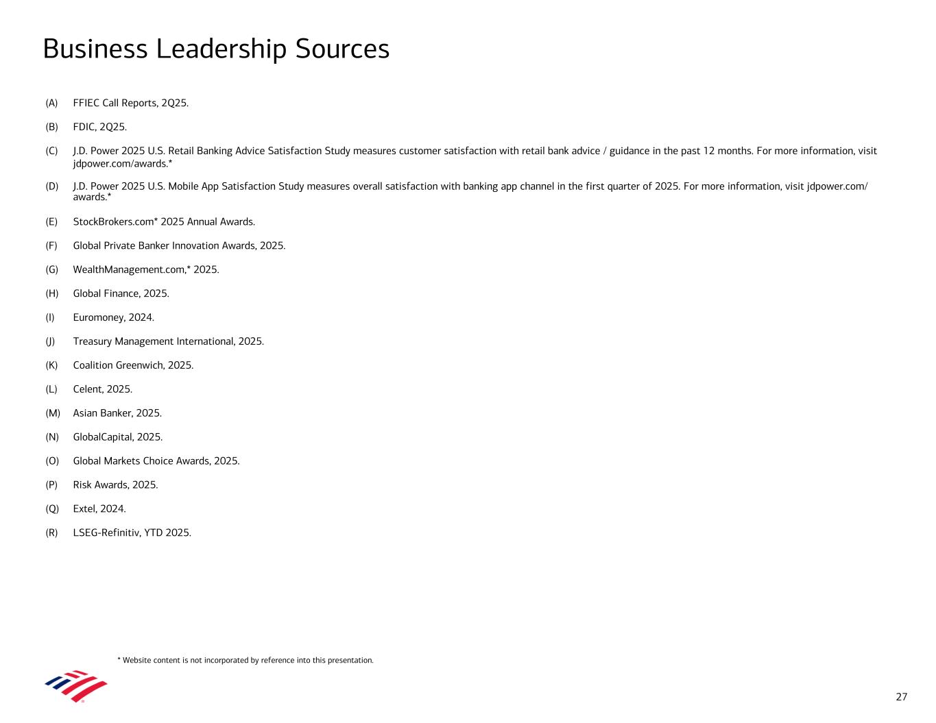 Business Leadership Sources (A) FFIEC Call Reports, 2Q25. (B) FDIC, 2Q25. (C) J.D. Power 2025 U.S. Retail Banking Advice Satisfaction Study measures customer satisfaction with retail bank advice / guidance in the past 12 months. For more information, visit jdpower.com/awards.* (D) J.D. Power 2025 U.S. Mobile App Satisfaction Study measures overall satisfaction with banking app channel in the first quarter of 2025. For more information, visit jdpower.com/ awards.* (E) StockBrokers.com* 2025 Annual Awards. (F) Global Private Banker Innovation Awards, 2025. (G) WealthManagement.com,* 2025. (H) Global Finance, 2025. (I) Euromoney, 2024. (J) Treasury Management International, 2025. (K) Coalition Greenwich, 2025. (L) Celent, 2025. (M) Asian Banker, 2025. (N) GlobalCapital, 2025. (O) Global Markets Choice Awards, 2025. (P) Risk Awards, 2025. (Q) Extel, 2024. (R) LSEG-Refinitiv, YTD 2025. 27 * Website content is not incorporated by reference into this presentation.