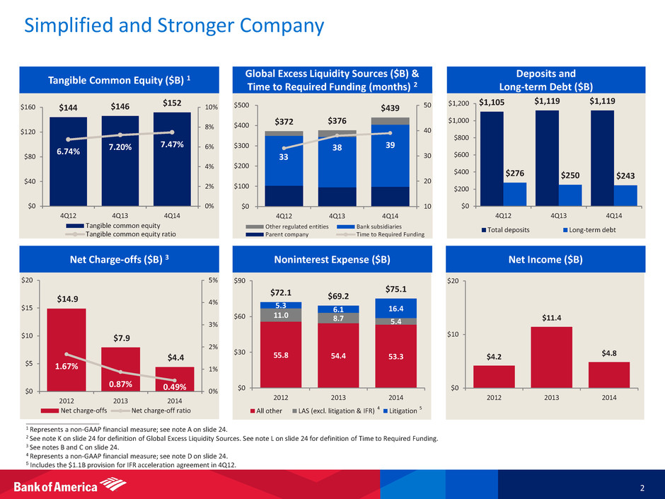 Simplified and Stronger Company $144 $146 $152 6.74% 7.20% 7.47% 0% 2% 4% 6% 8% 10% $0 $40 $80 $120 $160 4Q12 4Q13 4Q14 Tangible common equity Tangible common equity ratio 55.8 54.4 53.3 11.0 8.7 5.4 5.3 6.1 16.4 $72.1 $69.2 $75.1 $0 $30 $60 $90 2012 2013 2014 All other LAS (excl. litigation & IFR) Litigation $372 $376 $439 33 38 39 10 20 30 40 50 $0 $100 $200 $300 $400 $500 4Q12 4Q13 4Q14 Other regulated entities Bank subsidiaries Parent company Time to Required Funding Global Excess Liquidity Sources ($B) & Time to Required Funding (months) 2 Tangible Common Equity ($B) 1 2 $1,105 $1,119 $1,119 $276 $250 $243 $0 $200 $400 $600 $800 $1,000 $1,200 4Q12 4Q13 4Q14 Total deposits Long-term debt Noninterest Expense ($B) Deposits and Long-term Debt ($B) ____________________ 1 Represents a non-GAAP financial measure; see note A on slide 24. 2 See note K on slide 24 for definition of Global Excess Liquidity Sources. See note L on slide 24 for definition of Time to Required Funding. 3 See notes B and C on slide 24. 4 Represents a non-GAAP financial measure; see note D on slide 24. 5 Includes the $1.1B provision for IFR acceleration agreement in 4Q12. 4 $14.9 $7.9 $4.4 1.67% 0.87% 0.49% 0% 1% 2% 3% 4% 5% $0 $5 $10 $15 $20 2012 2013 2014 Net charge-offs Net charge-off ratio Net Charge-offs ($B) 3 $4.2 $11.4 $4.8 $0 $10 $20 2012 2013 2014 Net Income ($B) 5
