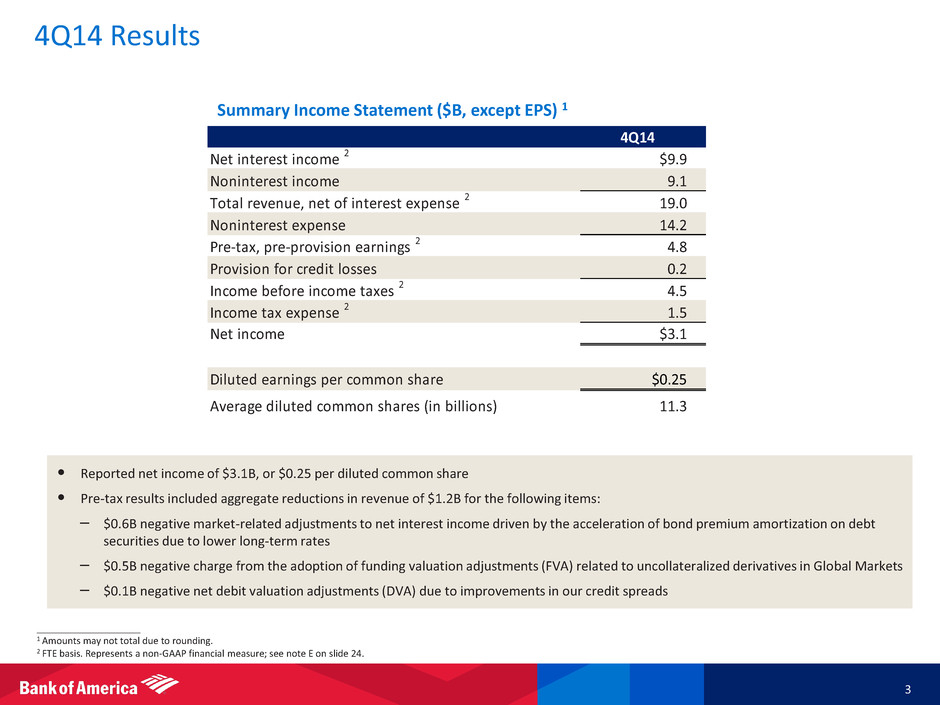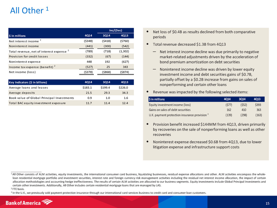 ____________________ 1 FTE basis. FTE basis for the total Corporation and pre-tax, pre-provision earnings are non-GAAP financial measures. Results by Business Segment $ in millions Total Corporation CBB CRES GWIM Global Banking Global Markets All Other Net interest income 1 $9,865 $4,853 $714 $1,407 $2,207 $1,032 ($348) Card income 1,610 1,339 - 54 108 20 89 Service charges 1,844 1,093 - 19 667 65 - Investment and brokerage services 3,397 66 - 2,763 27 540 1 Investment banking income (loss) 1,541 - (1) 72 830 670 (30) Equity investment income (loss) (20) 41 - 1 - 15 (77) Trading account profits (losses) 111 - - 39 (9) 76 5 Mortgage banking income (loss) 352 - 435 1 - - (84) Gains on sales of debt securities 163 - 1 - - - 162 Other income (loss) 92 149 25 246 227 (48) (507) Total noninterest income 9,090 2,688 460 3,195 1,850 1,338 (441) Total revenue, net of interest expense 1 18,955 7,541 1,174 4,602 4,057 2,370 (789) Total noninterest expense 14,196 4,015 1,945 3,440 1,849 2,499 448 Pre-tax, pre-provision earnings (loss) 1 4,759 3,526 (771) 1,162 2,208 (129) (1,237) Provision for credit losses 219 670 (131) 14 (29) 27 (332) Income (loss) before income taxes 1 4,540 2,856 (640) 1,148 2,237 (156) (905) Income tax expense (benefit) 1 1,490 1,098 (243) 442 804 (84) (527) Net income (loss) $3,050 $1,758 ($397) $706 $1,433 ($72) ($378) 4Q14 18