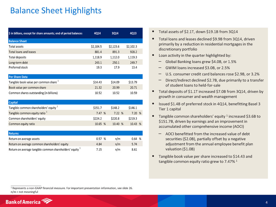 4Q14 Results 3 ____________________ 1 Amounts may not total due to rounding. 2 FTE basis. Represents a non-GAAP financial measure; see note E on slide 24. 4Q14 Net interest income 2 $9.9 Noninterest income 9.1 Total revenue, net of interest expense 2 19.0 Noninterest expense 14.2 Pre-tax, pre-provision earnings 2 4.8 Provision for credit losses 0.2 Income before income taxes 2 4.5 Income tax expense 2 1.5 Net income $3.1 Diluted earnings per common share $0.25 Average diluted common shares (in billions) 11.3 Summary Income Statement ($B, except EPS) 1 • Reported net income of $3.1B, or $0.25 per diluted common share • Pre-tax results included aggregate reductions in revenue of $1.2B for the following items: – $0.6B negative market-related adjustments to net interest income driven by the acceleration of bond premium amortization on debt securities due to lower long-term rates – $0.5B negative charge from the adoption of funding valuation adjustments (FVA) related to uncollateralized derivatives in Global Markets – $0.1B negative net debit valuation adjustments (DVA) due to improvements in our credit spreads