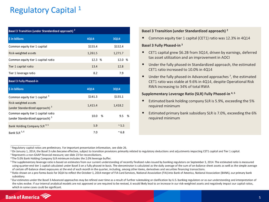 ____________________ 1 Represents a non-GAAP financial measure. For important presentation information, see slide 26. n/m = not meaningful Balance Sheet Highlights 4 • Total assets of $2.1T, down $19.1B from 3Q14 • Total loans and leases declined $9.9B from 3Q14, driven primarily by a reduction in residential mortgages in the discretionary portfolio • Loan activity in the quarter highlighted by: – Global Banking loans grew $4.0B, or 1.5% – GWIM loans increased $3.0B, or 2.5% – U.S. consumer credit card balances rose $2.9B, or 3.2% – Direct/Indirect declined $2.7B, due primarily to a transfer of student loans to held-for-sale • Total deposits of $1.1T increased $7.0B from 3Q14, driven by growth in consumer and wealth management • Issued $1.4B of preferred stock in 4Q14, benefitting Basel 3 Tier 1 capital • Tangible common shareholders’ equity 1 increased $3.6B to $151.7B, driven by earnings and an improvement in accumulated other comprehensive income (AOCI) – AOCI benefitted from the increased value of debt securities ($2.0B), partially offset by a negative adjustment from the annual employee benefit plan valuation ($1.0B) • Tangible book value per share increased to $14.43 and tangible common equity ratio grew to 7.47% 1 $ in billions, except for share amounts; end of period balances Balance Sheet Total assets $2,104.5 $2,123.6 $2,102.3 Total loans and leases 881.4 891.3 928.2 Total deposits 1,118.9 1,112.0 1,119.3 Long-term debt 243.1 250.1 249.7 Preferred stock 19.3 17.9 13.4 Per Share Data Tangible book value per common share 1 $14.43 $14.09 $13.79 Book value per common share 21.32 20.99 20.71 Common shares outstanding (in billions) 10.52 10.52 10.59 Capital Tangible common shareholders' equity 1 $151.7 $148.2 $146.1 Tangible common equity ratio 1 7.47 % 7.22 % 7.20 % Common shareholders' equity $224.2 $220.8 $219.3 Common equity ratio 10.65 % 10.40 % 10.43 % Returns Return on average assets 0.57 % n/m 0.64 % Return on average c mo shareholders' equity 4.84 n/m 5.74 Return on average ta gible common shareholders' equity 1 7.15 n/m 8.61 4Q14 3Q14 4Q13