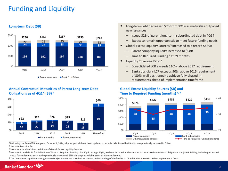 Basel 3 Transition (under Standardized approach) 2 • Common equity tier 1 capital (CET1) ratio was 12.3% in 4Q14 Basel 3 Fully Phased-in 3 • CET1 capital grew $6.2B from 3Q14, driven by earnings, deferred tax asset utilization and an improvement in AOCI • Under the fully phased-in Standardized approach, the estimated CET1 ratio increased to 10.0% in 4Q14 • Under the fully phased-in Advanced approaches 7, the estimated CET1 ratio was stable at 9.6% in 4Q14, despite Operational Risk RWA increasing to 34% of total RWA Supplementary Leverage Ratio (SLR) Fully Phased-in 4, 5 • Estimated bank holding company SLR is 5.9%, exceeding the 5% required minimum • Estimated primary bank subsidiary SLR is 7.0%, exceeding the 6% required minimum Regulatory Capital 1 5 ____________________ 1 Regulatory capital ratios are preliminary. For important presentation information, see slide 26. 2 On January 1, 2014, the Basel 3 rules became effective, subject to transition provisions primarily related to regulatory deductions and adjustments impacting CET1 capital and Tier 1 capital. 3 Represents a non-GAAP financial measure; see slide 23 for reconciliations. 4 The 5.0% Bank Holding Company SLR minimum includes the 2.0% leverage buffer. 5 The supplementary leverage ratio is based on estimates from our current understanding of recently finalized rules issued by banking regulators on September 3, 2014. The estimated ratio is measured using quarter-end tier 1 capital calculated under Basel 3 on a fully phased-in basis. The denominator is calculated as the daily average of the sum of on-balance sheet assets as well as the simple average of certain off-balance sheet exposures at the end of each month in the quarter, including, among other items, derivatives and securities financing transactions. 6 Ratio shown on a pro-forma basis for 3Q14 to reflect the October 1, 2014 merger of FIA Card Services, National Association (FIA) into Bank of America, National Association (BANA), our primary bank subsidiary. 7 Our estimates under the Basel 3 Advanced approaches may be refined over time as a result of further rulemaking or clarification by U.S. banking regulators or as our understanding and interpretation of the rules evolve. If our internal analytical models are not approved or are required to be revised, it would likely lead to an increase in our risk-weighted assets and negatively impact our capital ratios, which in some cases could be significant. Basel 3 Transition (under Standardized approach) 2 $ in billions Common equity tier 1 capital $155.4 $152.4 Risk-weighted assets 1,261.5 1,271.7 Common equity tier 1 capital ratio 12.3 % 12.0 % Tier 1 capital ratio 13.4 12.8 Tier 1 leverage ratio 8.2 7.9 Basel 3 Fully Phased-in $ in billions Common equity tier 1 capital 3 $141.3 $135.1 Risk-weighted assets (under Standardized approach) 3 1,415.4 1,418.2 Common equity tier 1 capital ratio (under Standardized ap roach) 3 10.0 % 9.5 % Bank Holding Company SLR 4, 5 5.9 ~ 5.5 Bank SLR 5, 6 7.0 ~ 6.8 4Q14 3Q14 4Q14 3Q14