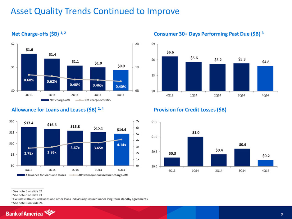 13.2 12.8 12.7 1.8 1.3 1.1 2.3 6.0 0.4 $17.3 $20.1 $14.2 $0 $5 $10 $15 $20 4Q13 3Q14 4Q14 All other LAS (excl. litigation) Litigation Expense Highlights ____________________ 1 Represents a non-GAAP financial measure; see note D on slide 24. 2 Represents a non-GAAP financial measure. For important presentation information, see slide 26. • Total noninterest expense of $14.2B decreased from both 3Q14 and 4Q13, due primarily to lower litigation expense and reduced Legacy Assets & Servicing (LAS) costs • Noninterest expense, excluding litigation 2, of $13.8B declined $0.3B from 3Q14, driven by progress made on LAS cost initiatives as well as lower revenue-related incentives in Global Markets – Compared to 4Q13, excluding litigation 2, noninterest expense declined $1.2B, or 8%, driven primarily by lower LAS expenses, as well as New BAC cost savings and, to a lesser degree, lower revenue-related incentives • FTE headcount was down 2.5% from 3Q14, due to declines across several businesses as well as continued reductions in LAS • Achieved target of $1.1B in quarterly LAS expenses, excluding litigation • Consistent with prior years, 1Q15 is expected to include annual costs associated with retirement-eligible compensation, which are expected to be approximately $1.0B Noninterest Expense ($B) Full-time Equivalent Employees (000's) 8 1 216.6 212.4 207.9 25.5 17.1 15.8 242.1 229.5 223.7 0 50 100 150 200 250 300 4Q13 3Q14 4Q14 FTEs (excluding LAS) LAS FTEs