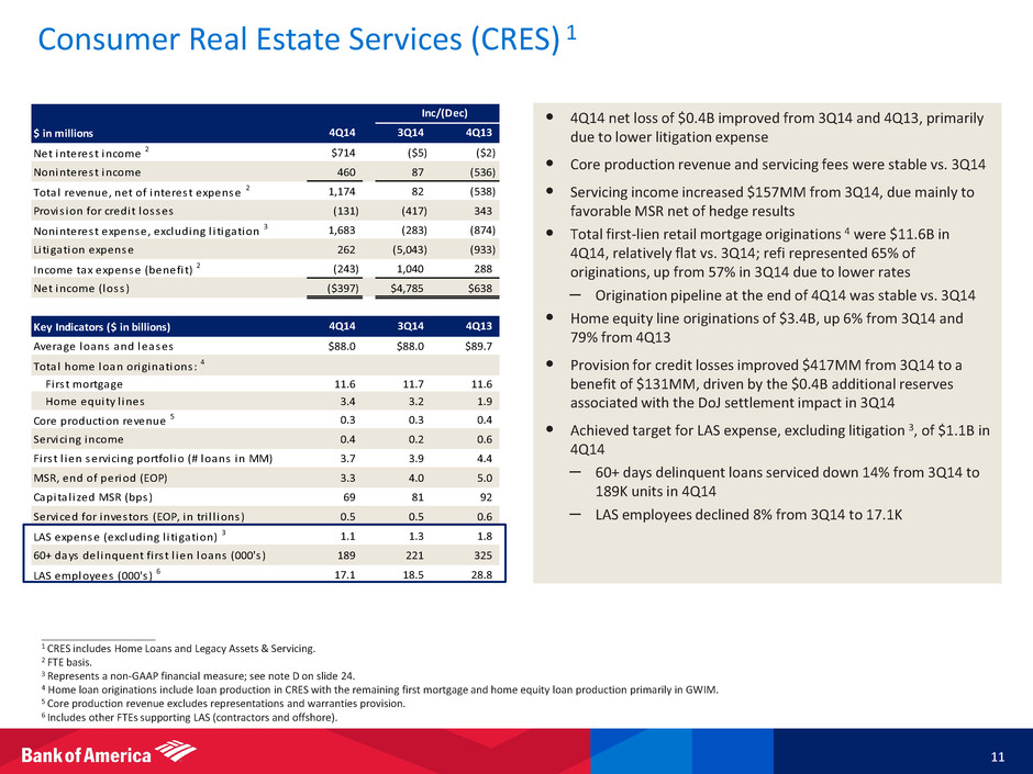 Consumer & Business Banking (CBB) 10 ____________________ 1 FTE basis. 2 Represents a non-GAAP financial measure. For important presentation information, see slide 26. 3 Total U.S. consumer credit card includes portfolios in CBB and GWIM. In 4Q14, 3Q14 and 4Q13, $3.2B, $3.2B and $3.3B of the U.S. consumer credit card portfolio was included in GWIM with the remaining in CBB. • [ Bullets to come ] • Net income of $1.8B, down from both comparative periods, due largely to less reserve release as well as a higher tax rate – Reserve release of $0.1B, $0.2B and $0.5B in 4Q14, 3Q14 and 4Q13, respectively; net charge-offs flat from 3Q14 and down $0.2B from 4Q13 • Noninterest income improved from both comparative periods driven primarily by higher card income • Customer activity highlights: – Average deposit growth of $5B from 3Q14 and $22B, or 4%, from 4Q13 Rate paid on deposits declined to 5 bps in 4Q14 – Issued nearly 1.2MM new total U.S. consumer credit cards, 67% to existing customers – Client brokerage assets increased to $114B in 4Q14, up $5B from 3Q14, driven by new accounts, strong account flows and market valuations – Strong early momentum in Preferred Rewards (nationwide rollout in Sep. 2014) with 1.2MM clients enrolled – Mobile banking users of 16.5MM; 12% of deposit transactions completed through mobile devices – Banking centers reduced to 4,855, down 92 from 3Q14 and 296 from 4Q13 $ in millions Net interest income 1 $4,853 ($99) ($94) Noninterest income 2,688 128 139 Total revenue, net of interest expense 1 7,541 29 45 Provis ion for credit losses 670 53 243 Noninterest expense 4,015 43 14 Income tax expense 1 1,098 36 22 Net income $1,758 ($103) ($234) Key Indicators ($ in billions) Average depos its $550.4 $545.1 $528.7 Rate paid on depos its 0.05 % 0.06 % 0.08 % Average loans and leases $161.3 $160.9 $163.2 Cl ient brokerage assets 113.8 108.5 96.0 Debit card purchase volumes 69.2 68.0 68.0 Mobi le banking customers (MM) 16.5 16.1 14.4 Number of banking centers 4,855 4,947 5,151 Return on average a l located capita l 2 24 % 25 % 26 % Al located capita l 2 $29.5 $29.5 $30.0 Total U.S. consumer credit card 3 ($ in billions) Average outstandings $89.4 $88.9 $90.1 Credit card purchase volumes 55.9 53.8 54.5 New card accounts (MM) 1.18 1.20 1.00 Net charge-off ratio 2.71 % 2.79 % 3.19 % Risk-adjusted margin 9.96 9.33 9.11 4Q14 3Q14 4Q13 Inc/(Dec) 4Q14 3Q14 4Q13 4Q14 3Q14 4Q13