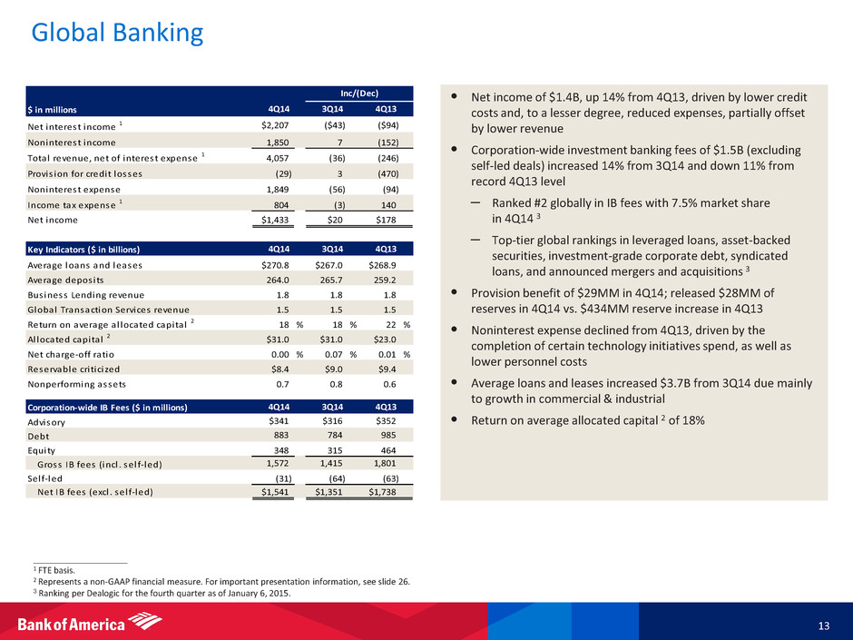 1,181 1,190 1,229 1,209 1,221 821 842 879 888 903 245 244 237 239 245 119 120 123 126 129 $2,366 $2,396 $2,468 $2,462 $2,498 $500 $1,000 $1,500 $2,000 $2,500 4Q13 1Q14 2Q14 3Q14 4Q14 Other client balances Assets under management Client deposits Loans and leases Global Wealth & Investment Management (GWIM) 12 ____________________ 1 FTE basis. 2 Includes Financial Advisors in CBB of 1,950, 1,868 and 1,545 at 4Q14, 3Q14 and 4Q13, respectively. 3 See note M on slide 24 for definition of Financial Advisor Productivity. 4 Represents a non-GAAP financial measure. For important presentation information, see slide 26. 5 Includes margin receivables which are classified in customer and other receivables on the Consolidated Balance Sheet. Total Client Balances ($B, EOP) • Solid fourth quarter results included revenue of $4.6B and net income of $0.7B • Record asset management fees were offset by lower transactional activity vs. 3Q14 • Noninterest expense increased from 4Q13, reflecting higher revenue-related incentives and increased support costs • Client balances of nearly $2.5T, up $36B from 3Q14, driven by strong net flows – Long-term AUM flows of $9B, positive for the 22nd consecutive quarter – Record period-end loans of $129B, up $3B from 3Q14 and $10B, or 8%, from 4Q13 – Period-end deposits of $245B, up $7B from 3Q14 $ in millions Net interest income 1 $1,407 ($52) ($78) Noninterest income 3,195 (12) 201 Total revenue, net of interest expense 1 4,602 (64) 123 Provis ion for credit losses 14 29 (12) Noninterest expense 3,440 37 178 Income tax expense 1 442 (23) 29 Net income $706 ($107) ($72) Key Indicators ($ in billions) Long-term AUM flows $9.4 $11.2 $9.4 Liquidi ty AUM flows (0.3) 5.9 6.5 Financia l Advisors (in thousands) 2 16.0 15.9 15.3 Financia l Advisor Productivi ty ($ in MM) 3 $1.07 $1.08 $1.04 Wealth Advisors (in thousands) 2 17.2 17.0 16.5 Pre-tax margin 25 % 27 % 27 % Return on average a l located capita l 4 23 27 31 Al located capita l 4 $12.0 $12.0 $10.0 Inc/(Dec) 4Q14 3Q14 4Q13 4Q14 3Q14 4Q13 5