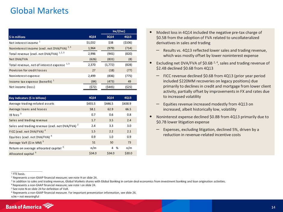 Global Banking 13 ____________________ 1 FTE basis. 2 Represents a non-GAAP financial measure. For important presentation information, see slide 26. 3 Ranking per Dealogic for the fourth quarter as of January 6, 2015. • [ Bullets to come ] • Net income of $1.4B, up 14% from 4Q13, driven by lower credit costs and, to a lesser degree, reduced expenses, partially offset by lower revenue • Corporation-wide investment banking fees of $1.5B (excluding self-led deals) increased 14% from 3Q14 and down 11% from record 4Q13 level – Ranked #2 globally in IB fees with 7.5% market share in 4Q14 3 – Top-tier global rankings in leveraged loans, asset-backed securities, investment-grade corporate debt, syndicated loans, and announced mergers and acquisitions 3 • Provision benefit of $29MM in 4Q14; released $28MM of reserves in 4Q14 vs. $434MM reserve increase in 4Q13 • Noninterest expense declined from 4Q13, driven by the completion of certain technology initiatives spend, as well as lower personnel costs • Average loans and leases increased $3.7B from 3Q14 due mainly to growth in commercial & industrial • Return on average allocated capital 2 of 18% $ in millions Net interest income 1 $2,207 ($43) ($94) Noninterest income 1,850 7 (152) Total revenue, net of interest expense 1 4,057 (36) (246) Provis ion for credit losses (29) 3 (470) Noninterest expense 1,849 (56) (94) Income tax expense 1 804 (3) 140 Net income $1,433 $20 $178 Key Indicators ($ in billions) Average loans and leases $270.8 $267.0 $268.9 Average depos its 264.0 265.7 259.2 Bus iness Lending revenue 1.8 1.8 1.8 Global Transaction Services revenue 1.5 1.5 1.5 Return on average a l located capita l 2 18 % 18 % 22 % Al located capita l 2 $31.0 $31.0 $23.0 Net charge-off ratio 0.00 % 0.07 % 0.01 % Reservable cri ticized $8.4 $9.0 $9.4 Nonperforming assets 0.7 0.8 0.6 Corporation-wide IB Fees ($ in millions) Advisory $341 $316 $352 Debt 883 784 985 Equity 348 315 464 Gross IB fees (incl . sel f-led) 1,572 1,415 1,801 Sel f-led (31) (64) (63) Net IB fees (excl . sel f-led) $1,541 $1,351 $1,738 4Q14 3Q14 4Q13 Inc/(Dec) 3Q14 4Q134Q14 4Q14 3Q14 4Q13
