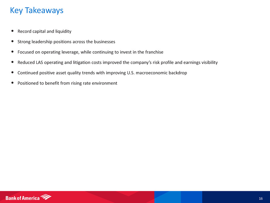 • Net loss of $0.4B as results declined from both comparative periods • Total revenue decreased $1.3B from 4Q13 – Net interest income decline was due primarily to negative market-related adjustments driven by the acceleration of bond premium amortization on debt securities – Noninterest income decline was driven by lower equity investment income and debt securities gains of $0.7B, partially offset by a $0.2B increase from gains on sales of nonperforming and certain other loans • Revenue was impacted by the following selected items: • Provision benefit increased $144MM from 4Q13, driven primarily by recoveries on the sale of nonperforming loans as well as other recoveries • Noninterest expense decreased $0.6B from 4Q13, due to lower litigation expense and infrastructure support costs $ in millions Equity investment income (loss) ($77) ($52) $393 Gains on sales of debt securities 162 410 363 U.K. payment protection insurance provision 3 (139) (298) (163) 4Q14 3Q14 4Q13 ____________________ 1 All Other consists of ALM activities, equity investments, the international consumer card business, liquidating businesses, residual expense allocations and other. ALM activities encompass the whole- loan residential mortgage portfolio and investment securities, interest rate and foreign currency risk management activities including the residual net interest income allocation, the impact of certain allocation methodologies and accounting hedge ineffectiveness. The results of certain ALM activities are allocated to our business segments. Equity investments include Global Principal Investments and certain other investments. Additionally, All Other includes certain residential mortgage loans that are managed by LAS. 2 FTE basis. 3 In the U.K., we previously sold payment protection insurance through our international card services business to credit card and consumer loan customers. 15 All Other 1 $ in millions Net interest income 2 ($348) ($418) ($760) Noninterest income (441) (300) (542) Total revenue, net of interest expense 2 (789) (718) (1,302) Provis ion for credit losses (332) (67) (144) Noninterest expense 448 192 (627) Income tax expense (benefi t) 2 (527) 25 343 Net income (loss ) ($378) ($868) ($874) Key Indicators ($ in billions) Average loans and leases $183.1 $199.4 $226.0 Average depos its 21.5 29.3 34.3 Book va lue of Global Principal Investments 0.9 1.0 1.6 Total BAC equity invest ent xp sure 11.7 11.4 12.4 Inc/(Dec) 3Q14 4Q13 4Q14 3Q14 4Q13 4Q14