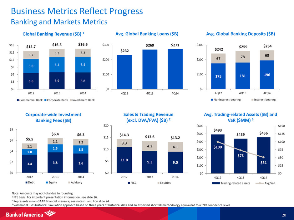 Business Metrics Reflect Progress Consumer Metrics 19 Avg. Consumer and Business Banking Deposits ($B) and Rate Paid (bps) Mobile Banking Active Accounts (units in MM) Banking Centers 5,478 5,151 4,855 3,000 4,000 5,000 6,000 4Q12 4Q13 4Q14 $76 $96 $114 $0 $20 $40 $60 $80 $100 $120 4Q12 4Q13 4Q14 $484 $529 $550 16 8 5 0 5 10 15 20 25 $0 $100 $200 $300 $400 $500 $600 4Q12 4Q13 4Q14 Average deposits Rate paid on deposits (bps) 837 999 1,184 60% 61% 67% 0% 25% 50% 75% 100% 0 200 400 600 800 1,000 1,200 1,400 4Q12 4Q13 4Q14 New card issuance % w/existing relationship 12.0 14.4 16.5 4% 9% 12% 0% 5% 10% 15% 20% 0 5 10 15 20 4Q12 4Q13 4Q14 Mobile banking active accounts Mobile % of total deposit transactions 1,079 1,181 1,221 698 821 903 266 245 245 109 119 129 $2,152 $2,366 $2,498 $500 $1,000 $1,500 $2,000 $2,500 4Q12 4Q13 4Q14 Other client balances Assets under management Client deposits Loans and leases Merrill Edge Brokerage Assets ($B) Total U.S. Consumer New Card Issuance (units in 000’s) GWIM Client Balances ($B) 1 ____________________ 1 Loans and leases include margin receivables which are classified in customer and other receivables on the Consolidated Balance Sheet.
